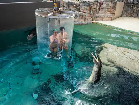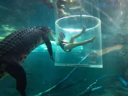 Here’s the scoop: you climb into a transparent acrylic cage, which is then lowered into a saltwater pool. There, within a safe enclosure, you come face‑to‑face with massive saltwater crocodiles stretching over five metres long.