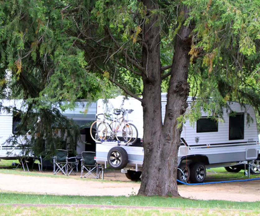 Facilities include a camp kitchen, laundry, BBQ areas, playground, and shaded outdoor areas. Amenities blocks with showers and toilets are also available.