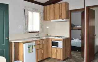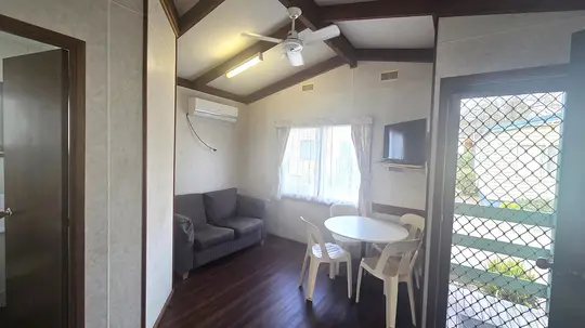 Ideal for small families or groups, this self-contained two-bedroom cabin sleeps up to five guests with one double bed and a set of bunk beds. The compact kitchen includes a gas stovetop, microwave, and bar fridge, while the living area offers a TV and fan. Heating ensures comfort, and parking is conveniently located beside the cabin.
