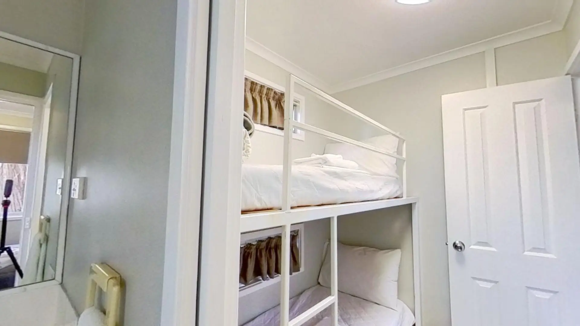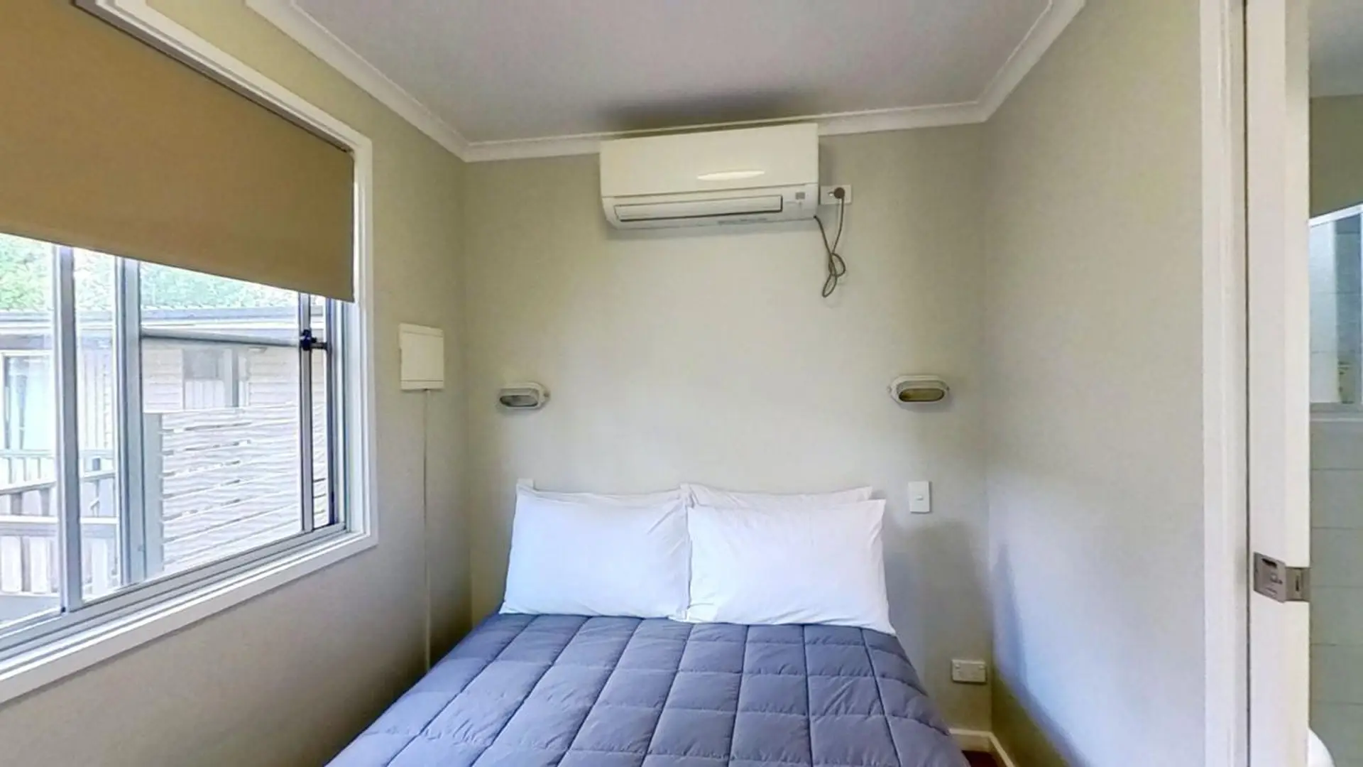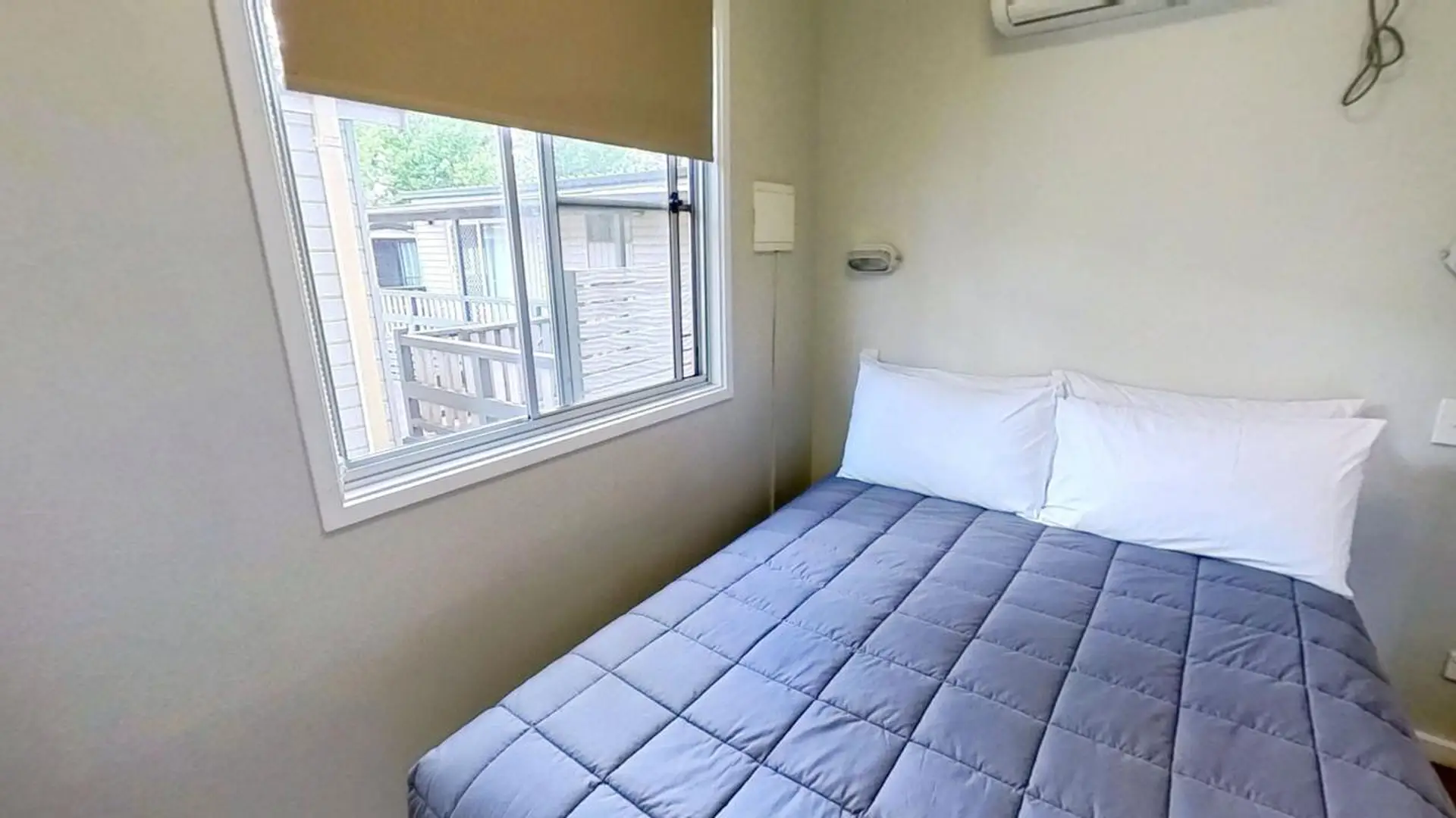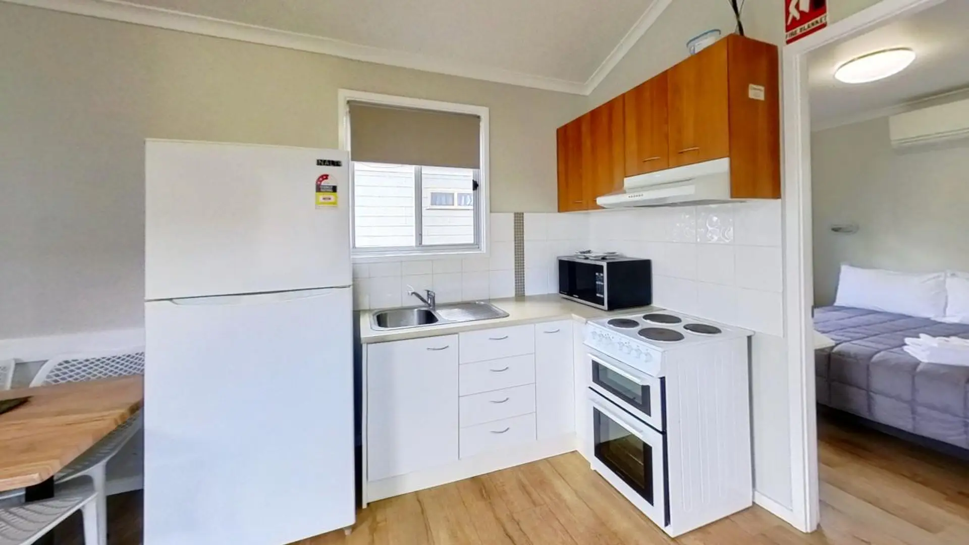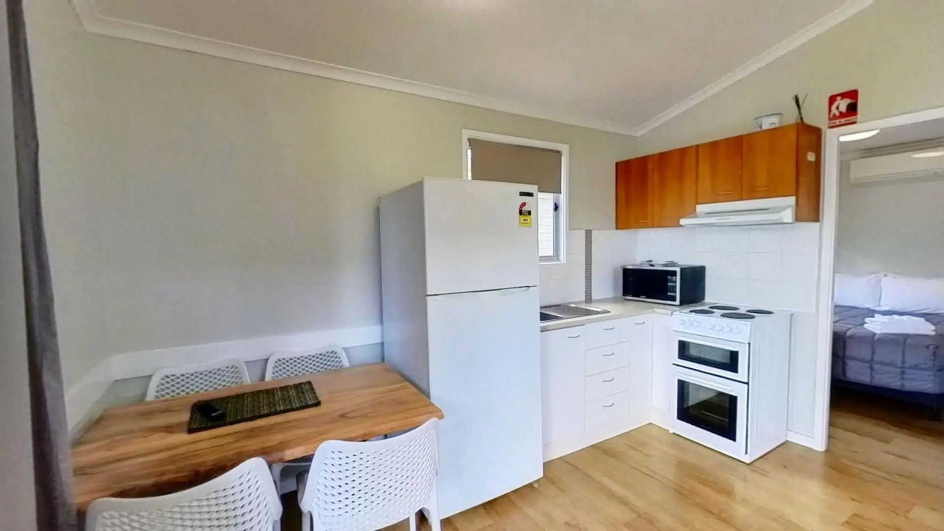 This one-bedroom cabin sleeps up to four guests with a double bed and single bunks. It features an open-plan living, dining, and kitchen area with gas oven, stovetop, microwave, and full-size fridge. Air conditioning, TV, and outdoor setting provide comfort and convenience for families or small groups.