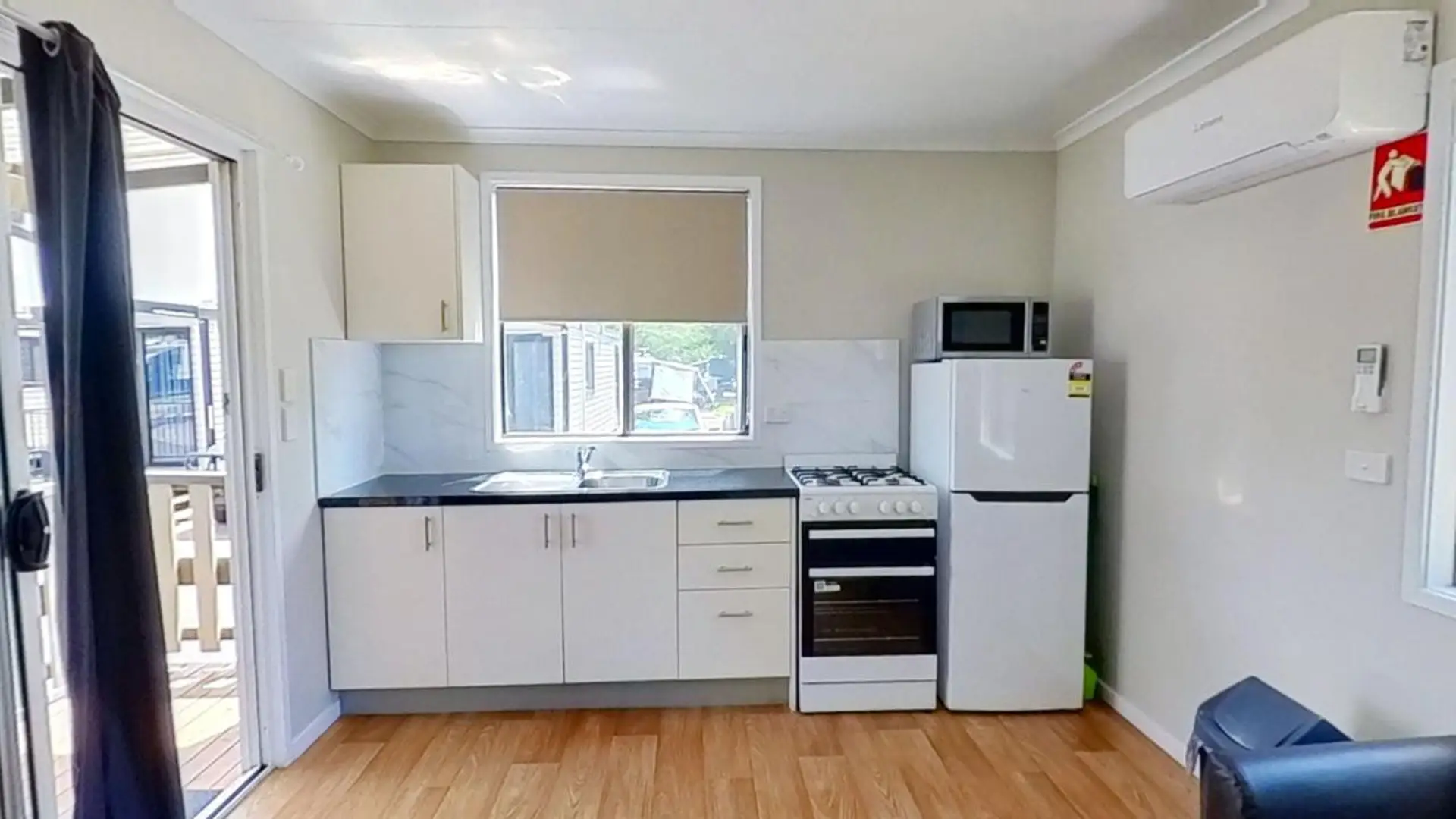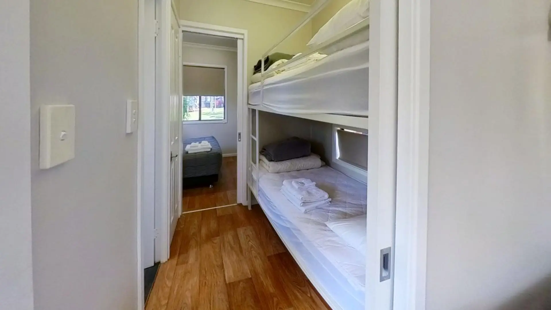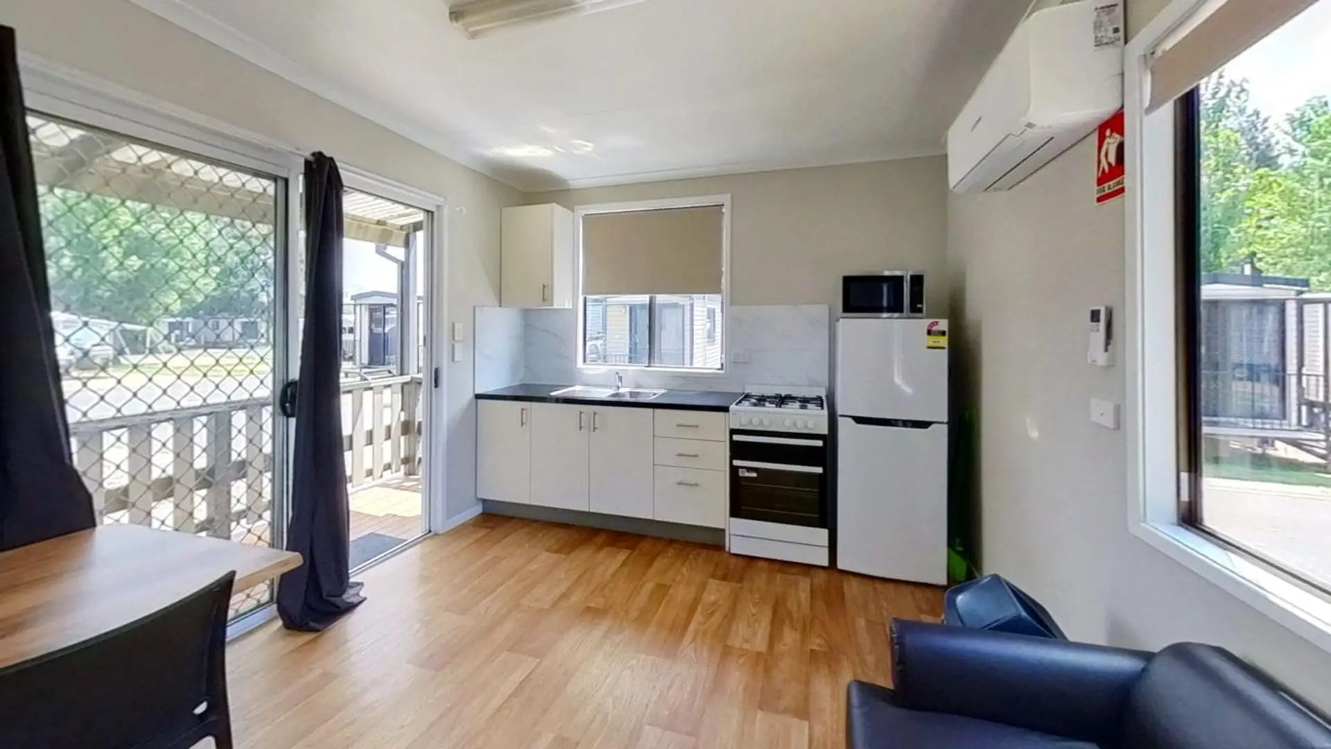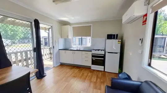 This pet-friendly one-bedroom cabin comfortably sleeps up to four guests with a double bed and single bunks. Fully self-contained, it includes a kitchen with gas oven, stovetop, microwave, and full-size fridge. Air conditioning, TV, and a spacious gated deck with outdoor setting complete the setup for a relaxed stay.