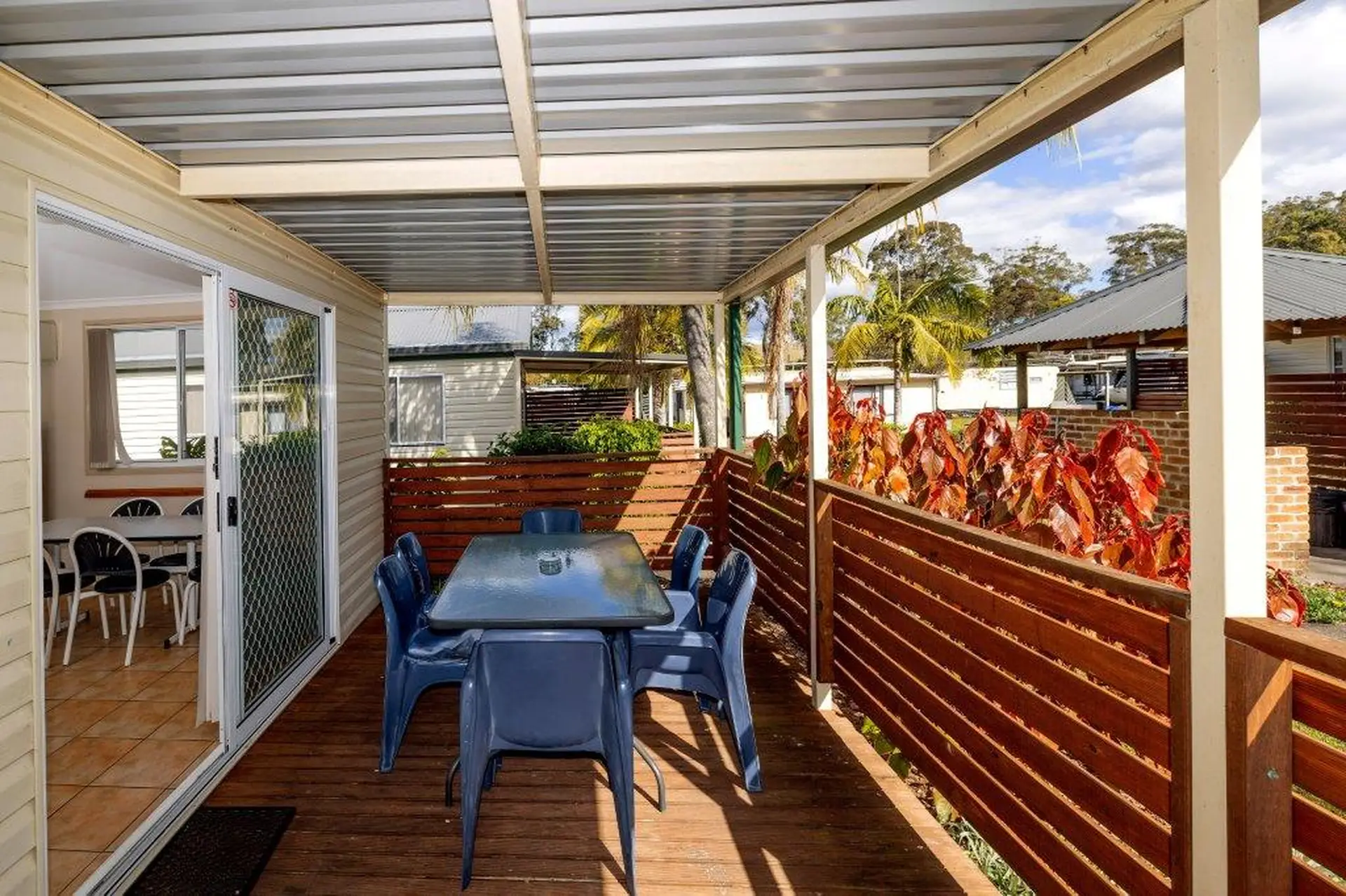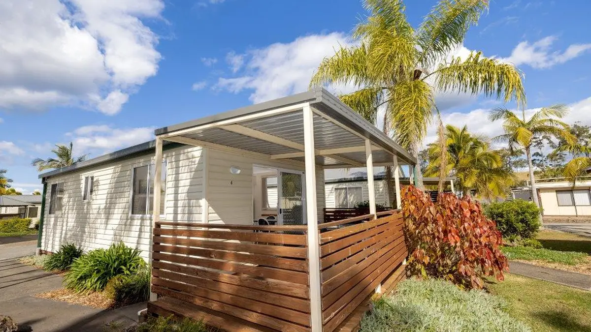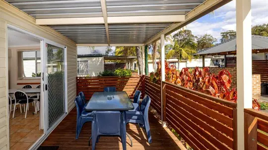 Comfortable and practical, this two-bedroom cabin sleeps up to five with a queen bed and a double/single bunk. A handy kitchen, open living area with TV, and dining space offer everyday convenience. Enjoy reverse cycle air-conditioning, a private bathroom, and a covered deck with outdoor seating—ideal for relaxed moments. It’s a cosy, value-packed base for families or small groups.