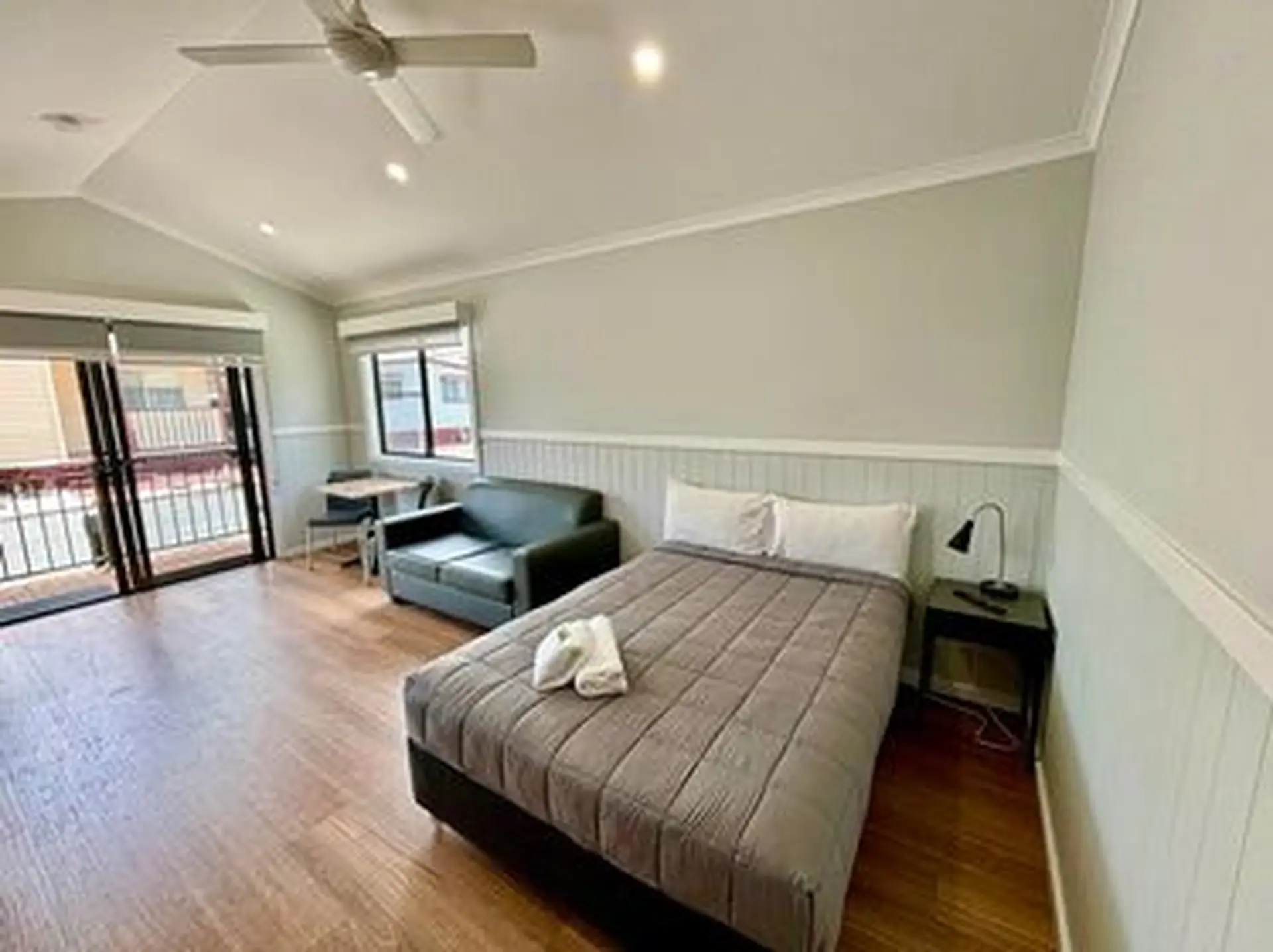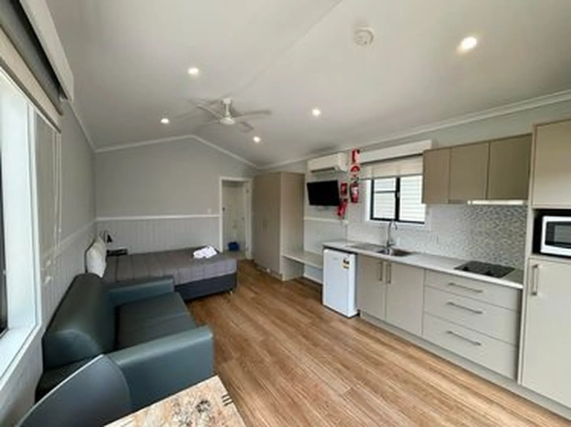 This open-plan studio sleeps two guests in a double bed. The modern kitchen features an electric stovetop, microwave, and full-size fridge. The air-conditioned living and dining area offers an ideal space for relaxing or dining indoors.