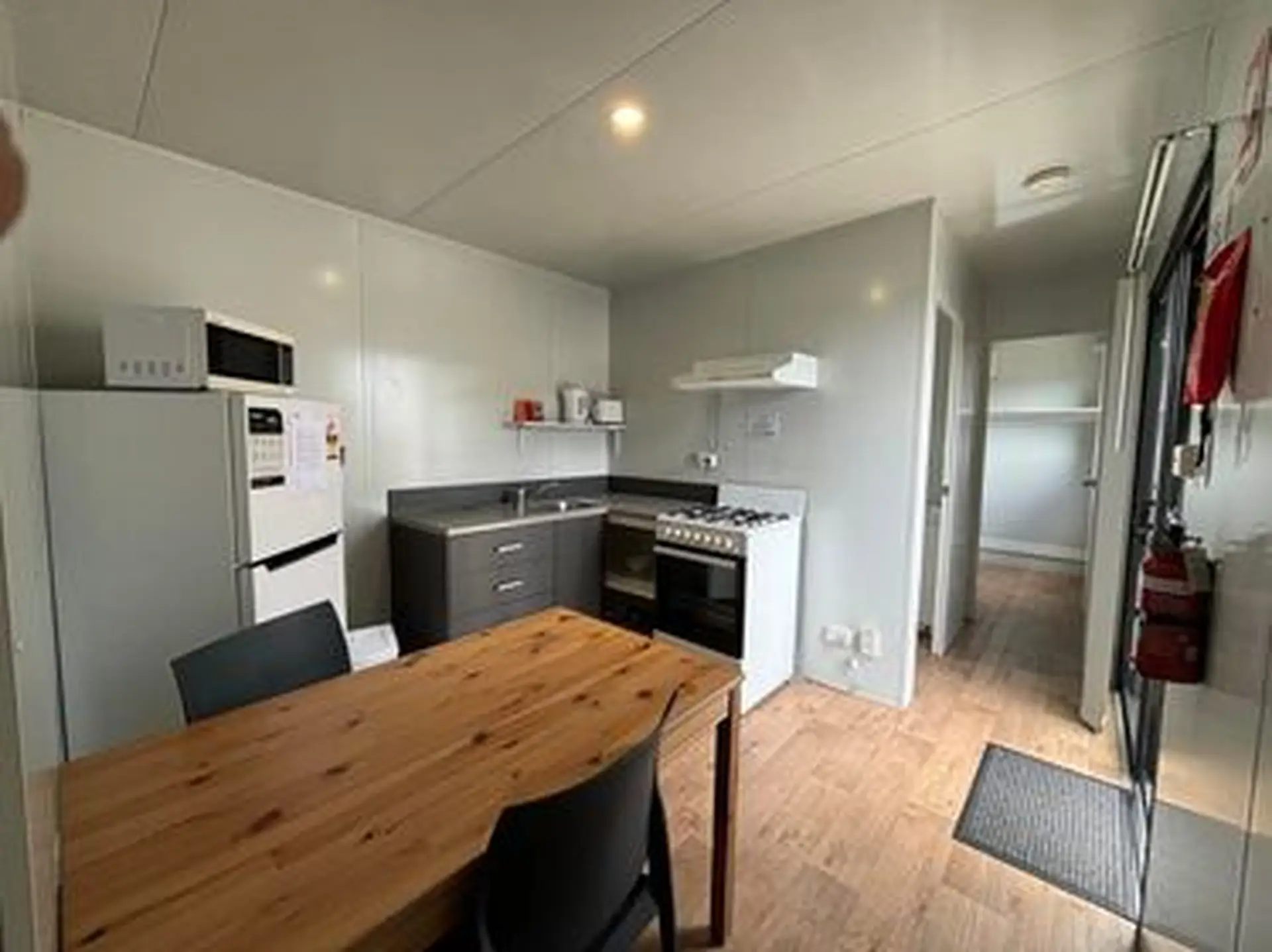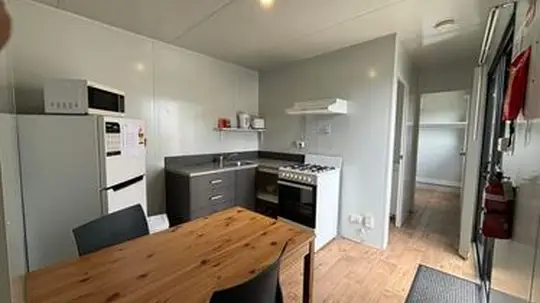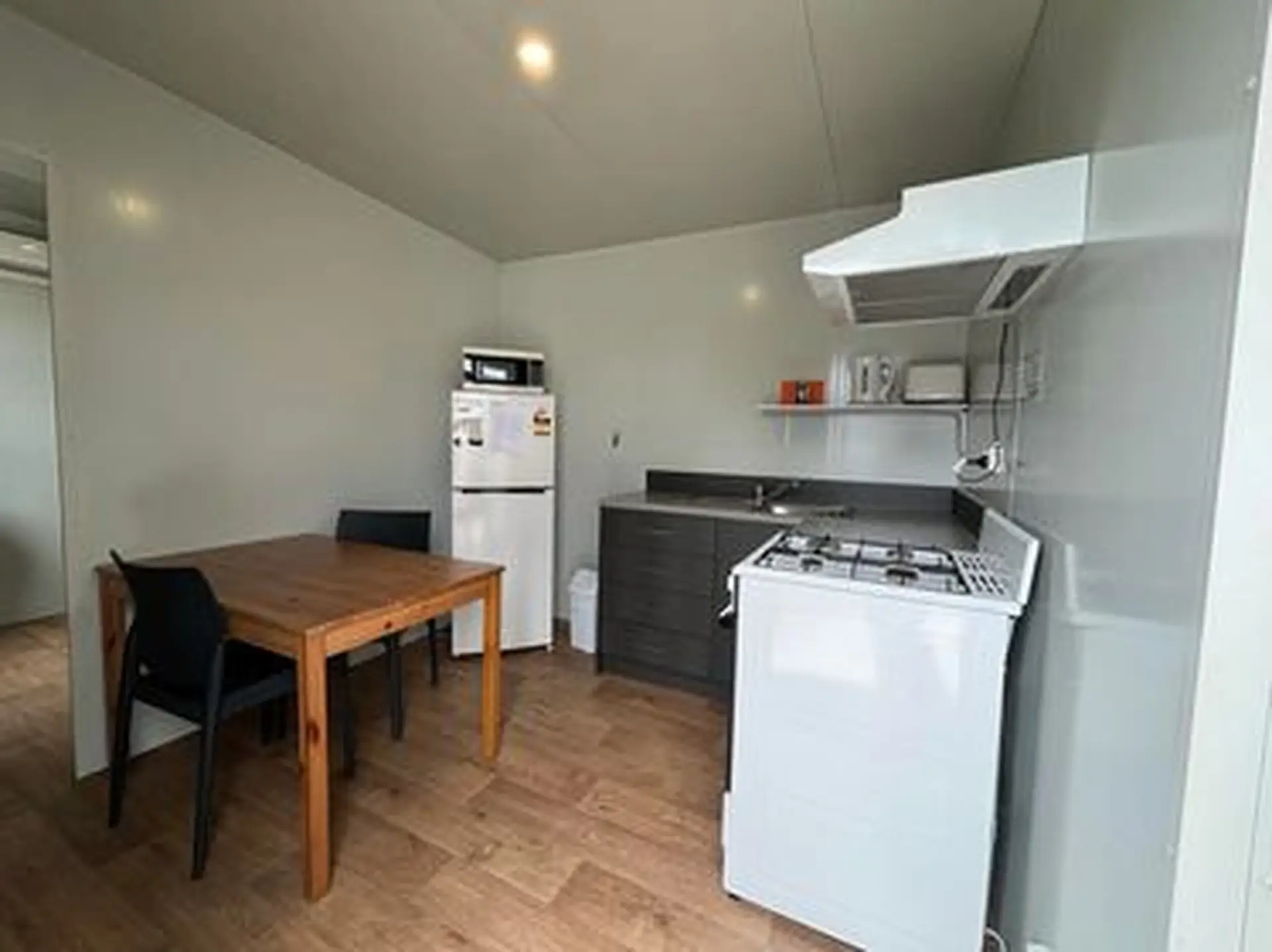 This one-bedroom cabin sleeps two guests in a double bed and features a separate lounge area, both with air-conditioning. The full kitchen includes a gas oven, gas stovetop, microwave, and full-size fridge. The kitchen and dining area offers a comfortable space for dining indoors.