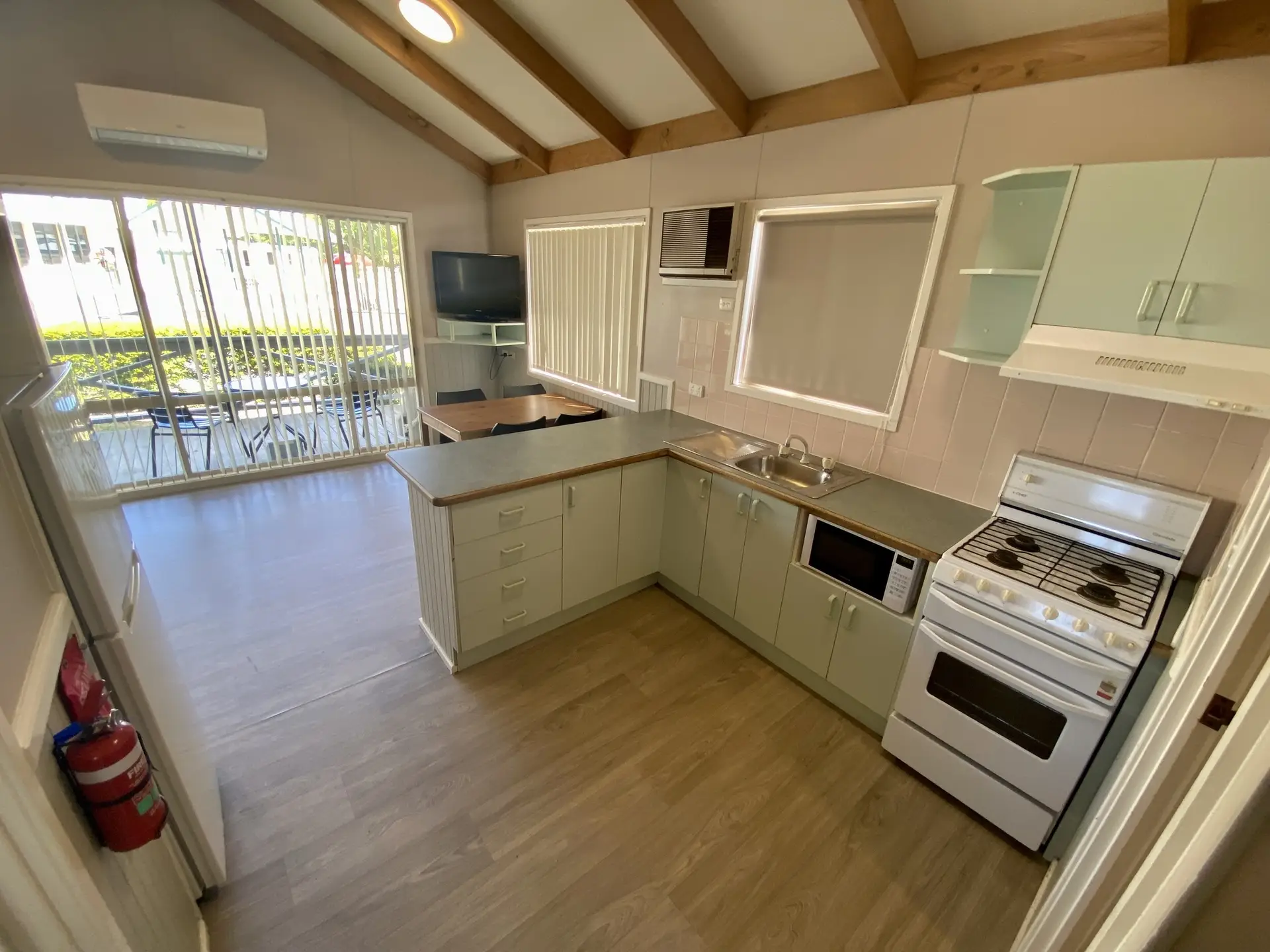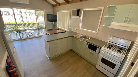 This poolside villa sleeps up to four guests with one double bed and two single beds across two bedrooms. It features a full kitchen with electric oven, gas stovetop, microwave, and full-size fridge. The air-conditioned living and dining area opens onto a covered deck, providing a comfortable space to relax near the pool.