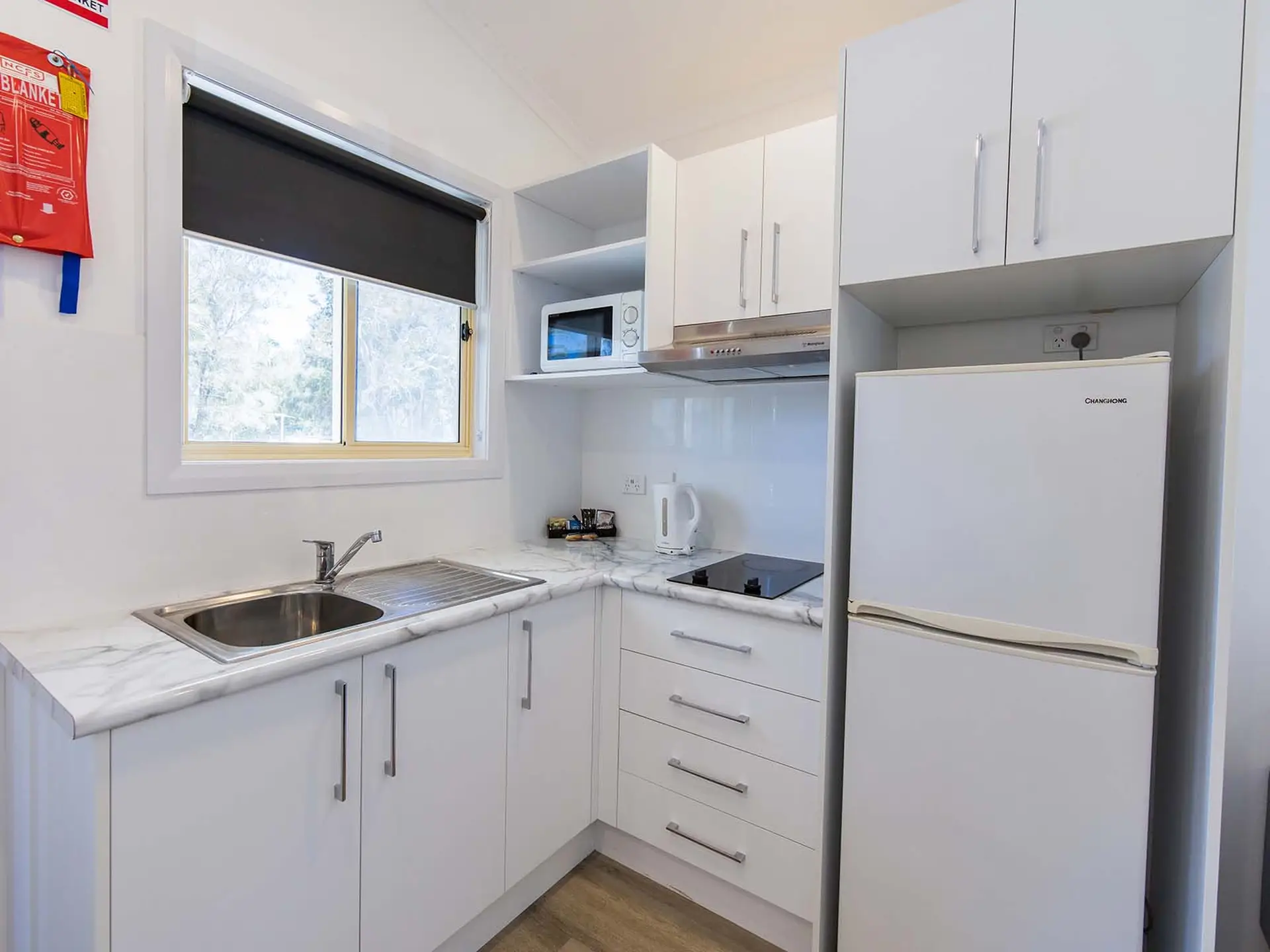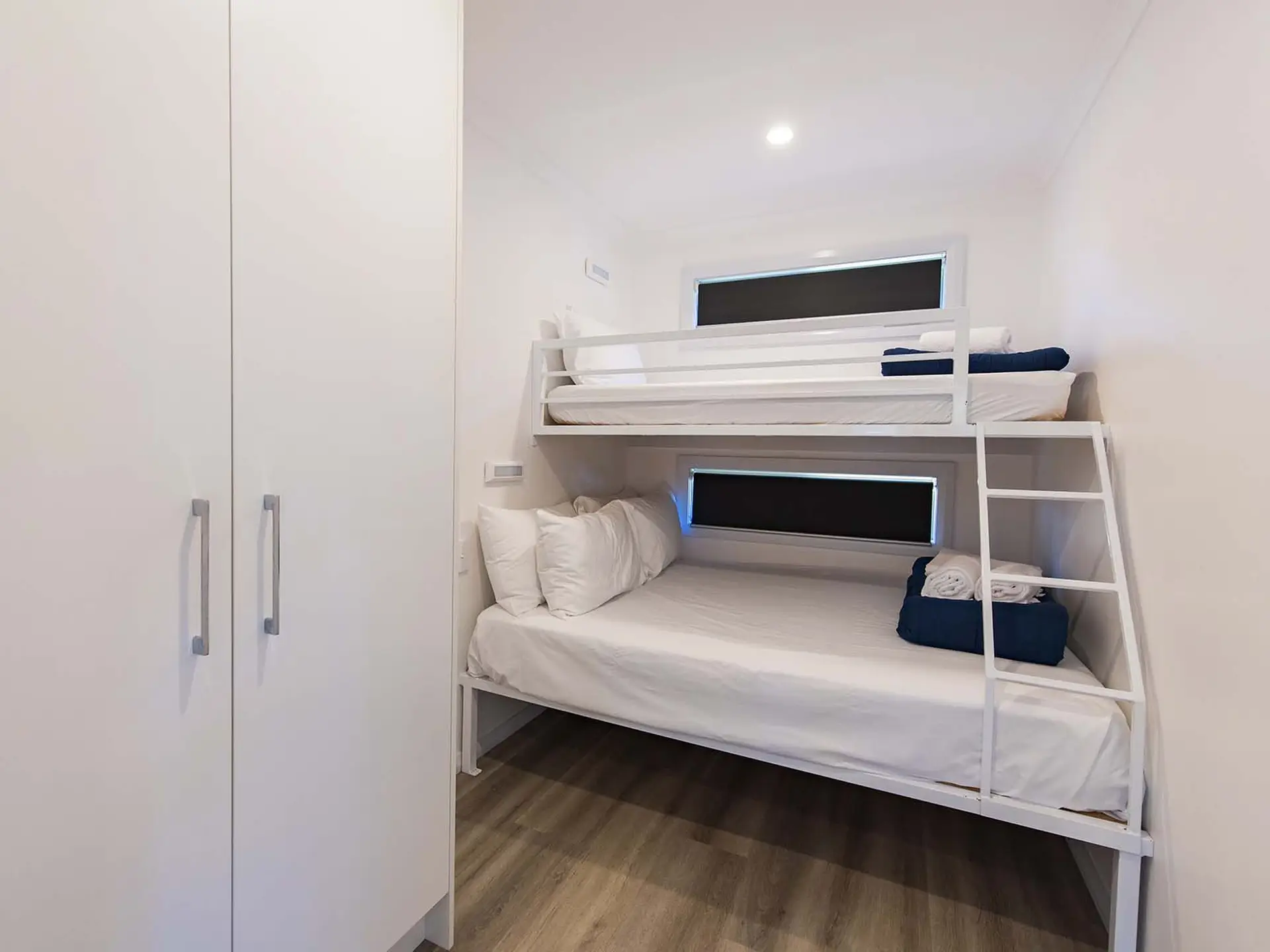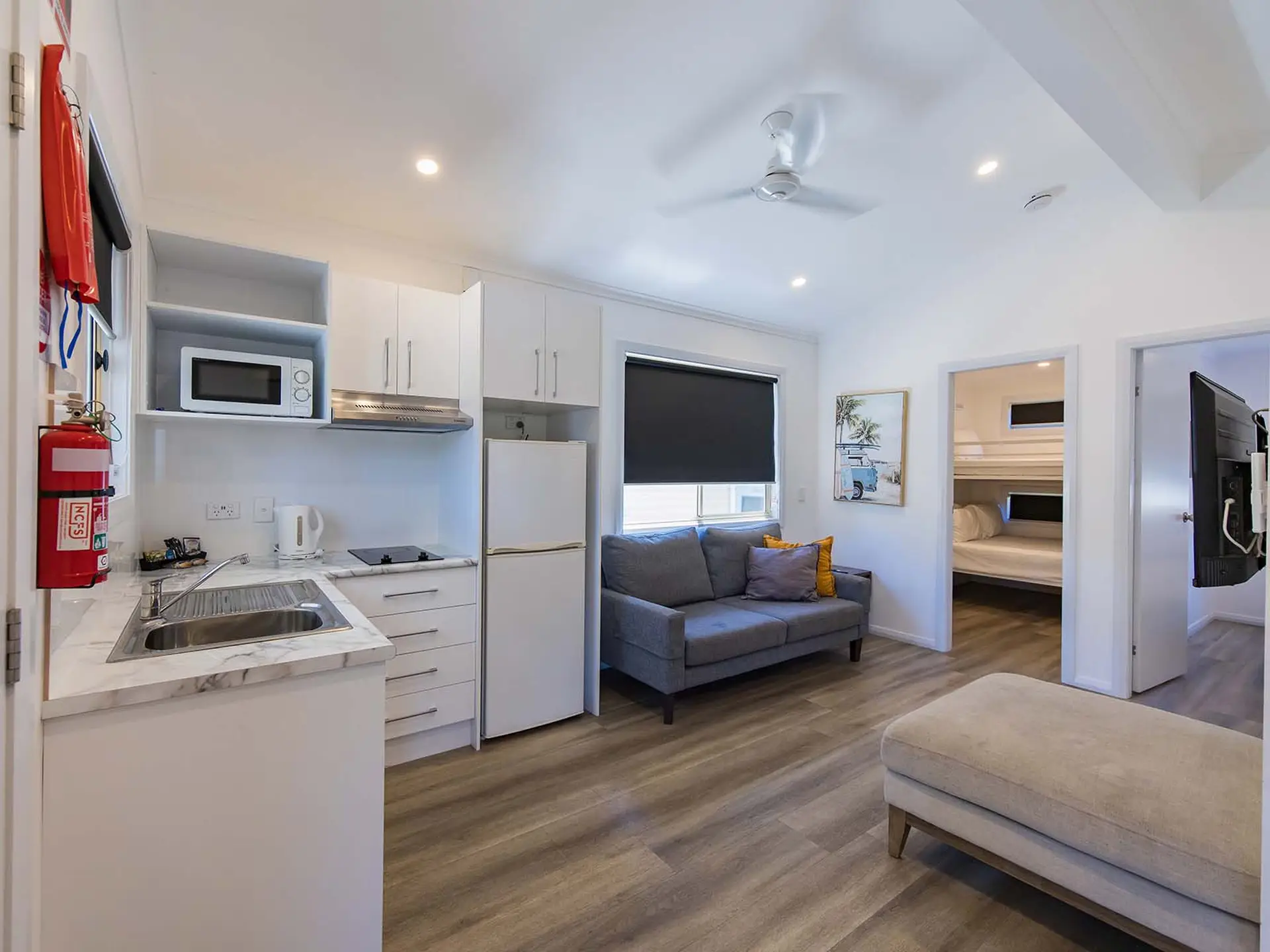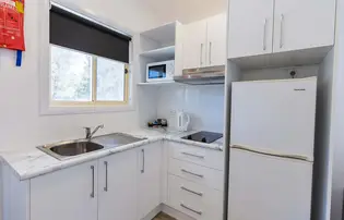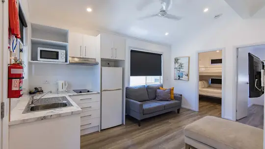 Positioned opposite the camp kitchen, this elevated cabin sleeps up to five with a queen bed and a tri-bunk. Ideal for families on a budget, it includes a simple kitchen with a cooktop, microwave, and fridge. Air-conditioned for comfort, the open living area leads to an outdoor setting with a BBQ table—perfect for relaxed meals. Please note: the cabin is accessed via steep steps leading up to the balcony.