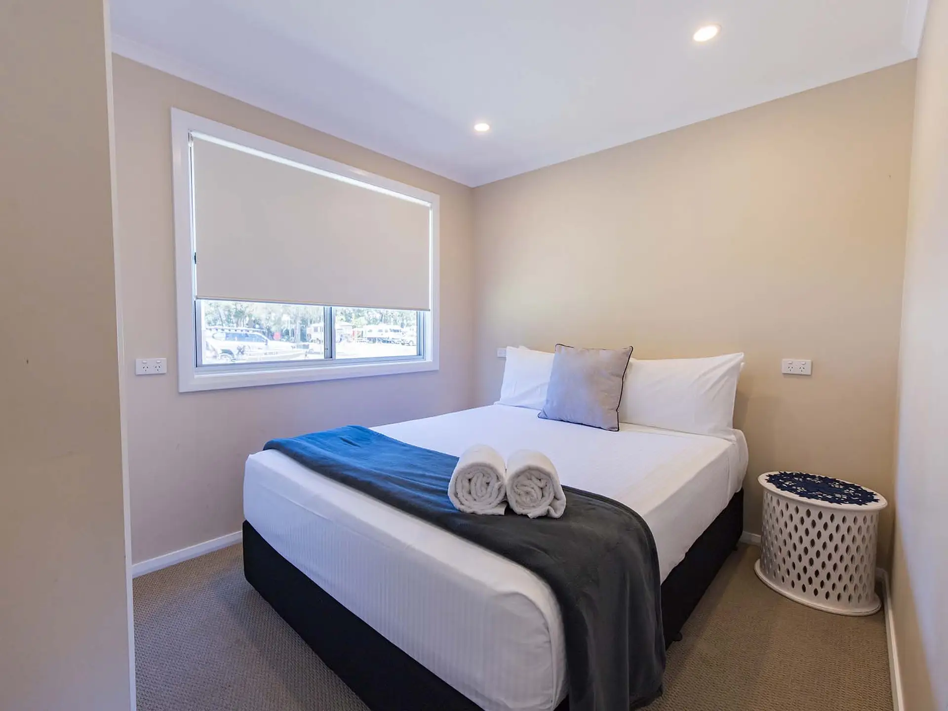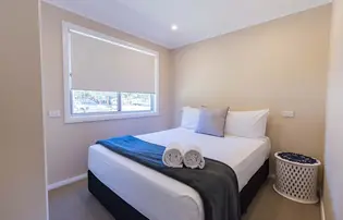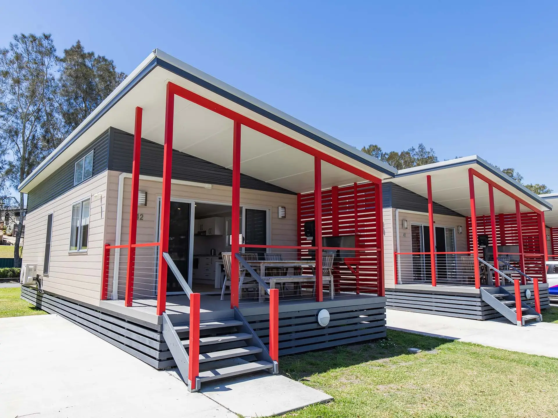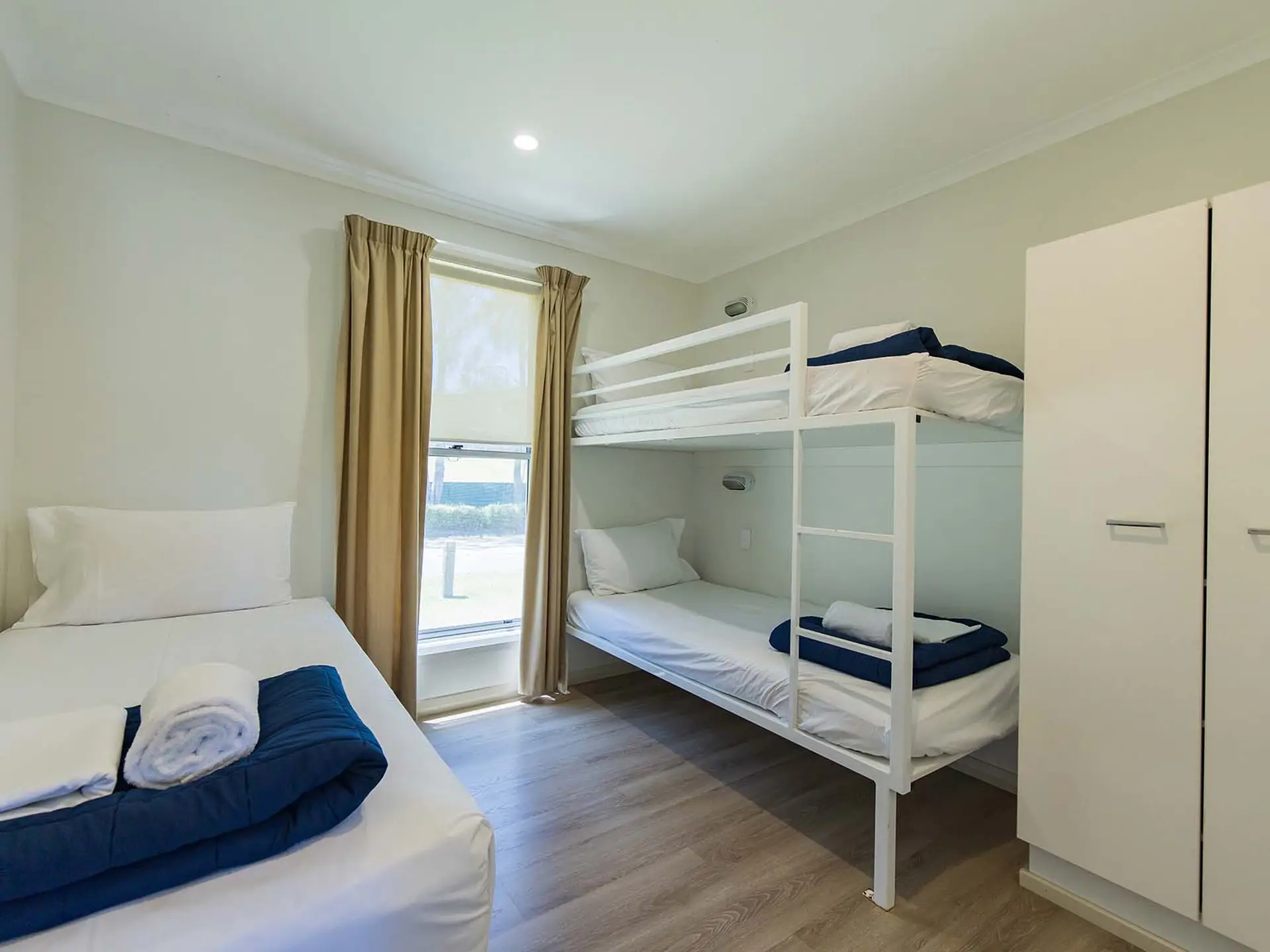 Just steps from the pool, this two-bedroom cabin sleeps five with a queen bed, a single bed, and a bunk bed. It features a full kitchen with a cooktop, microwave, dishwasher, and fridge. The air-conditioned living area opens onto a private deck with a BBQ—perfect for easy outdoor dining.