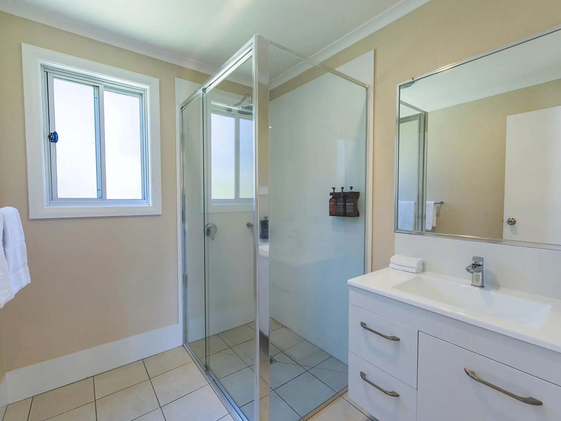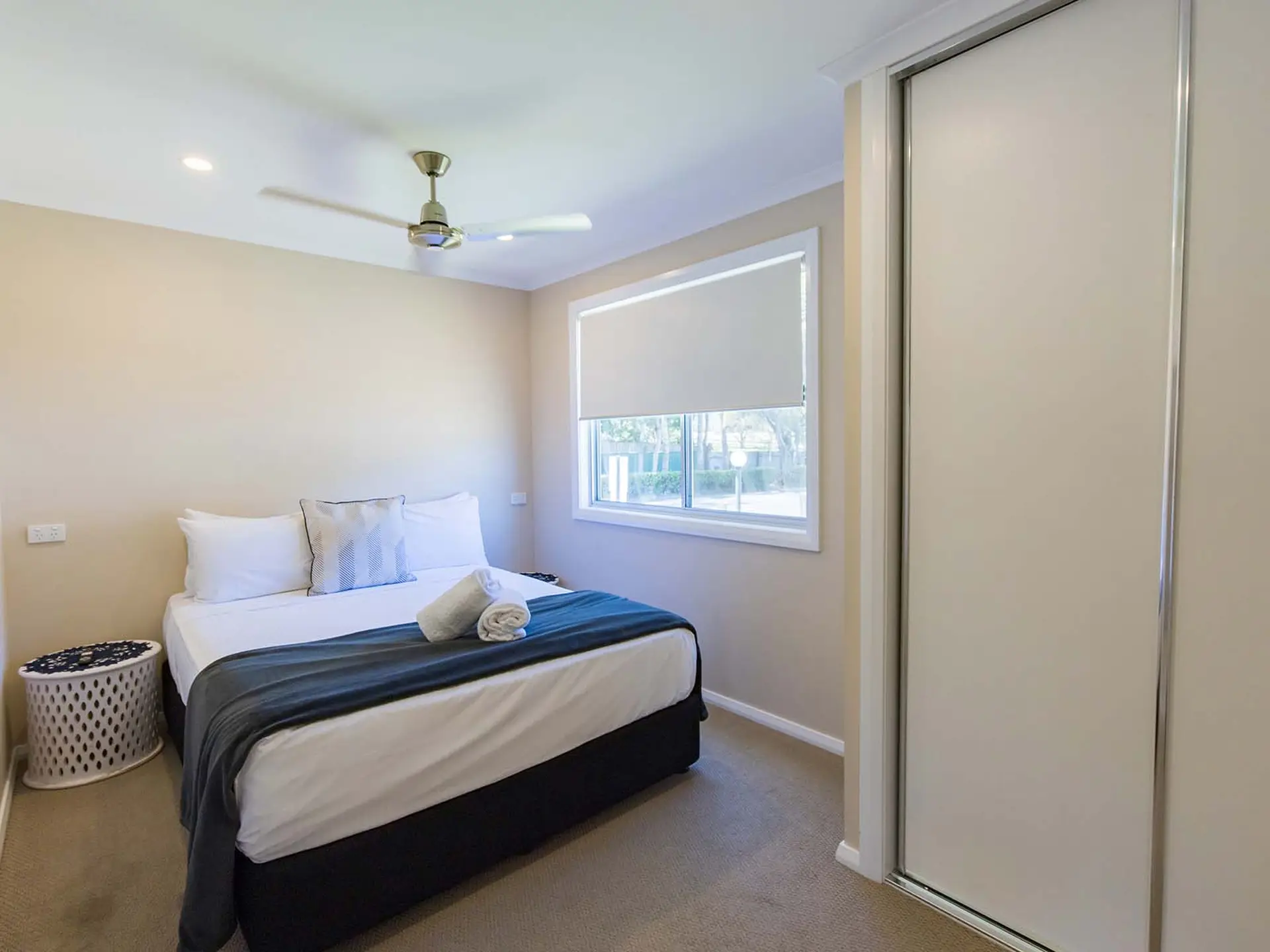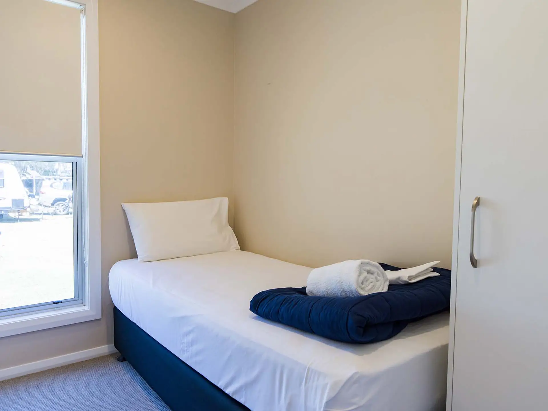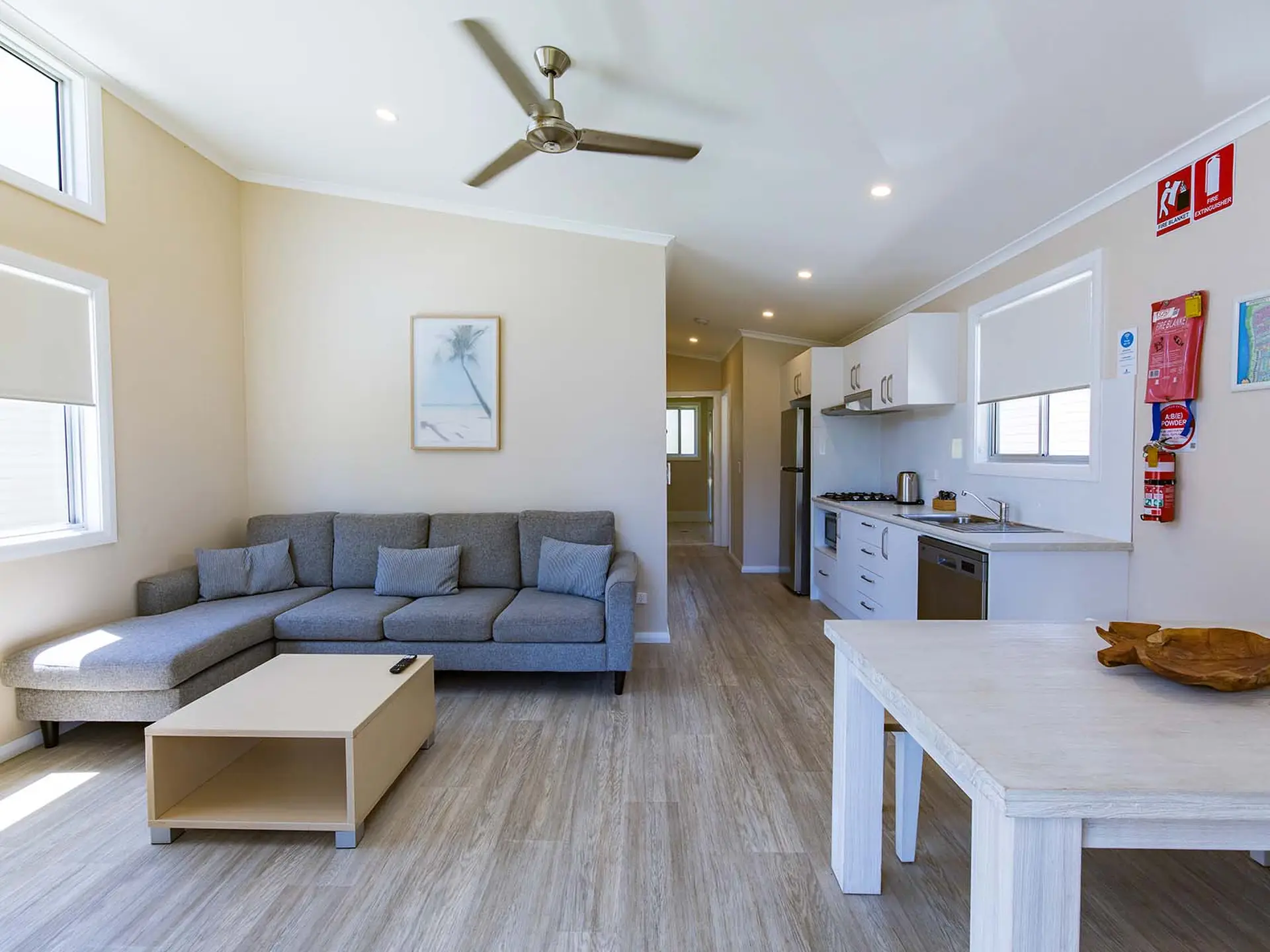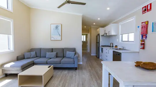 This three-bedroom villa comfortably sleeps five guests, offering one double bed, one queen bed, and a single bed. It includes a modern bathroom and a spacious open-plan living area that opens onto a private deck with a BBQ—perfect for outdoor dining. The full kitchen is equipped with a electric oven, stovetop, dishwasher, and fridge, while air conditioning ensures comfort. Please note: There are two of this cabin type, but only one is accessibility-friendly, offering easier entry and added convenience for guests with mobility needs.