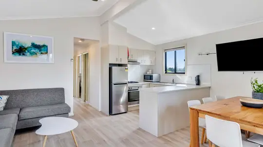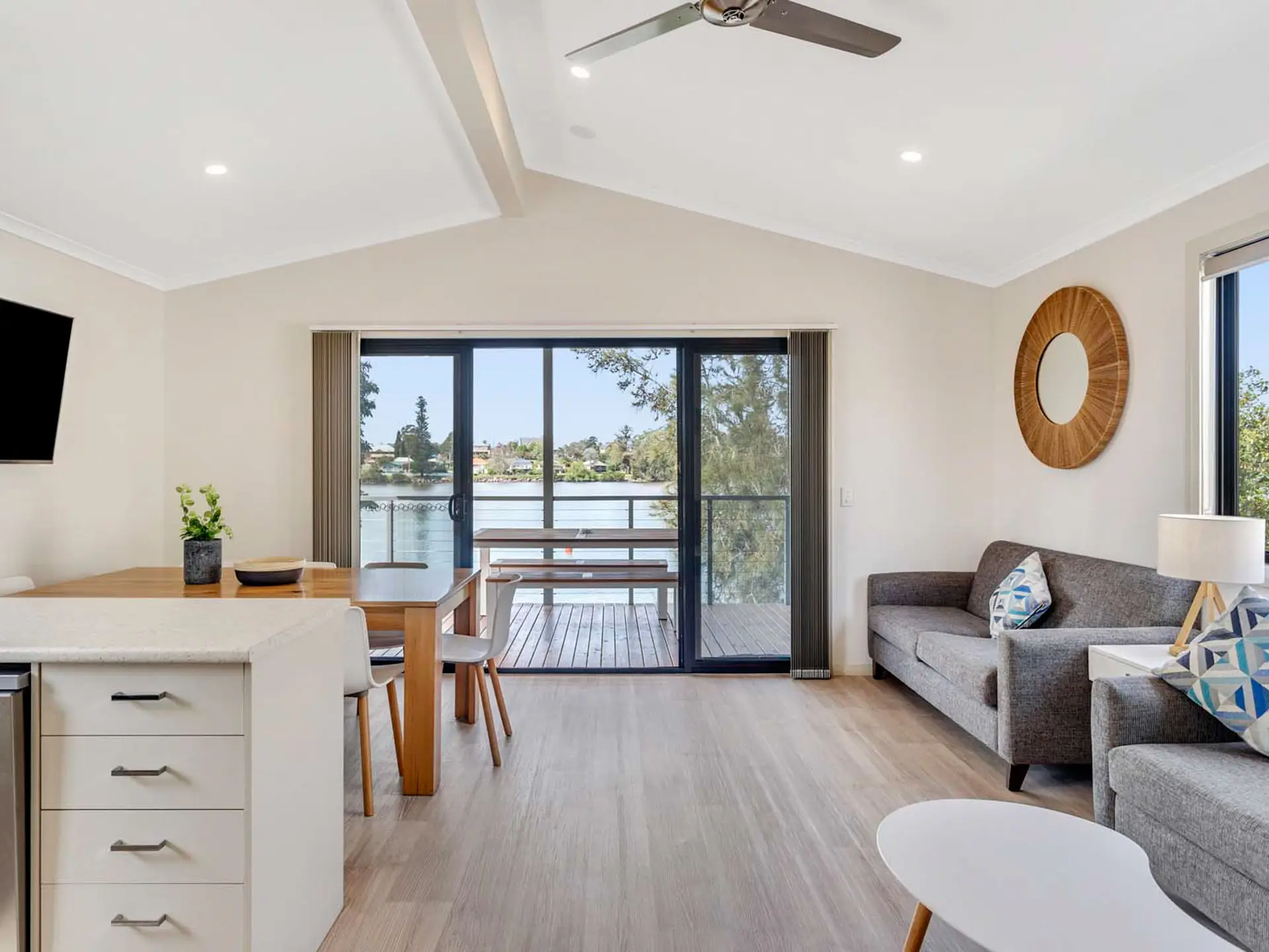 Unwind in riverfront luxury in this elevated three-bedroom villa, perfect for families or groups of up to eight. Enjoy panoramic views from the private deck, complete with BBQ and outdoor setting. Inside, find two bathrooms, a spacious living area, and a full kitchen with gas oven, microwave, and dishwasher. Bedding includes a queen, a double, and two sets of bunks—ideal for kids. Comforts like air conditioning, ceiling fans, and TV ensure a relaxing stay.