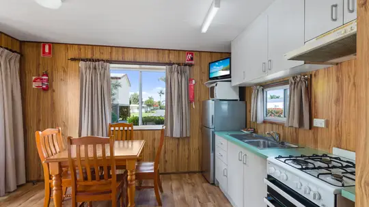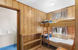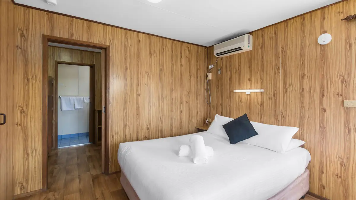 This budget-friendly, pet-welcoming cabin is ideal for up to four guests, offering a double bed in the open plan living area and one set of bunk in a seperate room. The compact kitchenette includes a cooktop, microwave, and fridge, with reverse-cycle air conditioning for comfort. Enjoy simple, practical living with a private ensuite and a small outdoor space to unwind—pets are welcome too.