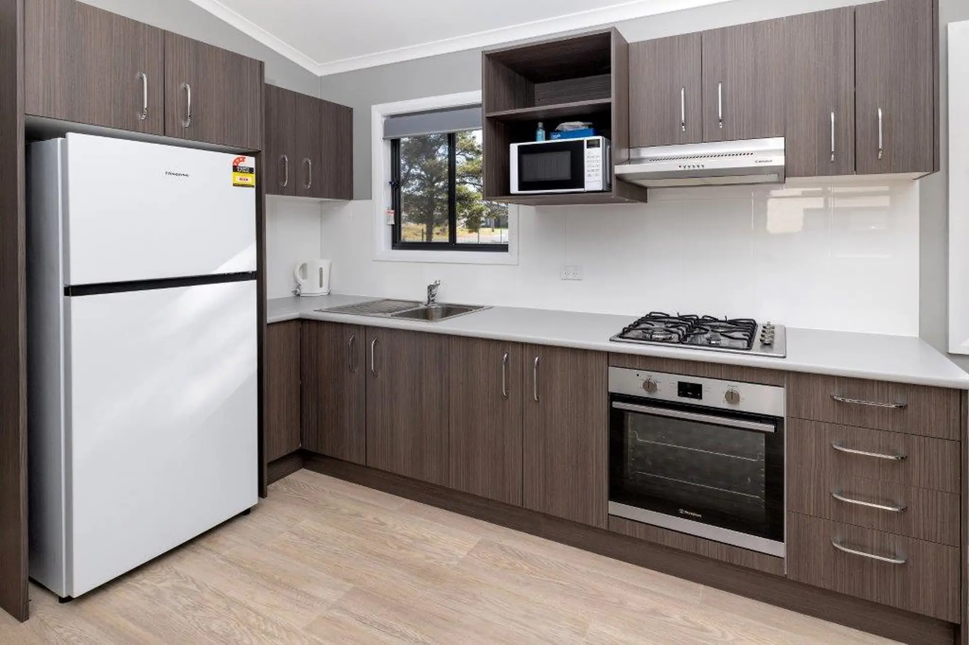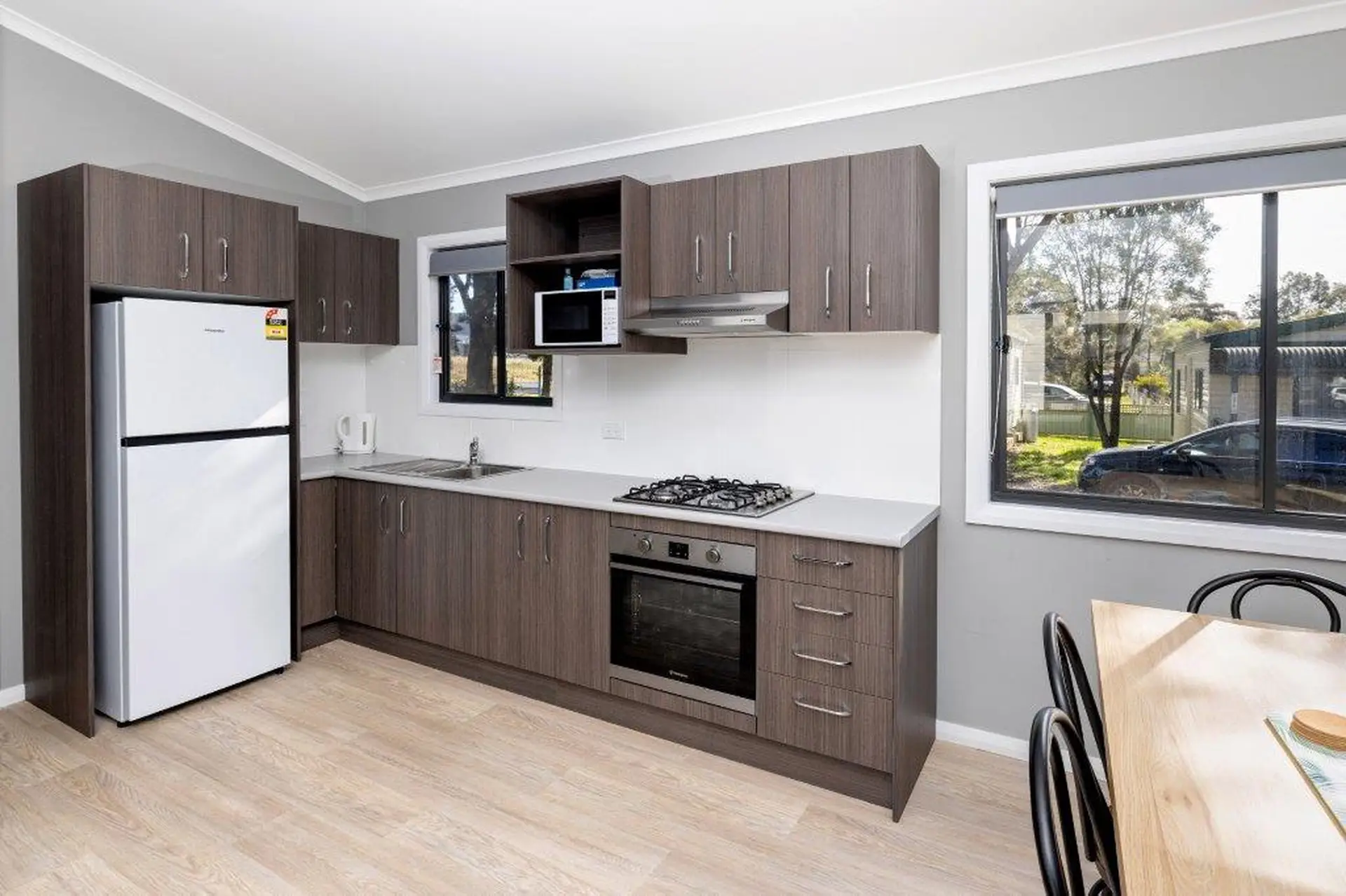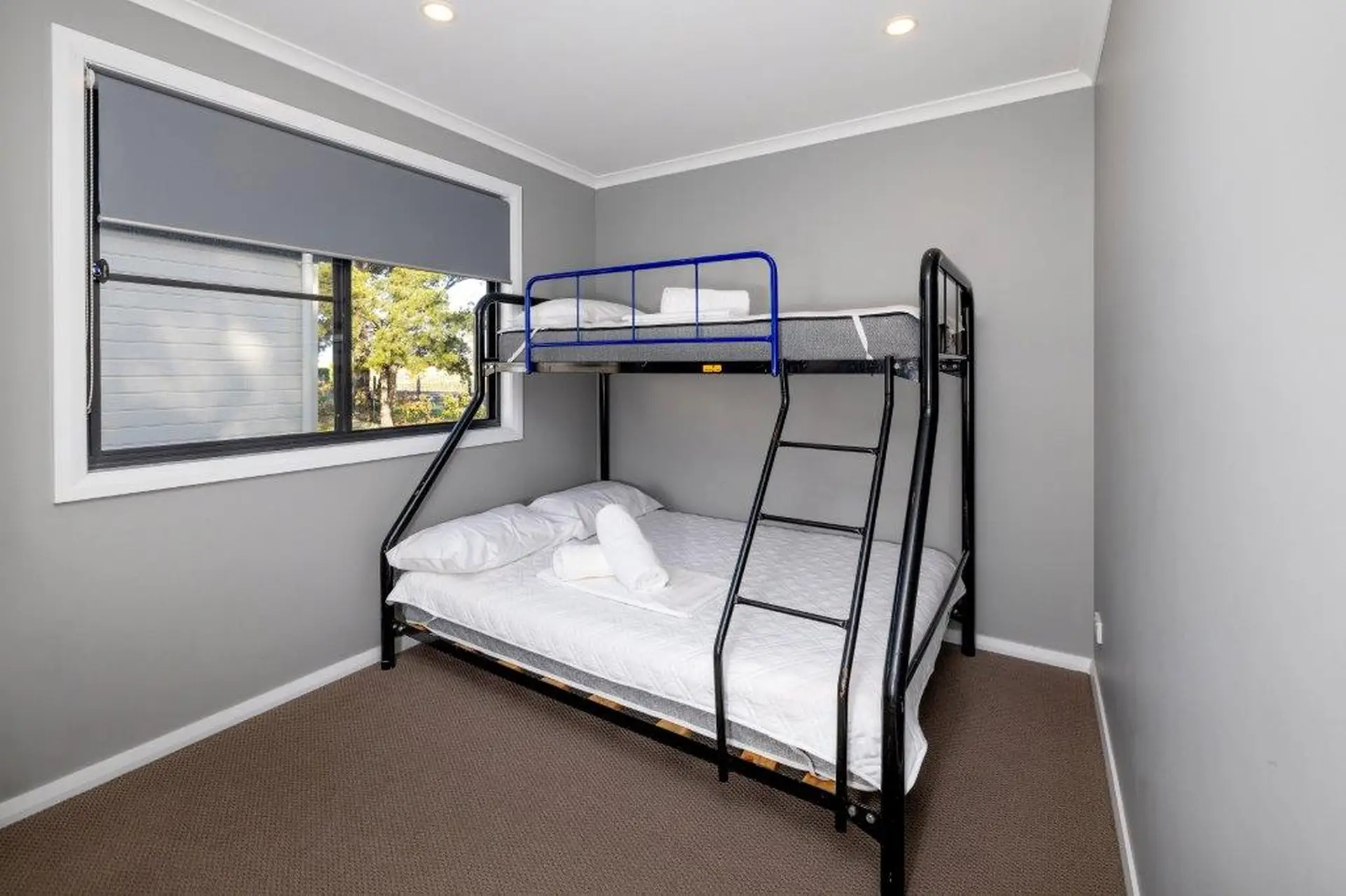 These Three Bedroom Cabins are fully self contained, equipped with a queen bed, a tri bunk (a single bed on top and a double bed on the bottom) and a single bed. This spacious cabin provides enough room for a large family or group. They over look the powered sites which not only offers a beautiful view of trees and wildlife, it allows groups to travel and stay together.
