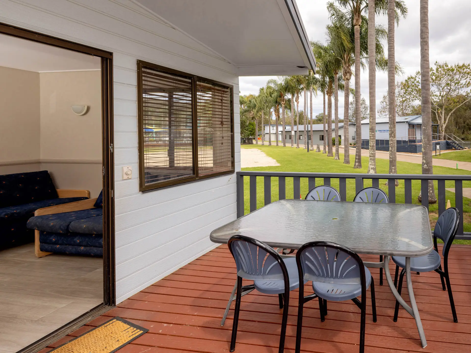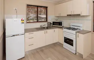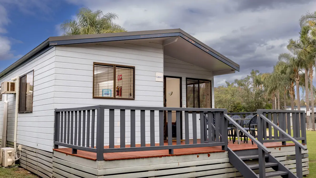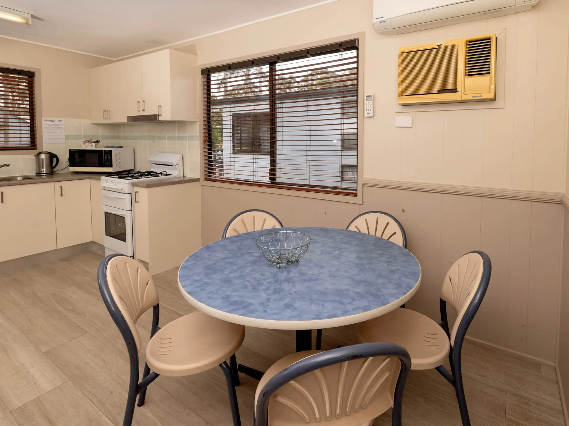 This cabin sleeps up to five with a queen bed and a bunk over double bed. It features a full kitchen with oven, fridge and microwave, private bathroom, and a dining area. A comfortable, no-fuss option for families seeking self-contained convenience close to park amenities.