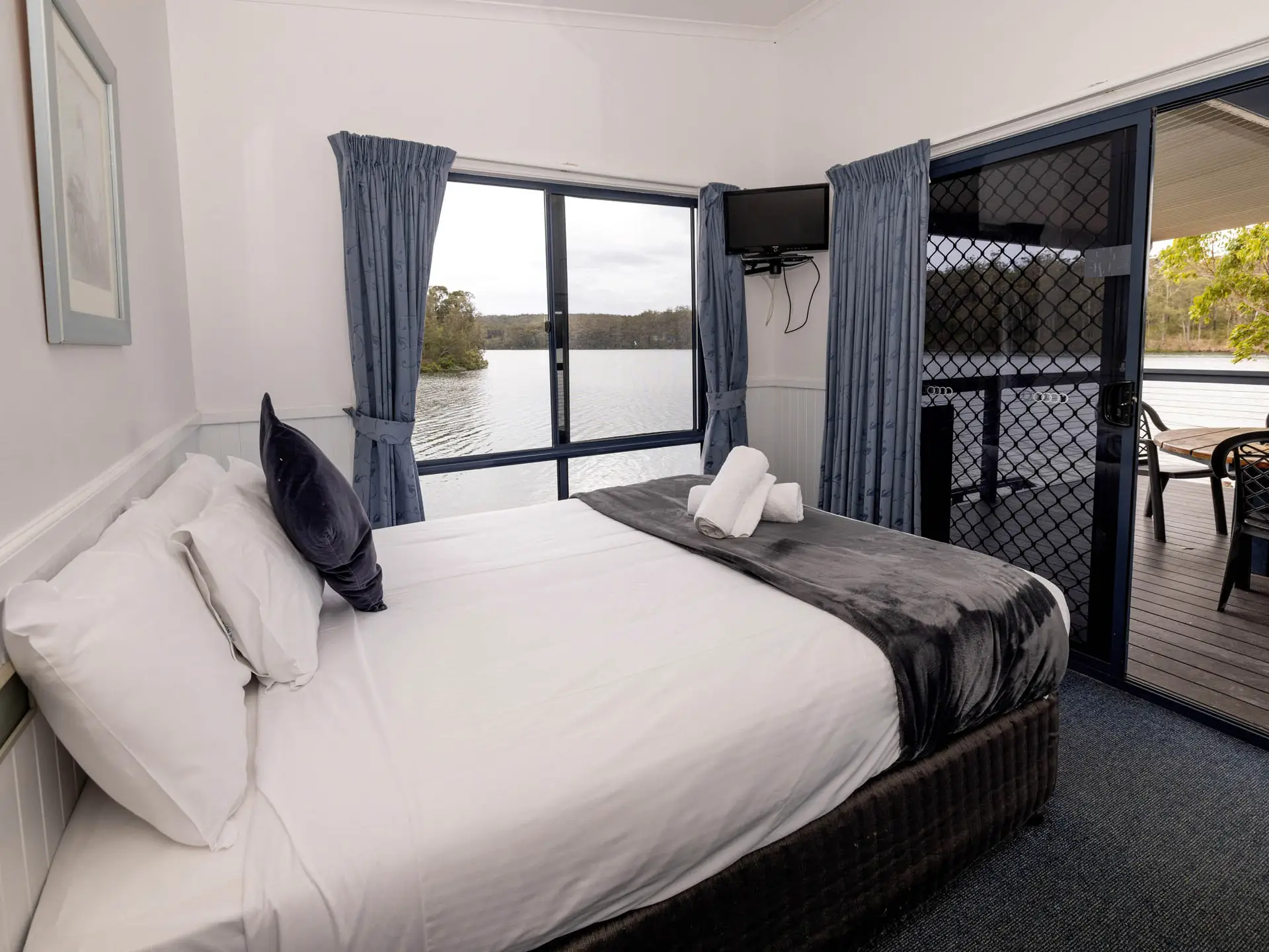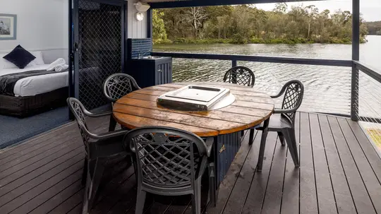 Sleeping up to six guests, this villa includes two queen beds and a set of bunks. Enjoy a full kitchen, laundry, and a spa bath with views over the Clyde River. The open-plan living area flows to a deck with BBQ, making it perfect for couples or families wanting a peaceful waterfront stay.