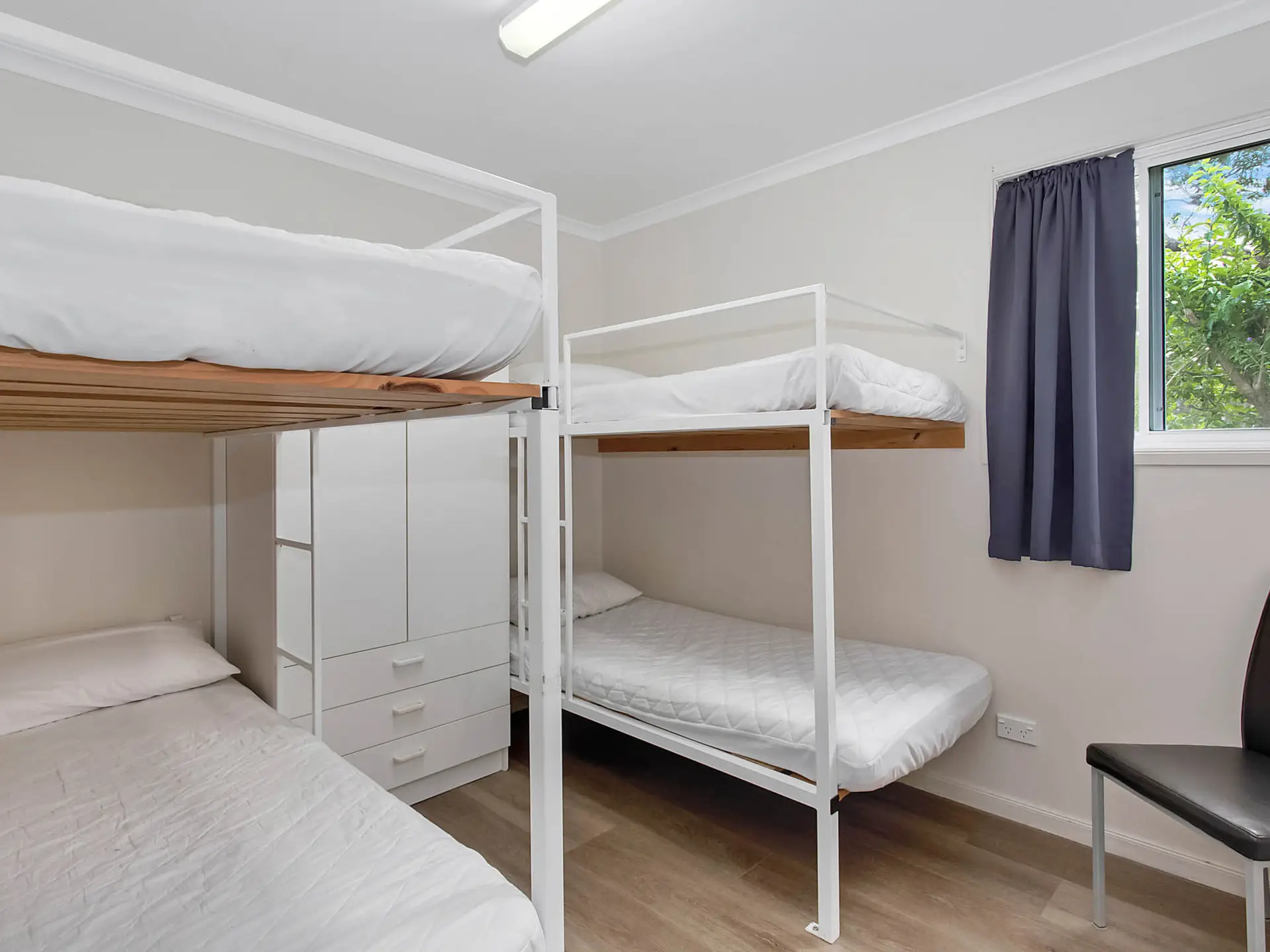 Located near the lagoon pool, this spacious two-bedroom villa sleeps up to six guests. It features a queen bed in the main bedroom and two sets of single bunks in the second. The self-contained kitchen includes an electric cooktop, microwave, and full-size fridge. With a dining area, TV, and air-conditioning, plus a private bathroom and large outdoor deck, it’s ideal for relaxed family stays.