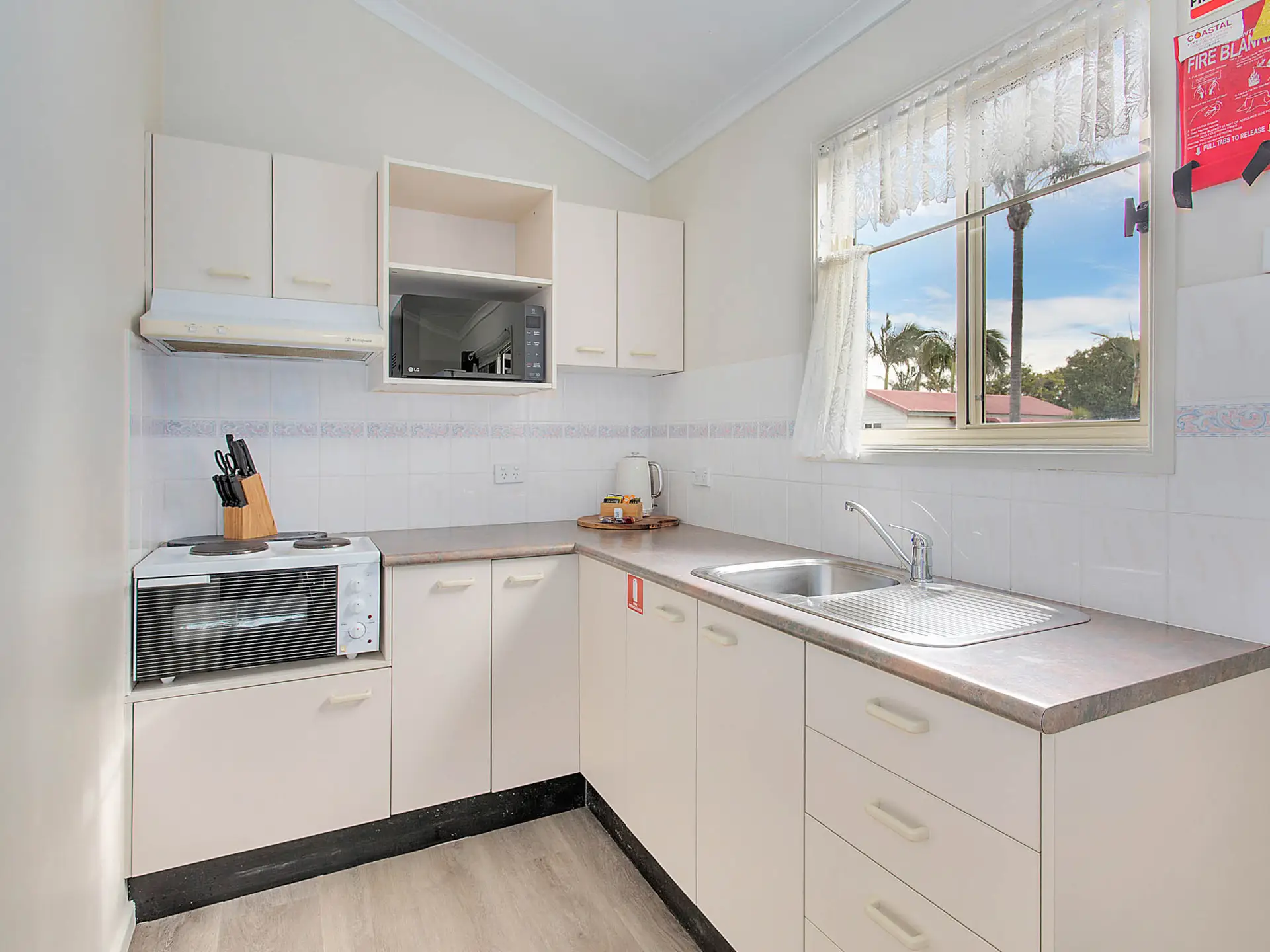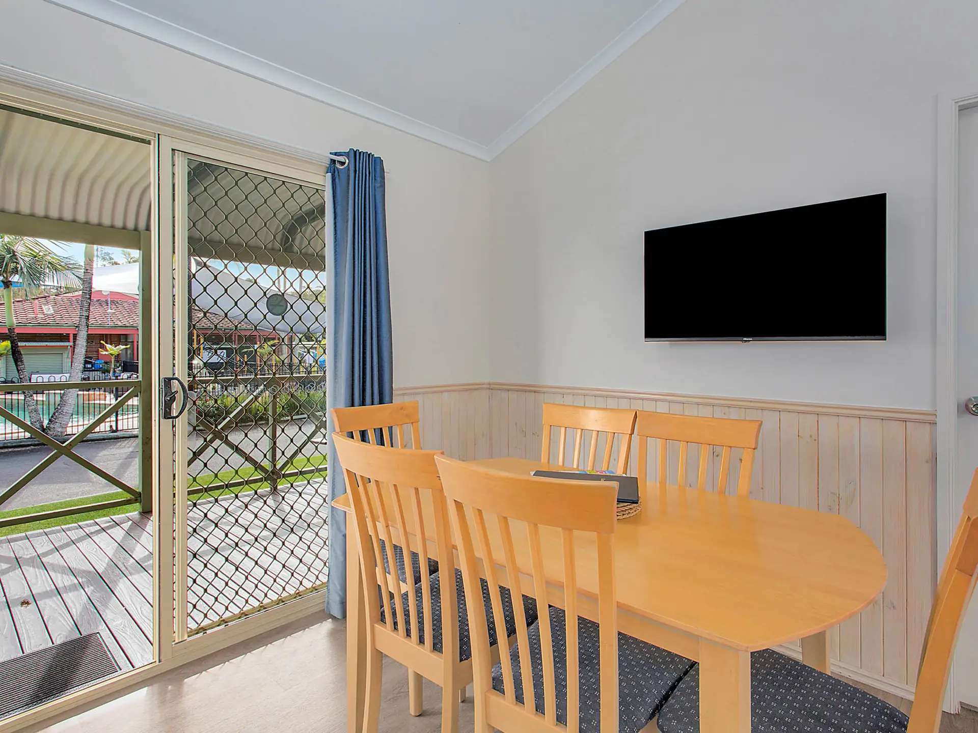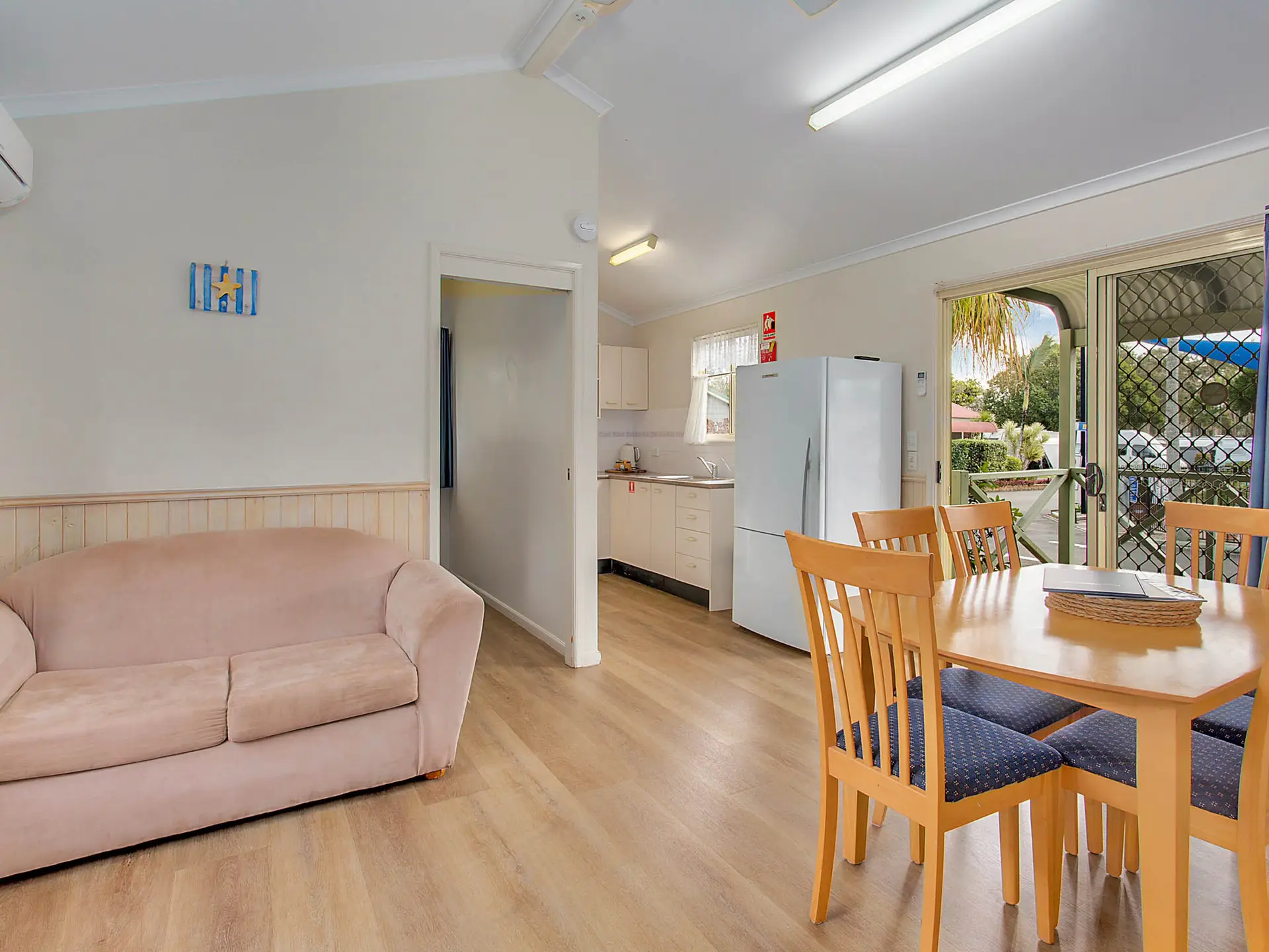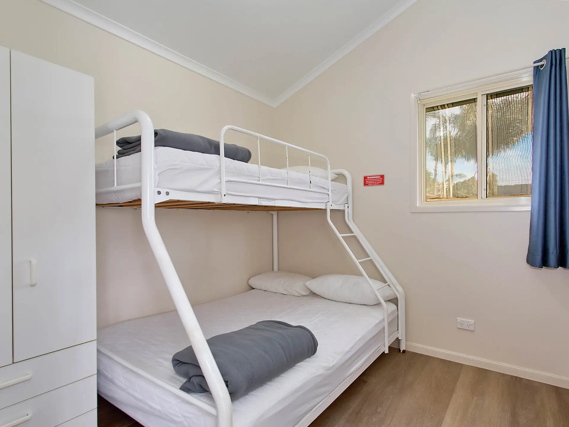 Situated just steps from the lagoon pool, this two-bedroom cabin sleeps up to five guests with a double bed in the main bedroom and a tri-bunk in the second. It features a full kitchen with electric cooktop, microwave, toaster, and full-size fridge. Inside you’ll find a dining area, TV, and air-conditioning, while outside a large balcony with seating invites you to unwind. Includes a private bathroom with all essentials.