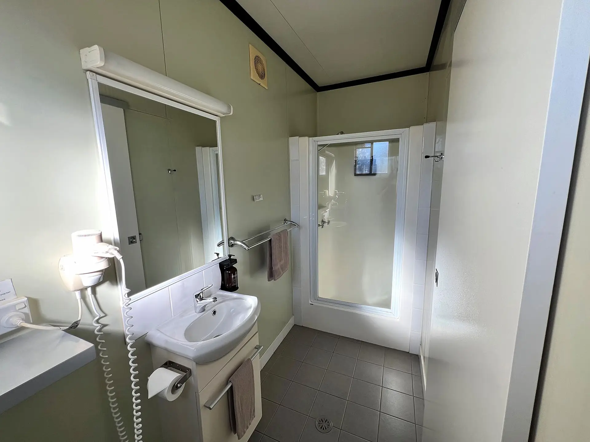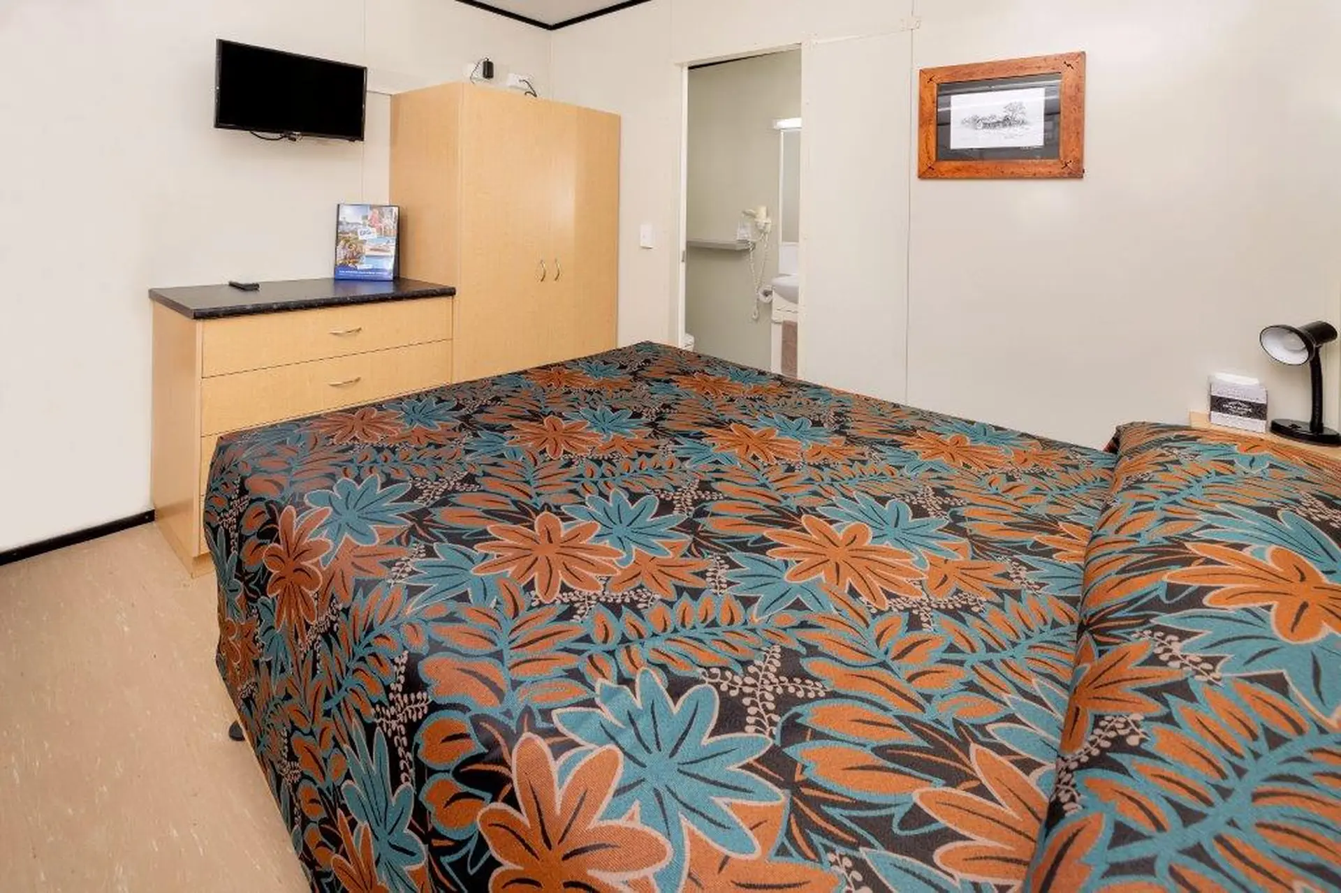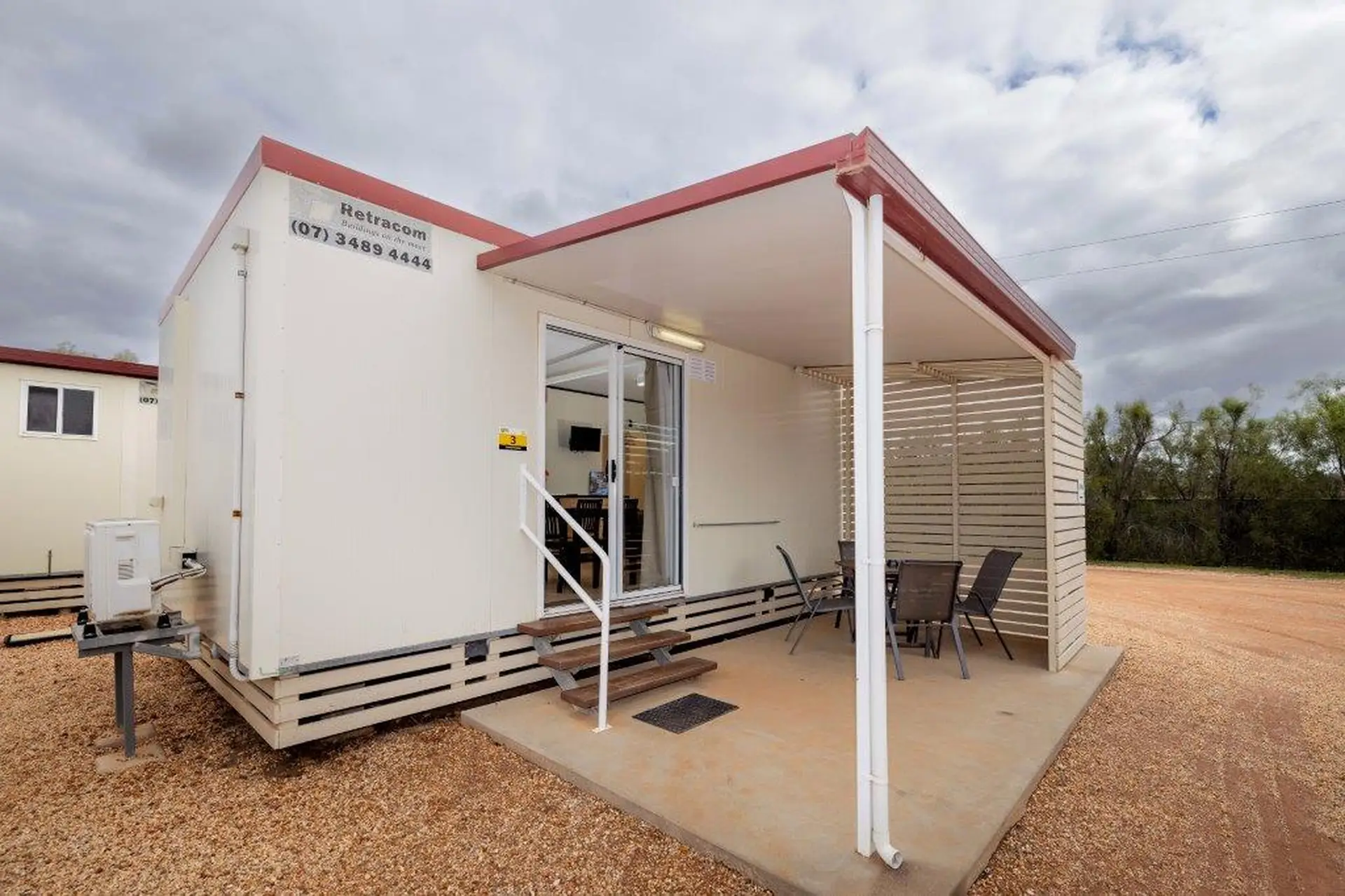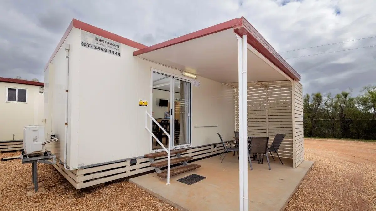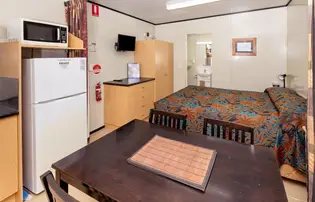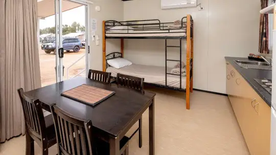 Ideal for couples or small families, this studio cabin sleeps up to four with a queen bed and a single bunk set in an open-plan layout. It features a kitchenette with cooktop, microwave, and fridge, along with air conditioning and a TV. A private patio with outdoor seating provides a pleasant space to relax.