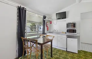 A practical option for travellers, this cabin sleeps up to six guests with a double bed in the main area and two sets of single bunk beds in a separate room. The interior features a compact kitchenette with a bar fridge, microwave, toaster and kettle. Enjoy casual meals at the dining table or relax in front of the TV. Step outside onto the private deck for a peaceful moment after a day exploring the nearby beach and reserve.