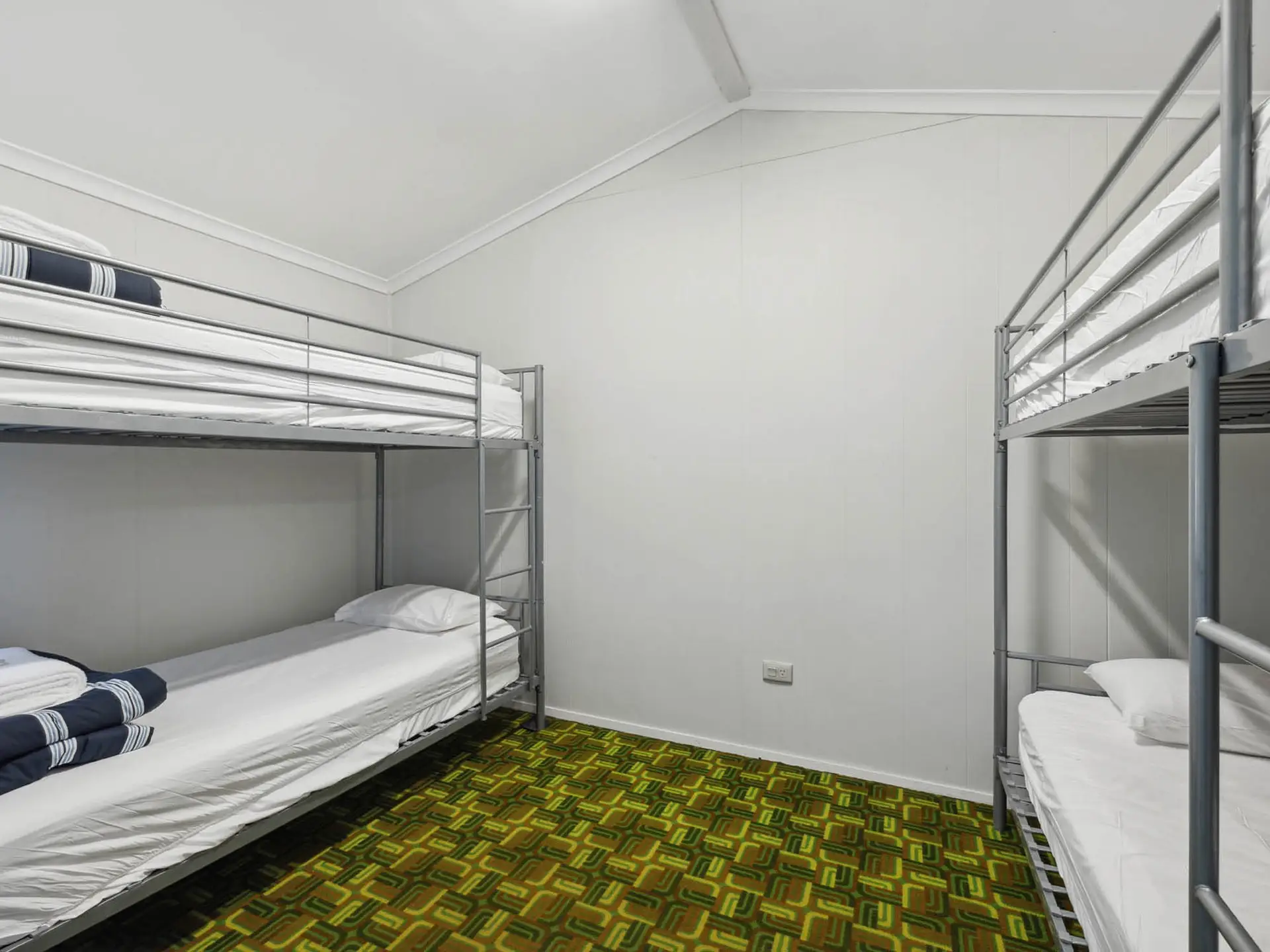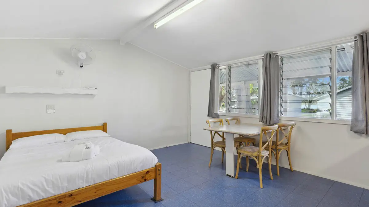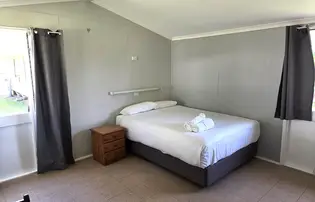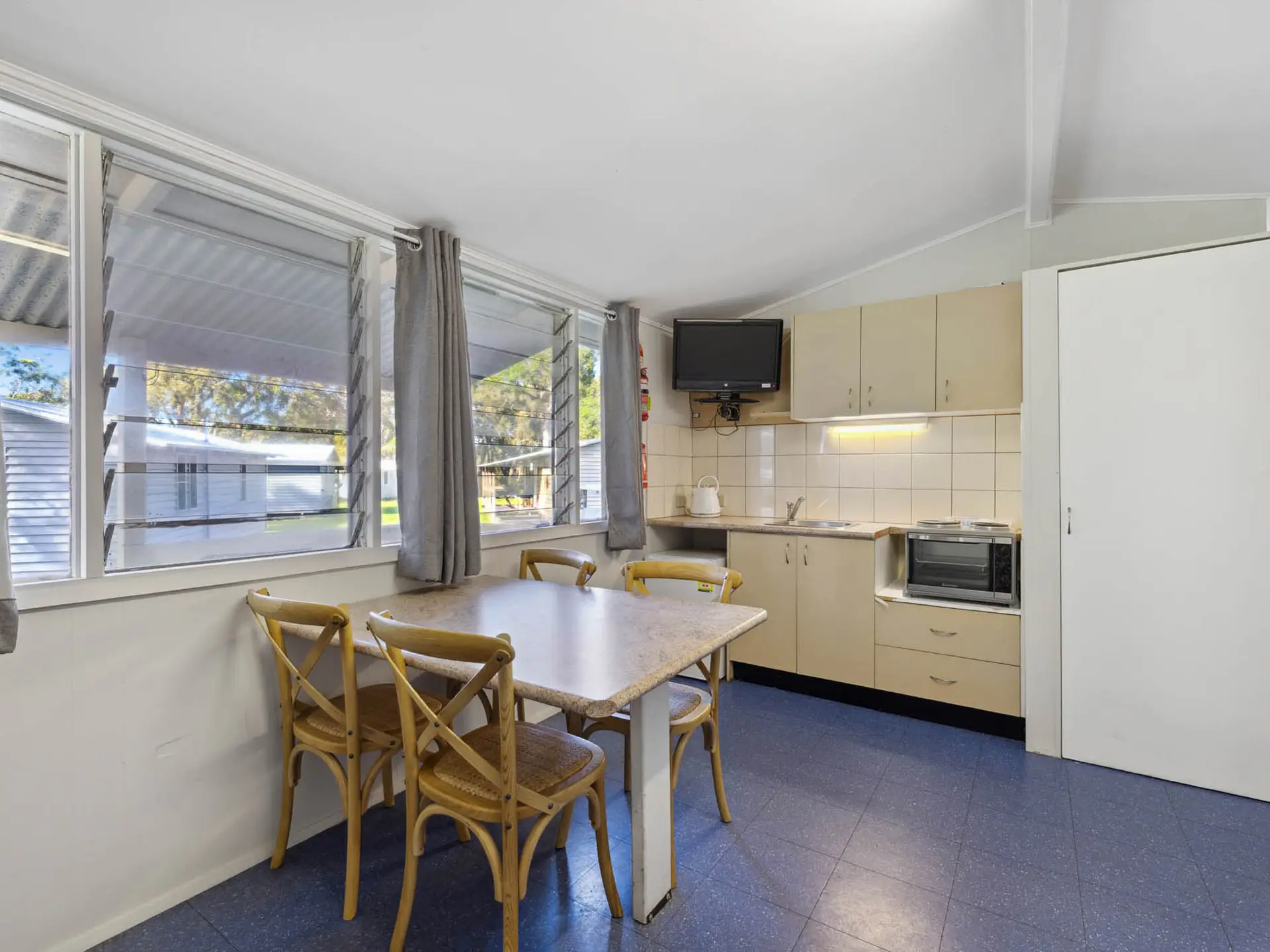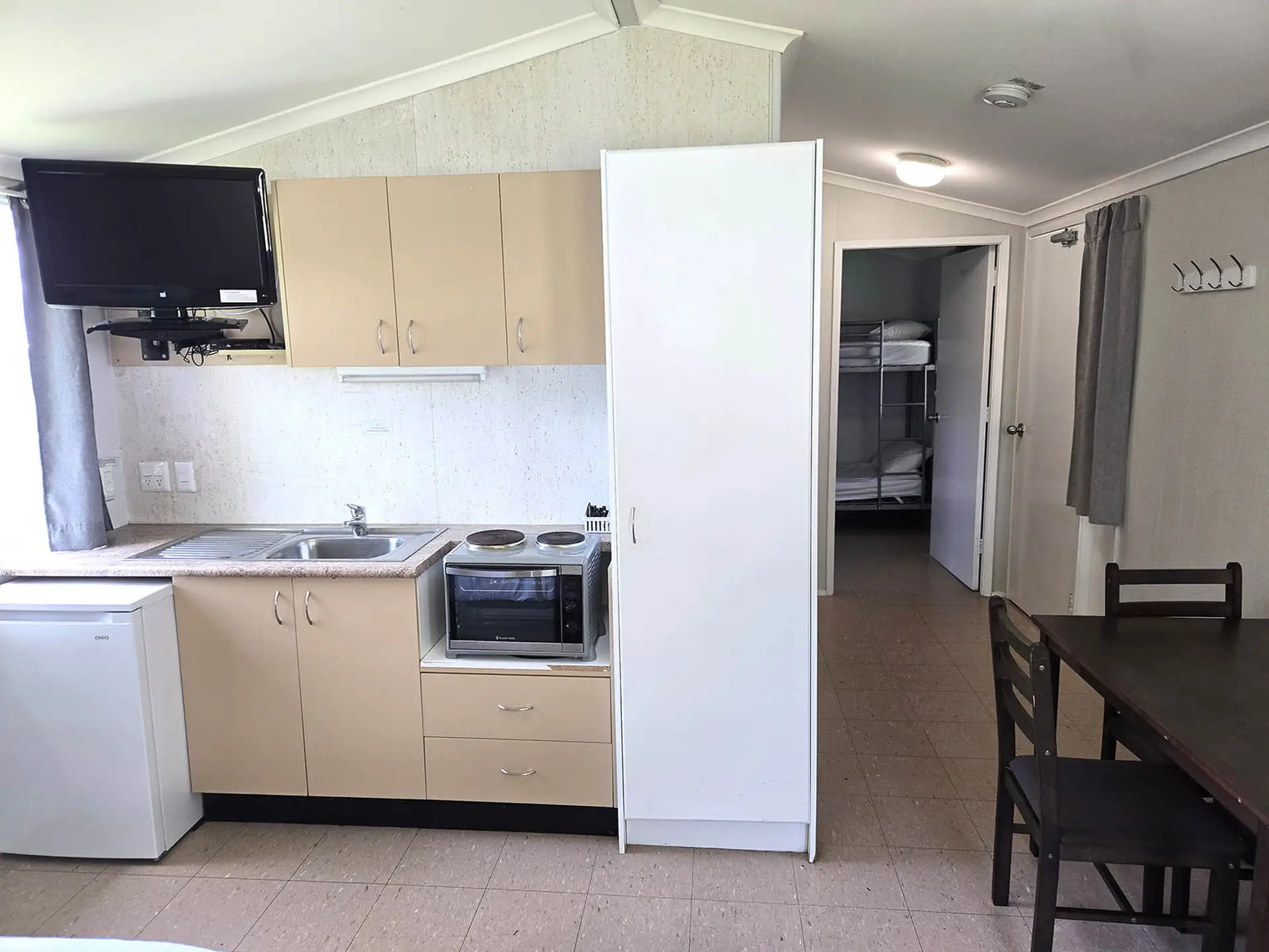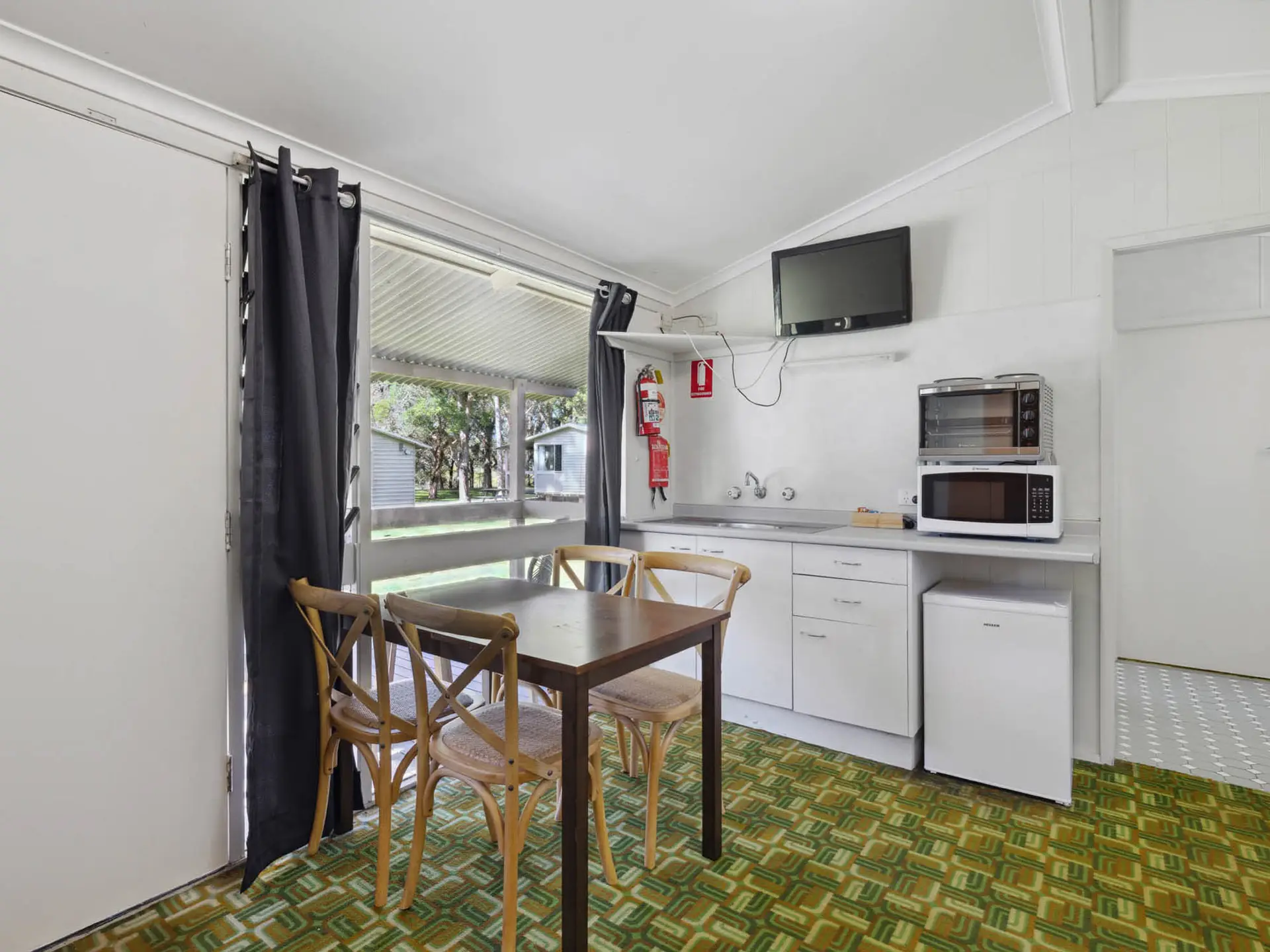 This pet-friendly cabin offers relaxed, budget accommodation for up to six guests, with a queen bed in the main area and two single bunk sets in a separate room. The compact kitchenette includes a microwave, bar fridge, toaster and kettle—ideal for preparing light meals. Stay comfortable with a fan and TV, and enjoy the outdoor deck with your furry companion. A great option for families travelling with pets looking to explore the beach and natural surrounds nearby.