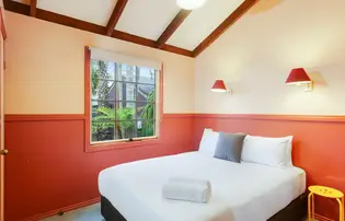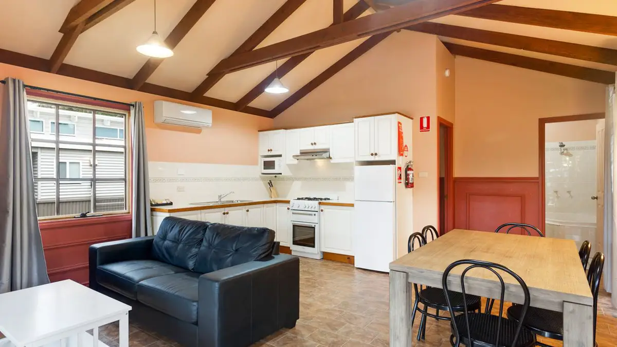 Stay in the heart of history with the Olde Town General Store cabin. With its classic shopfront and cosy interior, this two-bedroom retreat sleeps up to five guests with one queen bed and a single-over-double bunk. A practical kitchen with electric oven and full fridge makes meals simple, while the private balcony offers views to relax and reconnect—just steps from the beach.
