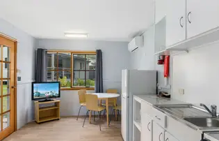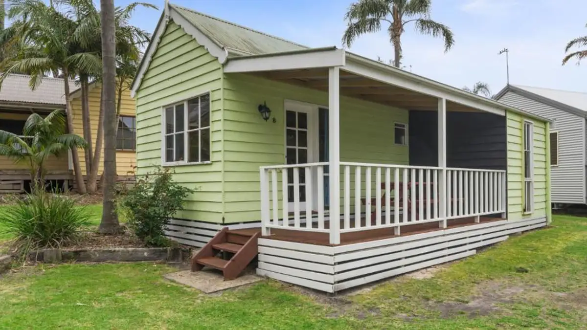 Designed for affordability and ease, this cosy two-bedroom cabin sleeps up to four with one queen bed and a bunk bed. The air-conditioned living space includes a kitchenette with stovetop, fridge, and microwave, plus a private bathroom with complimentary toiletries. A covered patio offers space to relax and dine outdoors. It’s a simple, self-contained option just minutes from the beach.