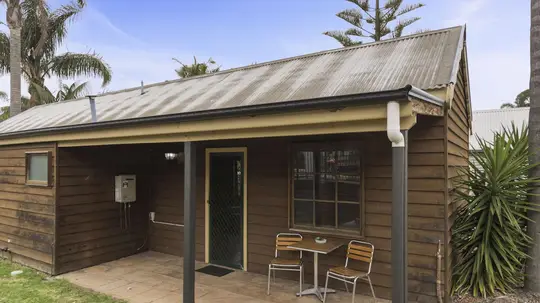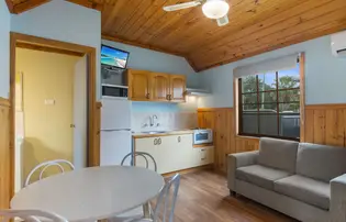 Ideal for couples or small families, this one-bedroom cabin accommodates up to four guests with one queen bed and a single bunk. Enjoy the convenience of a kitchenette with microwave and fridge, plus air conditioning and a dining area. Step outside to your private patio with garden and pool views, perfect for unwinding after a day exploring Wairo Beach.