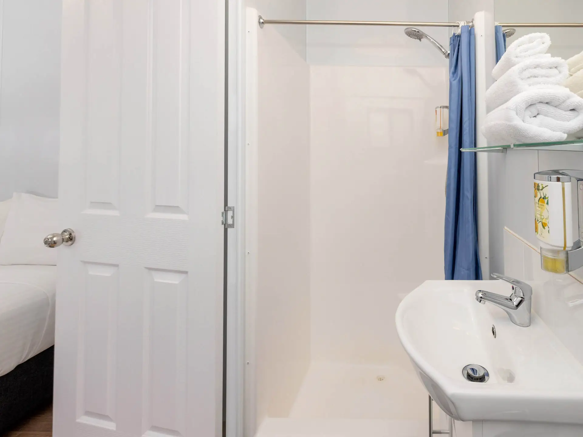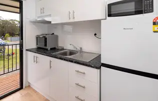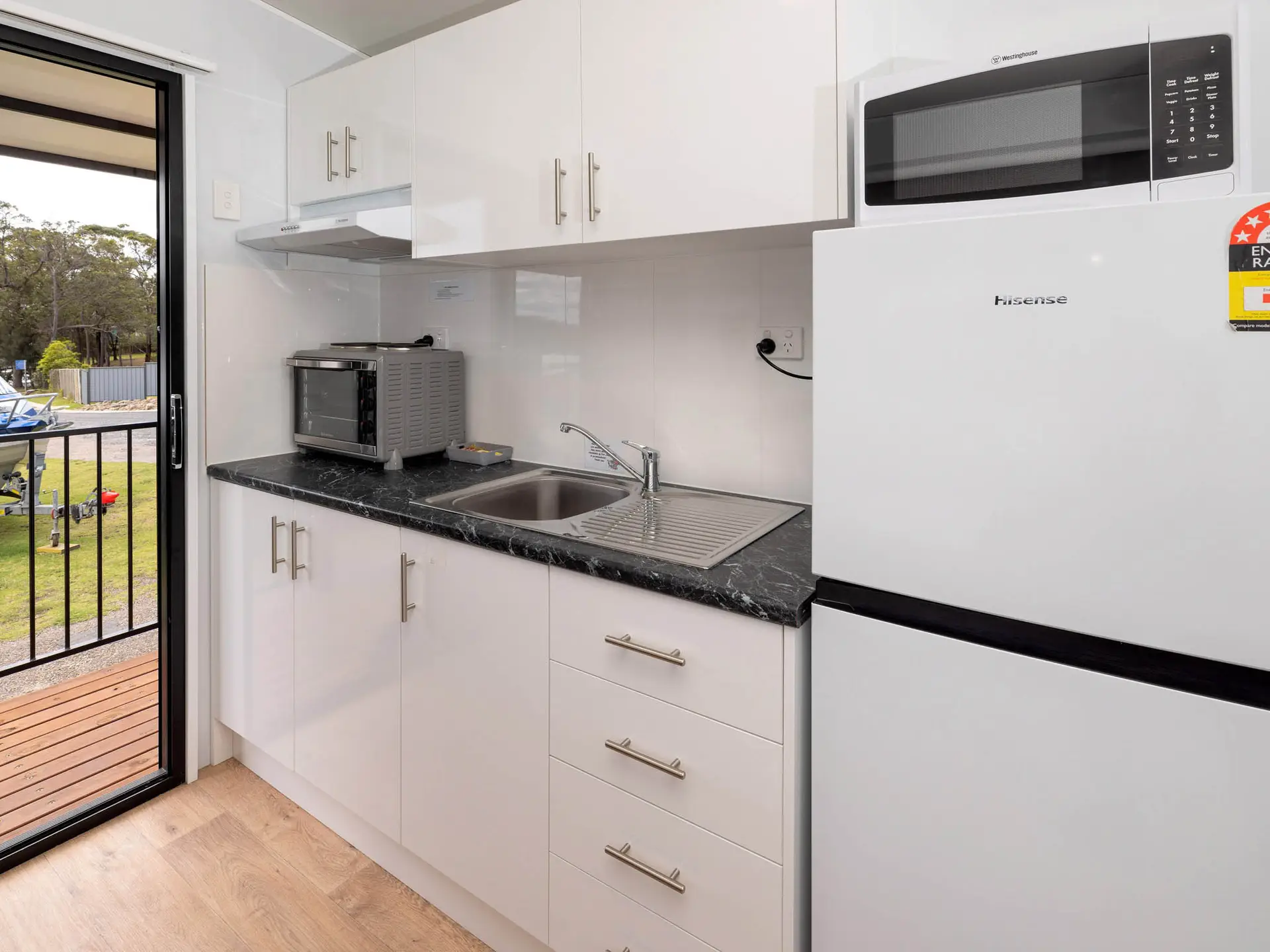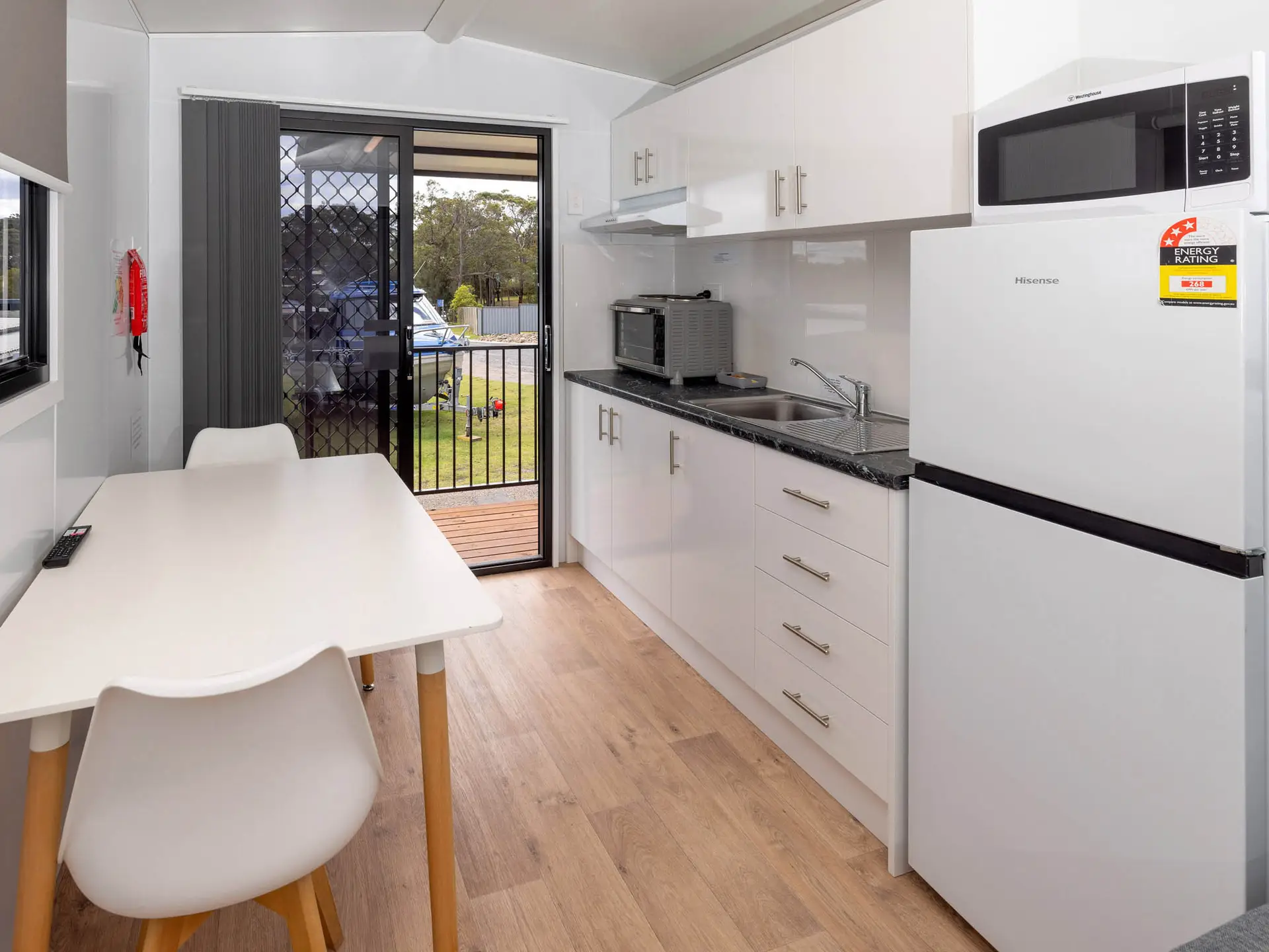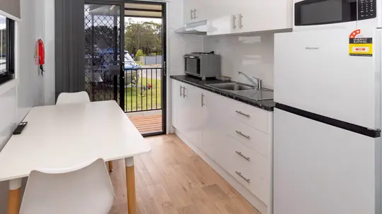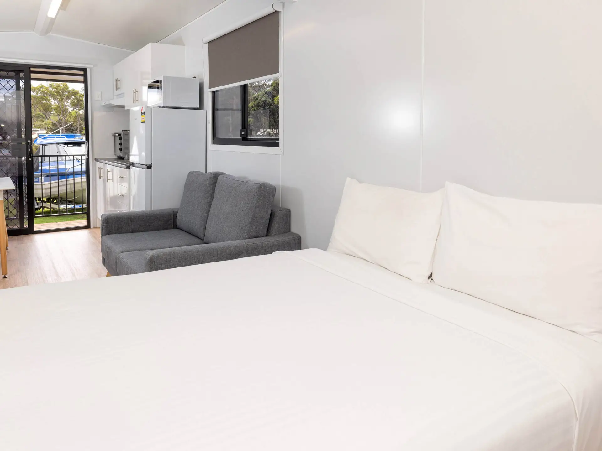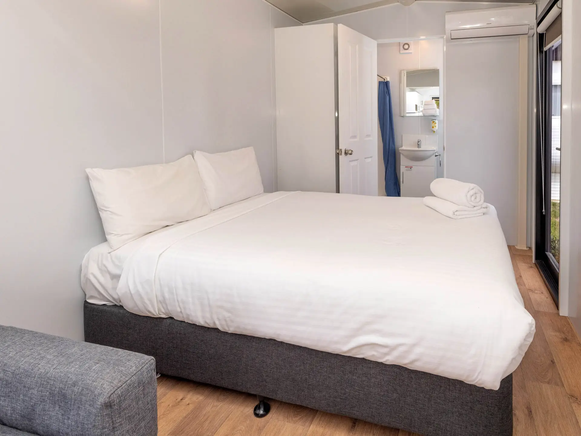Perfect for solo travellers or couples, this fully self-contained studio features a queen bed, kitchen with bench oven and stovetop, and a full fridge-freezer. The open-plan space includes a two-seater lounge, dining table and smart TV. Air conditioned for comfort, it’s an ideal retreat after a day of exploring.