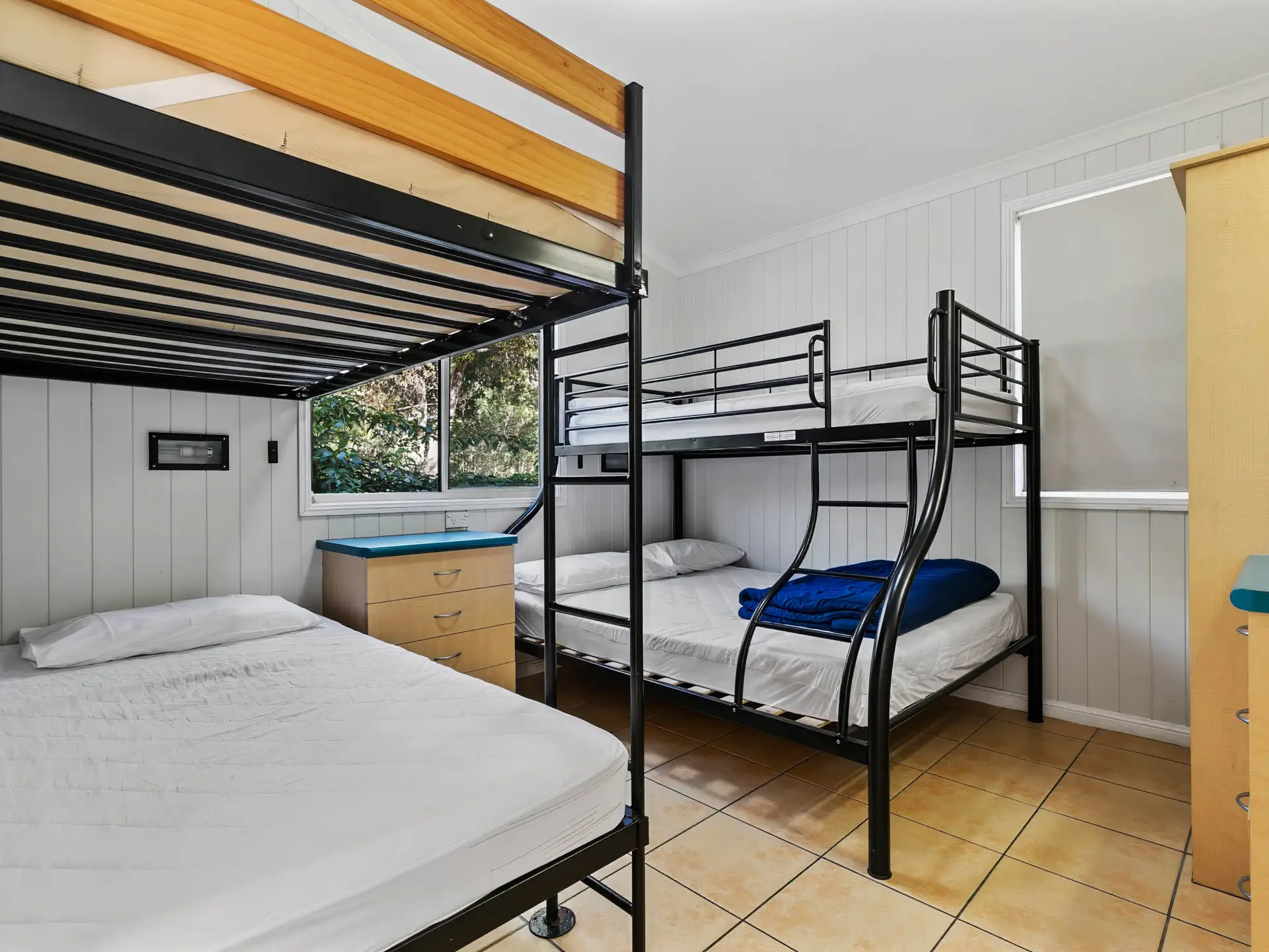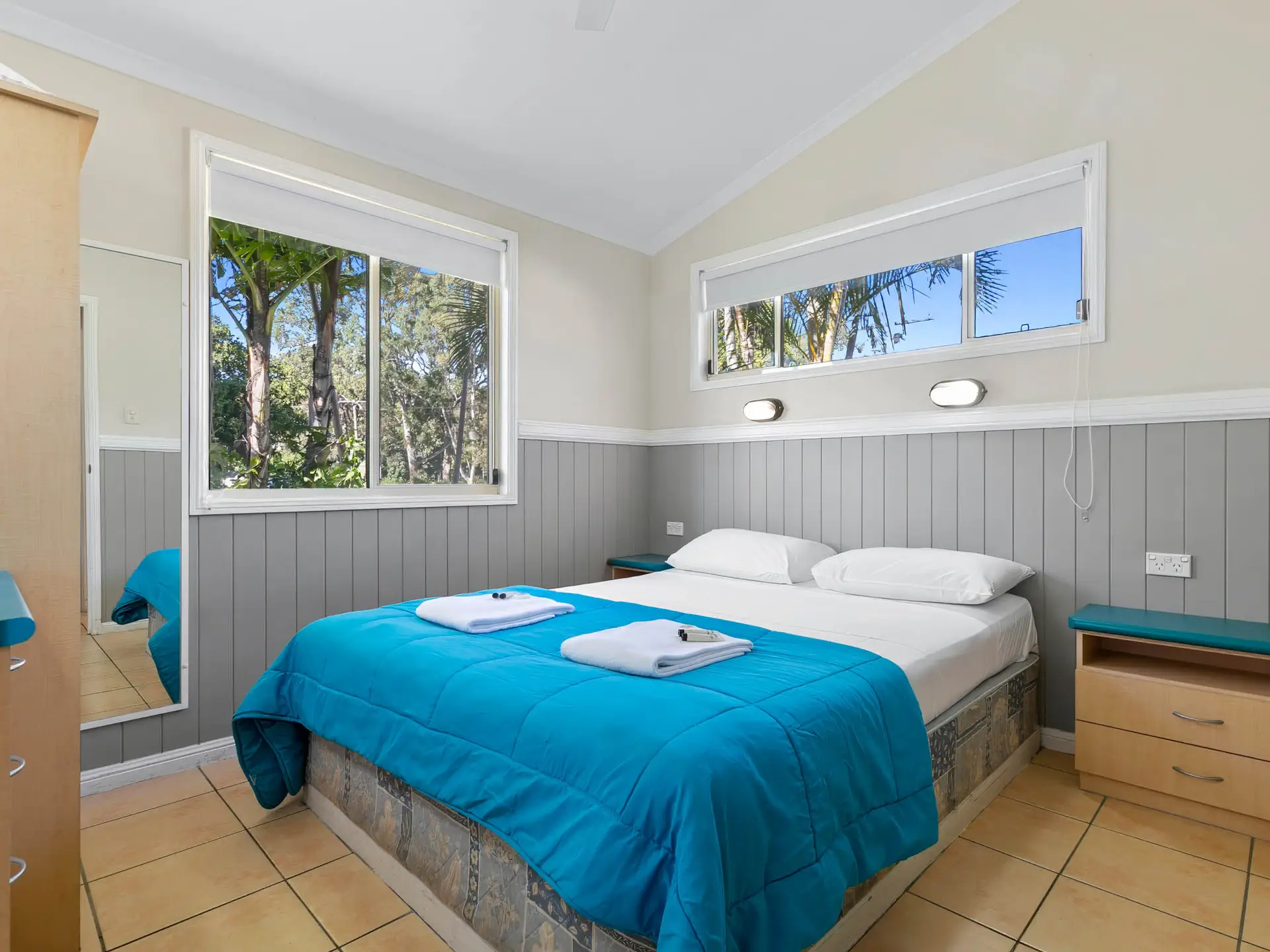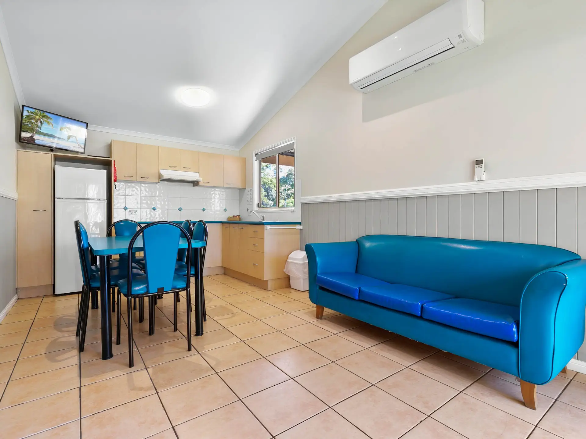 Perfect for families or groups, this two-bedroom cabin sleeps up to seven with a queen bed and a mix of single and double bunks. Enjoy a full kitchen, open-plan living with TV, and reverse-cycle air conditioning. Step onto the covered deck with outdoor seating—ideal for soaking up Bribie Island’s warmth. With a private bathroom, linen provided, and thoughtful touches throughout, it’s a relaxed and spacious base for your beachside escape.