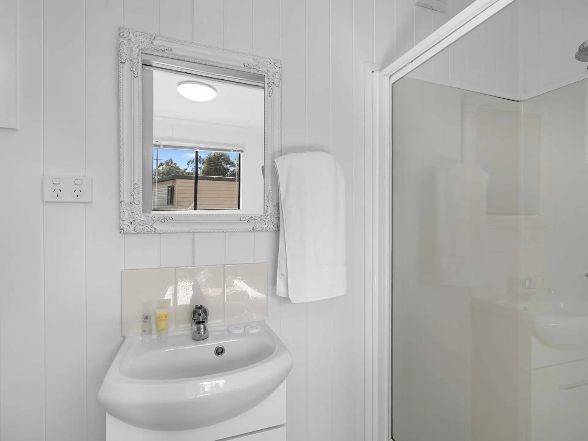 This one-bedroom cabin is perfect for couples or solo travellers, with a double bed and fold-out futon for a child or guest. Enjoy a self-contained kitchen, cosy lounge with TV, and private bathroom. Airy and welcoming, the outdoor patio with dining is great for relaxed mornings or quiet evenings. A peaceful, well-equipped base for your next escape.