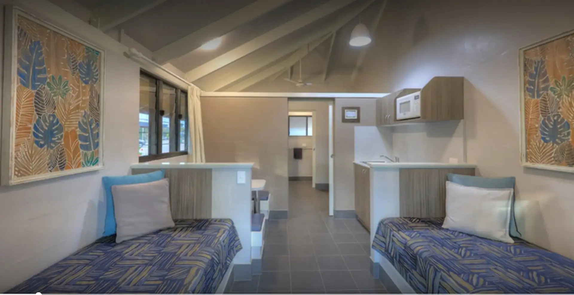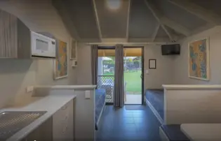 Designed for up to four guests, this air-conditioned cabin features one double bed and two singles. A compact kitchenette includes a fridge/freezer, microwave and stovetop, ideal for simple meals. With a dining area, TV, and a shaded outdoor patio, it’s a practical base for families or small groups.