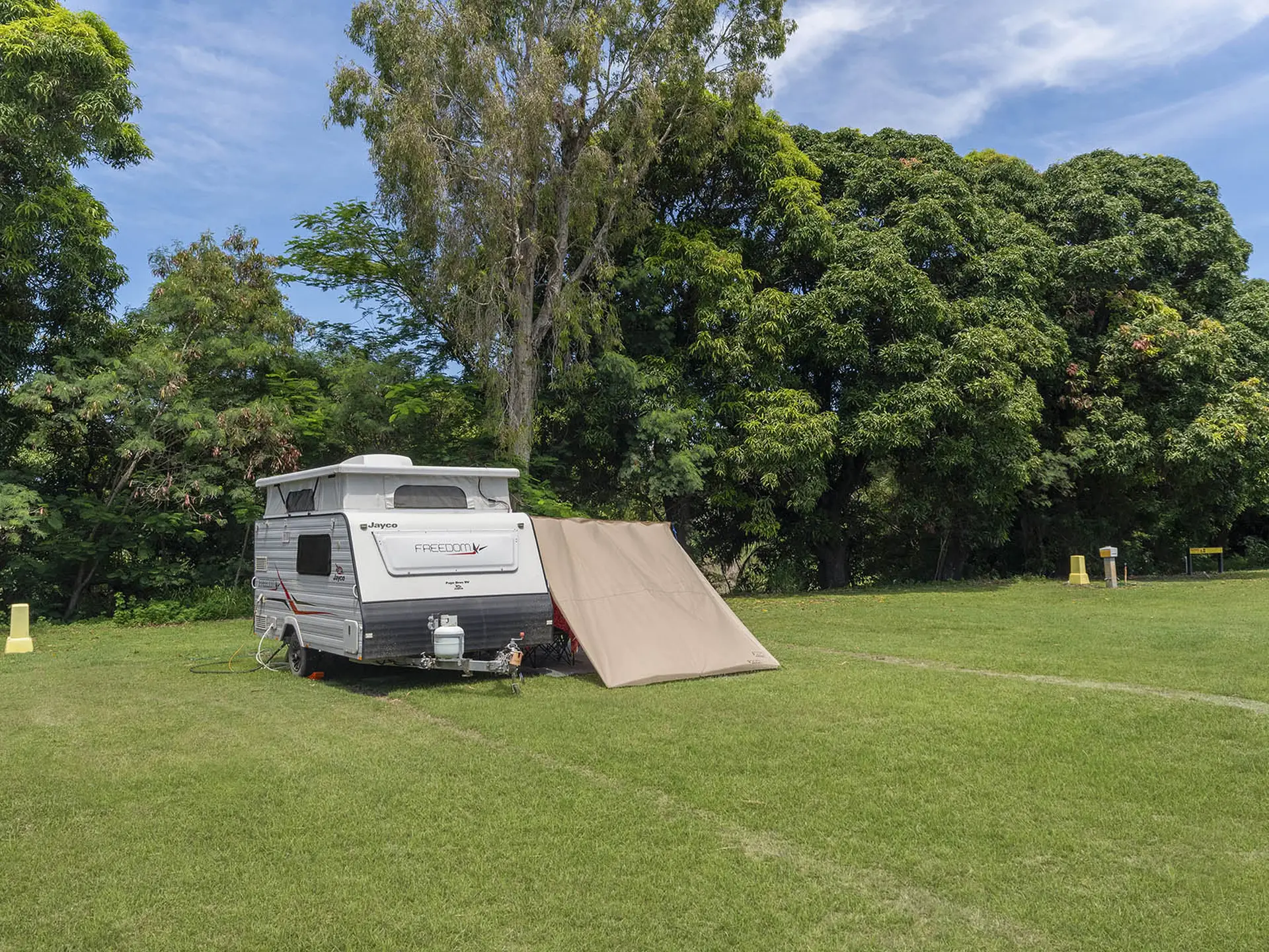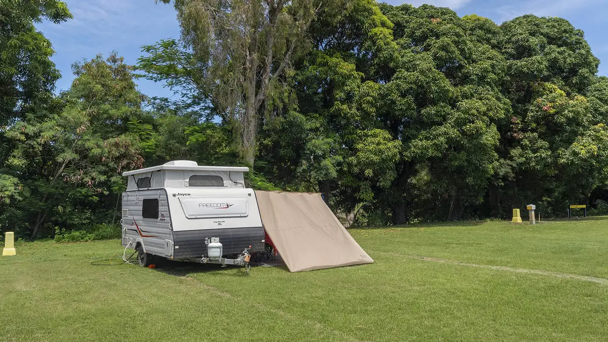 Shady powered grass sites set beneath large mango trees on the banks of Stuart Creek. These quiet sites offer a peaceful, leafy setting on water frontage. Located away from the highway, they’re within walking distance to amenities, the pool, and communal areas. Pets are welcome.