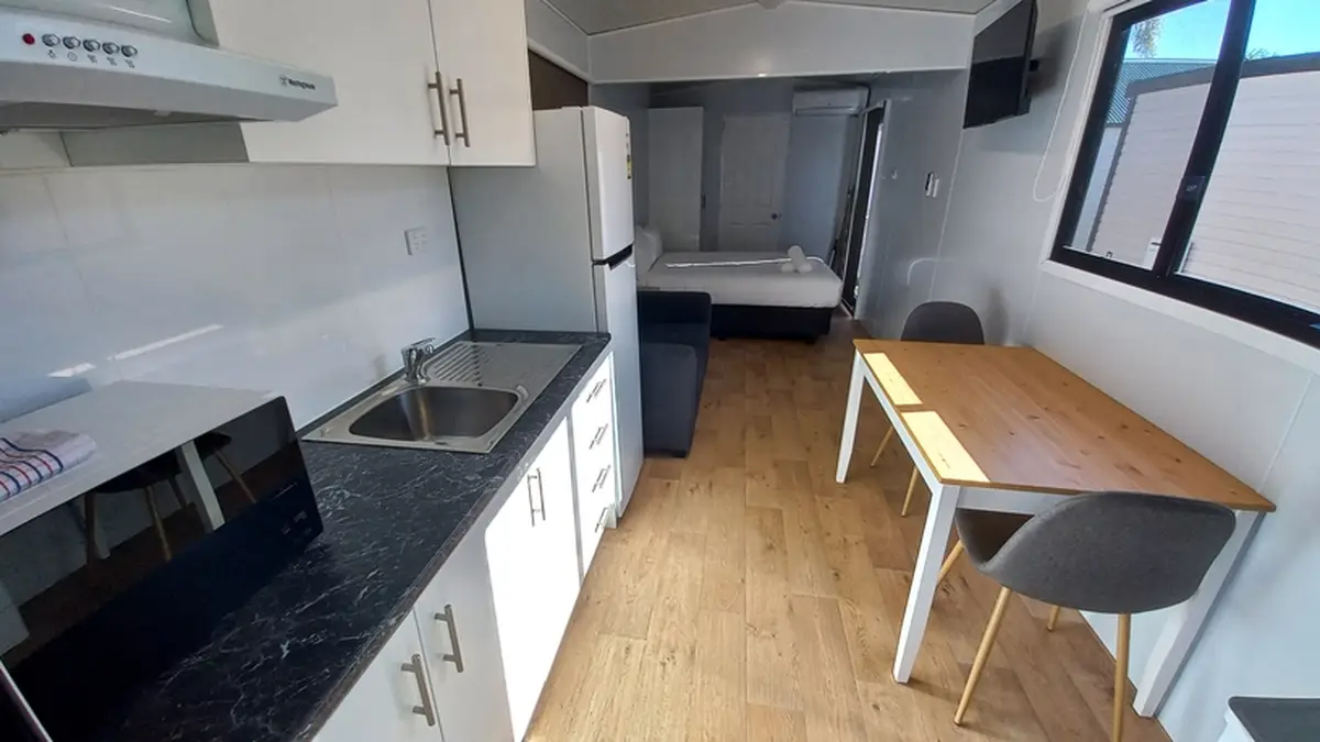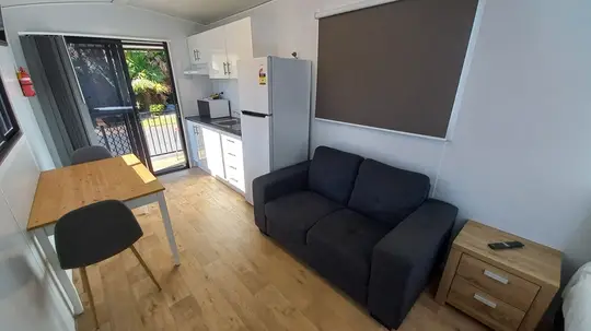 This compact studio sleeps two with a double bed, ensuite bathroom, and kitchenette. Air conditioning and a dining area provide added comfort, and a small verandah allows for outdoor sitting. Best suited to guests seeking simple, self-contained accommodation.