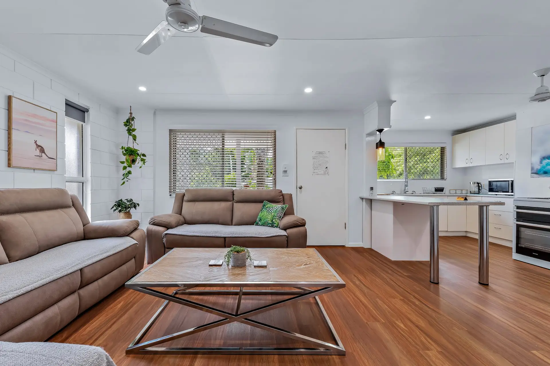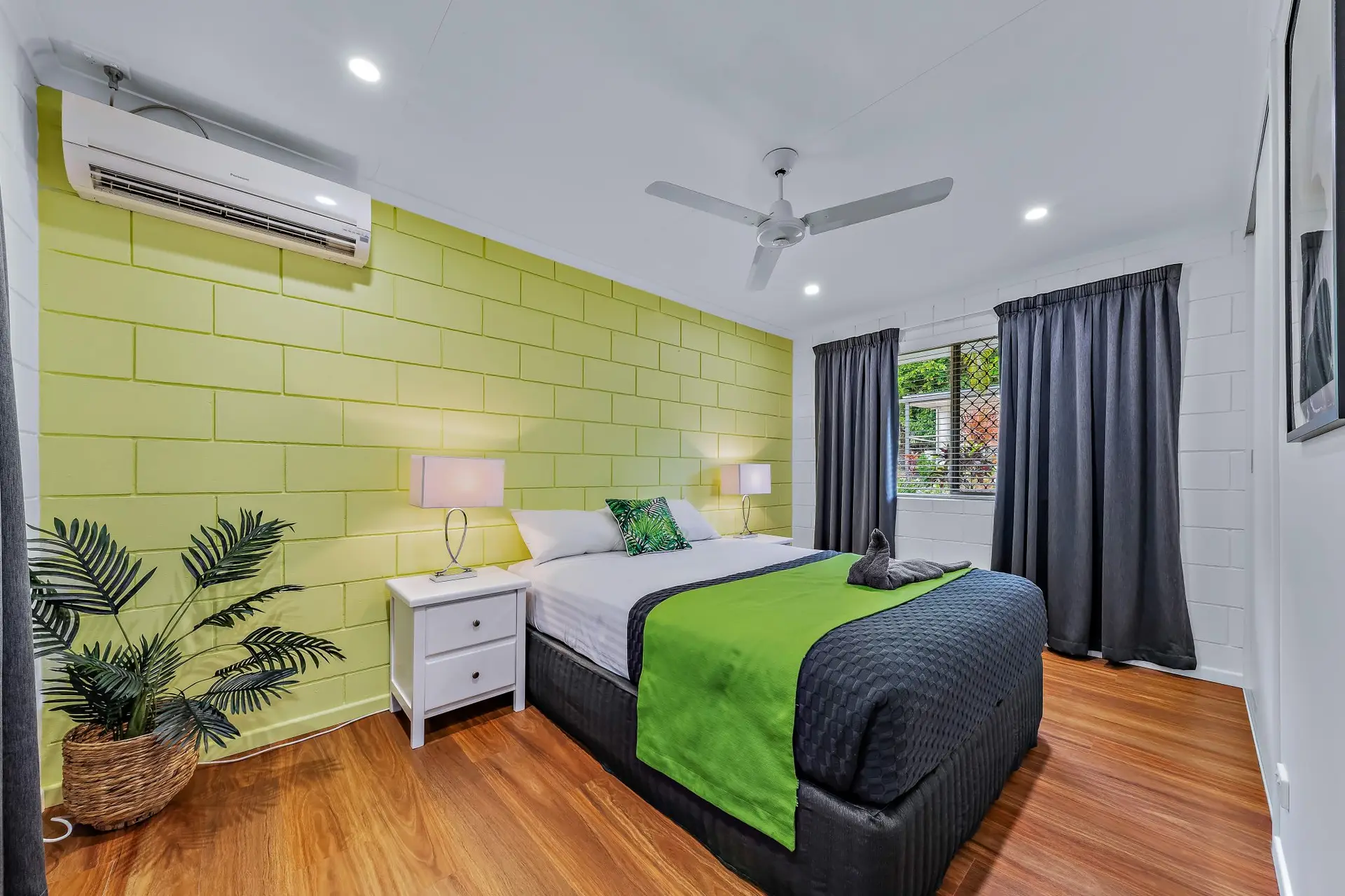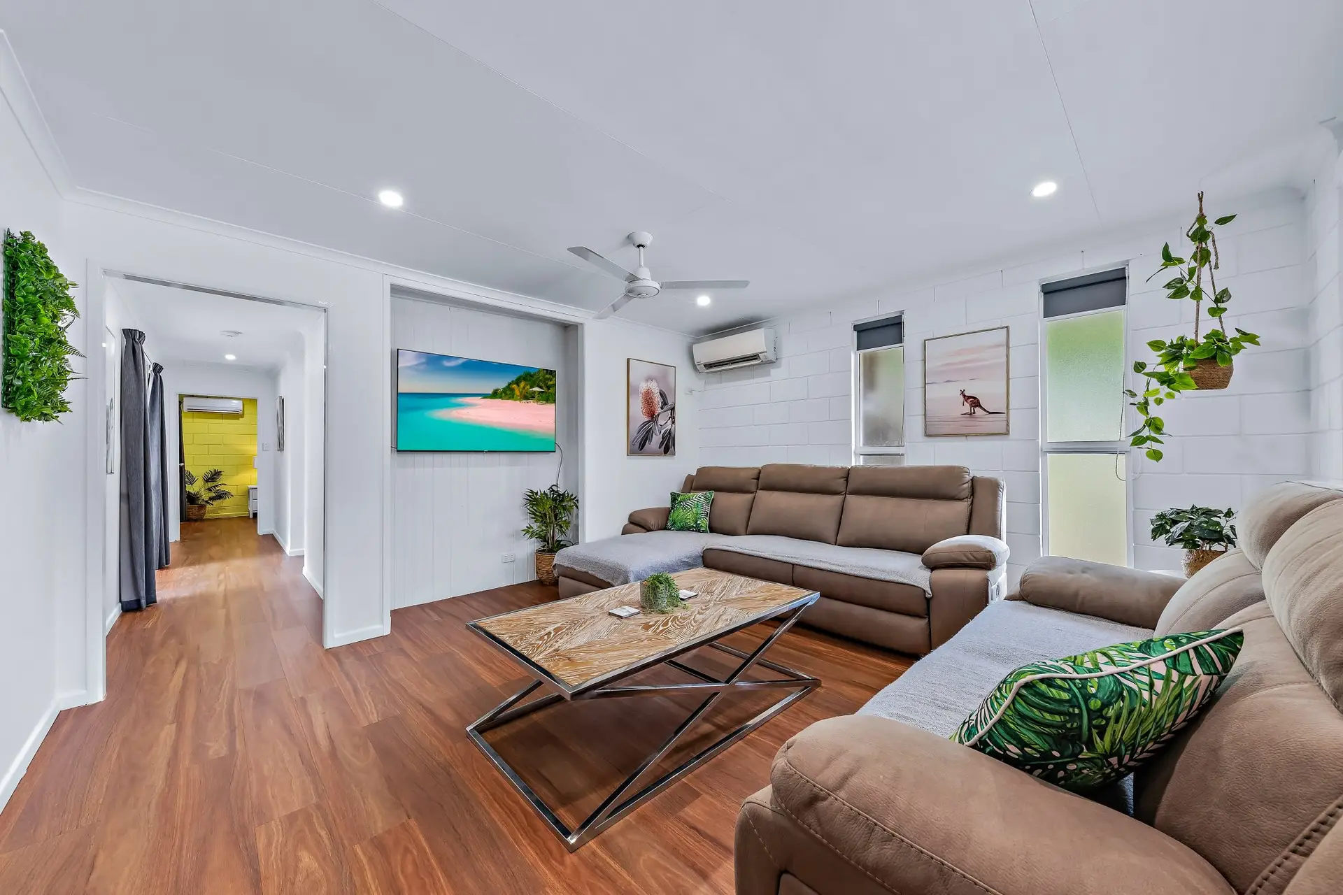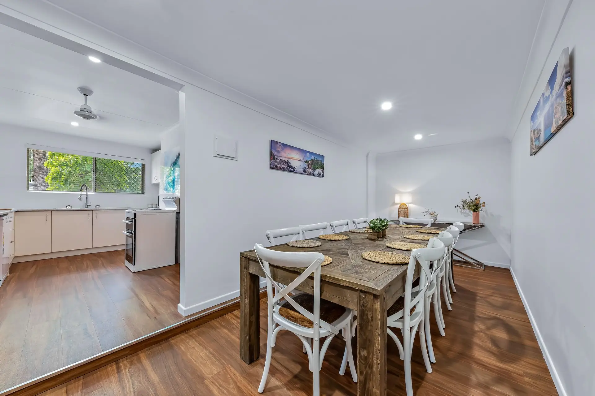 Discover tropical living in this spacious three-bedroom house—perfect for families or groups of up to ten guests. With two queen beds and three sets of bunks, everyone has room to unwind. The full kitchen includes an electric oven, stovetop, microwave, and dishwasher—ideal for self-contained stays. Enjoy alfresco dining on the large private deck overlooking the pool, surrounded by tropical gardens and Conway National Park. Pet-friendly and air-conditioned, it’s your ultimate Whitsundays retreat.