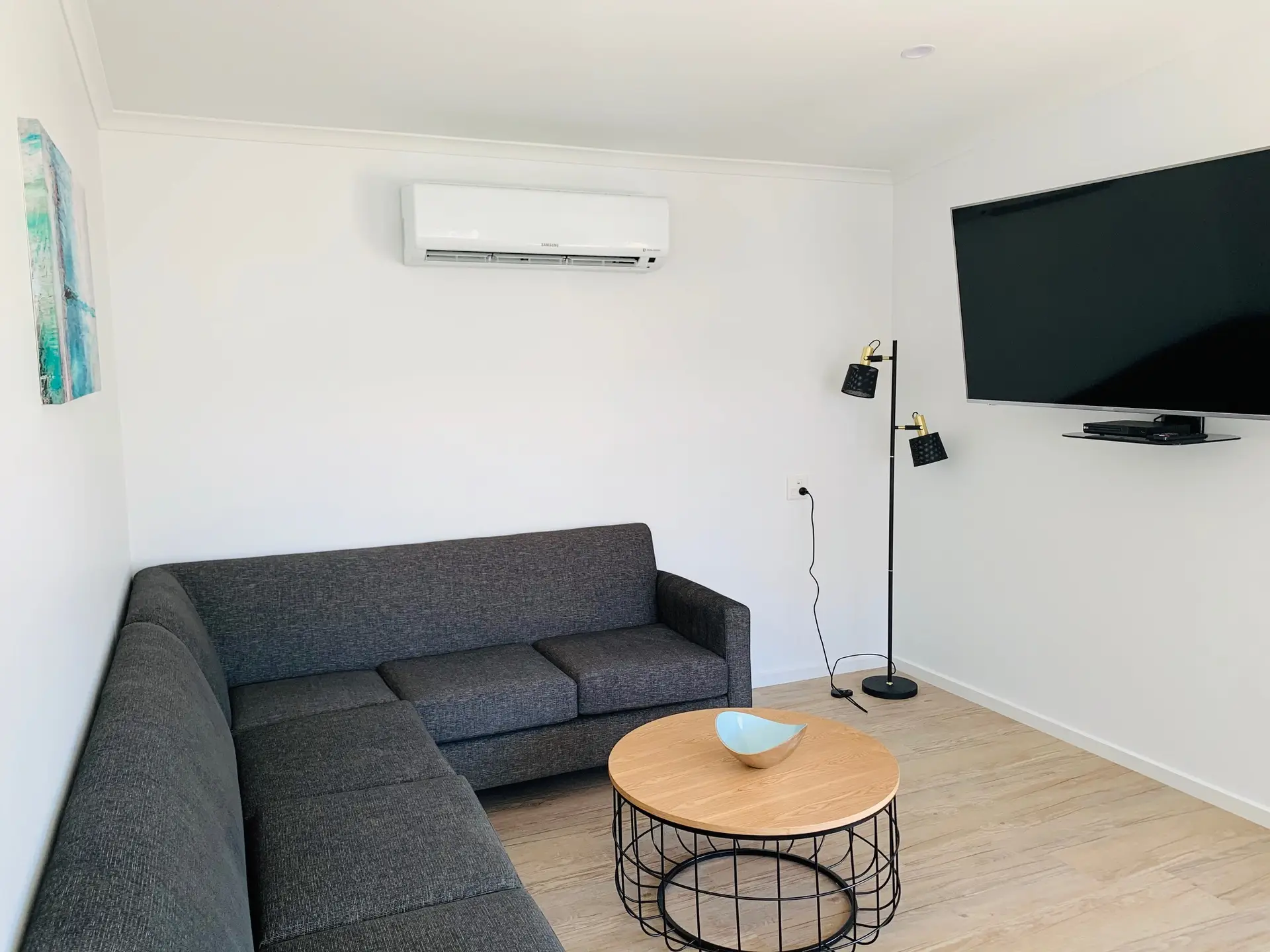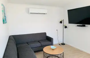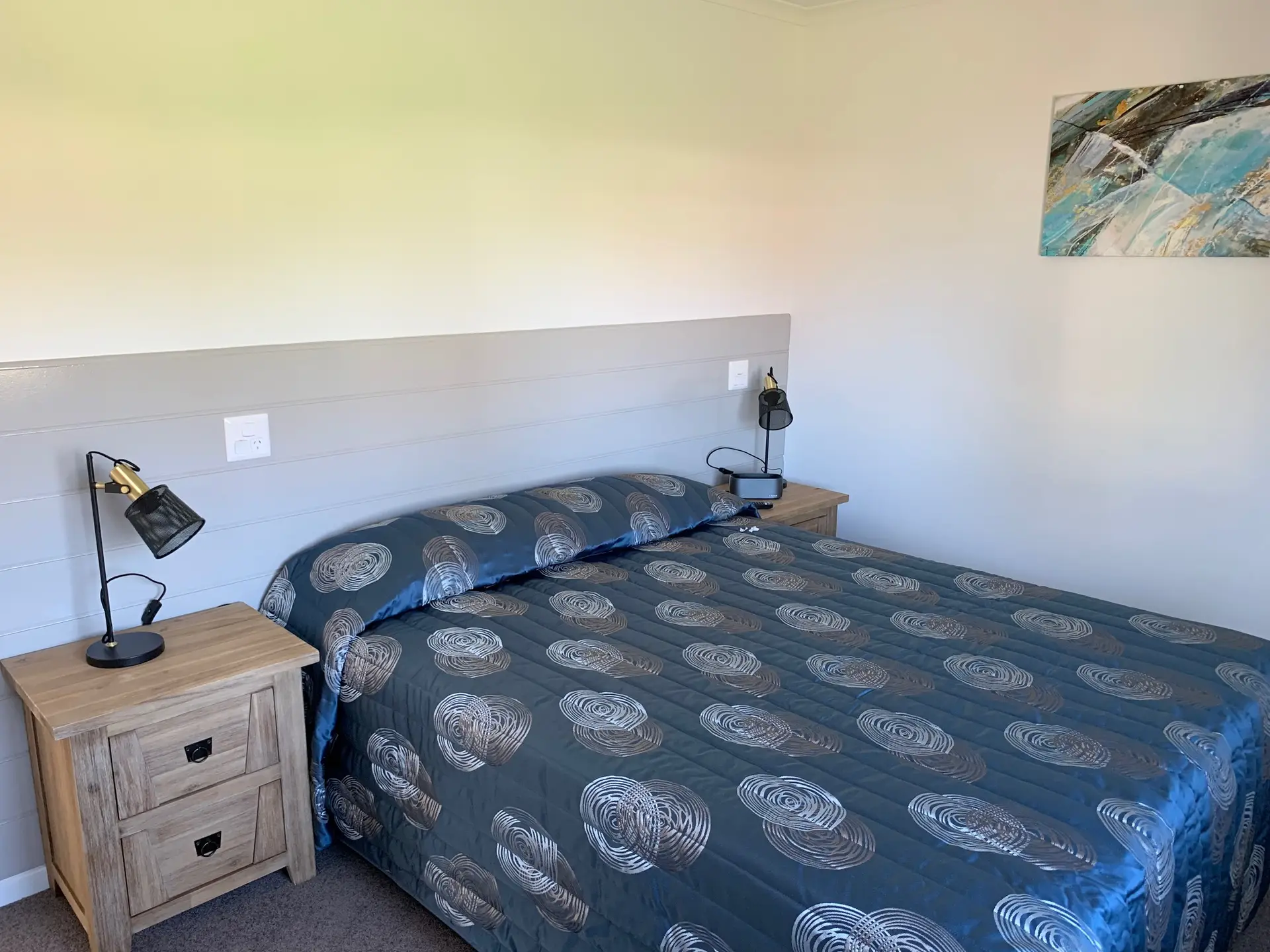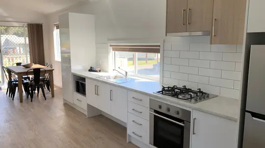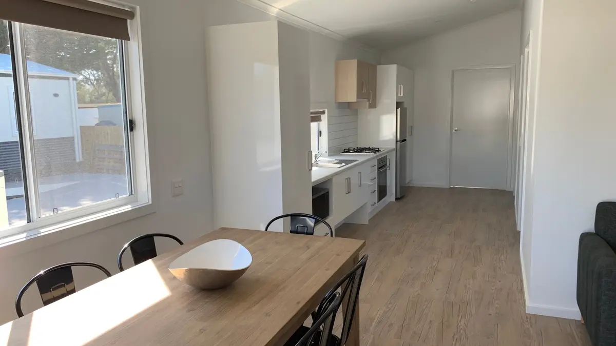 Thoughtfully designed for accessibility, this modern two-bedroom cabin sleeps up to five. The main bedroom has a queen bed, while the second offers a single bed and a set of single bunks. It includes a roll-in shower, grab rails, and spacious layout for ease of movement. The fully equipped kitchen features a gas oven, cooktop, microwave, and fridge. Air conditioning, a TV, and undercover deck overlooking the waterslide make it a comfortable and inclusive coastal retreat.
