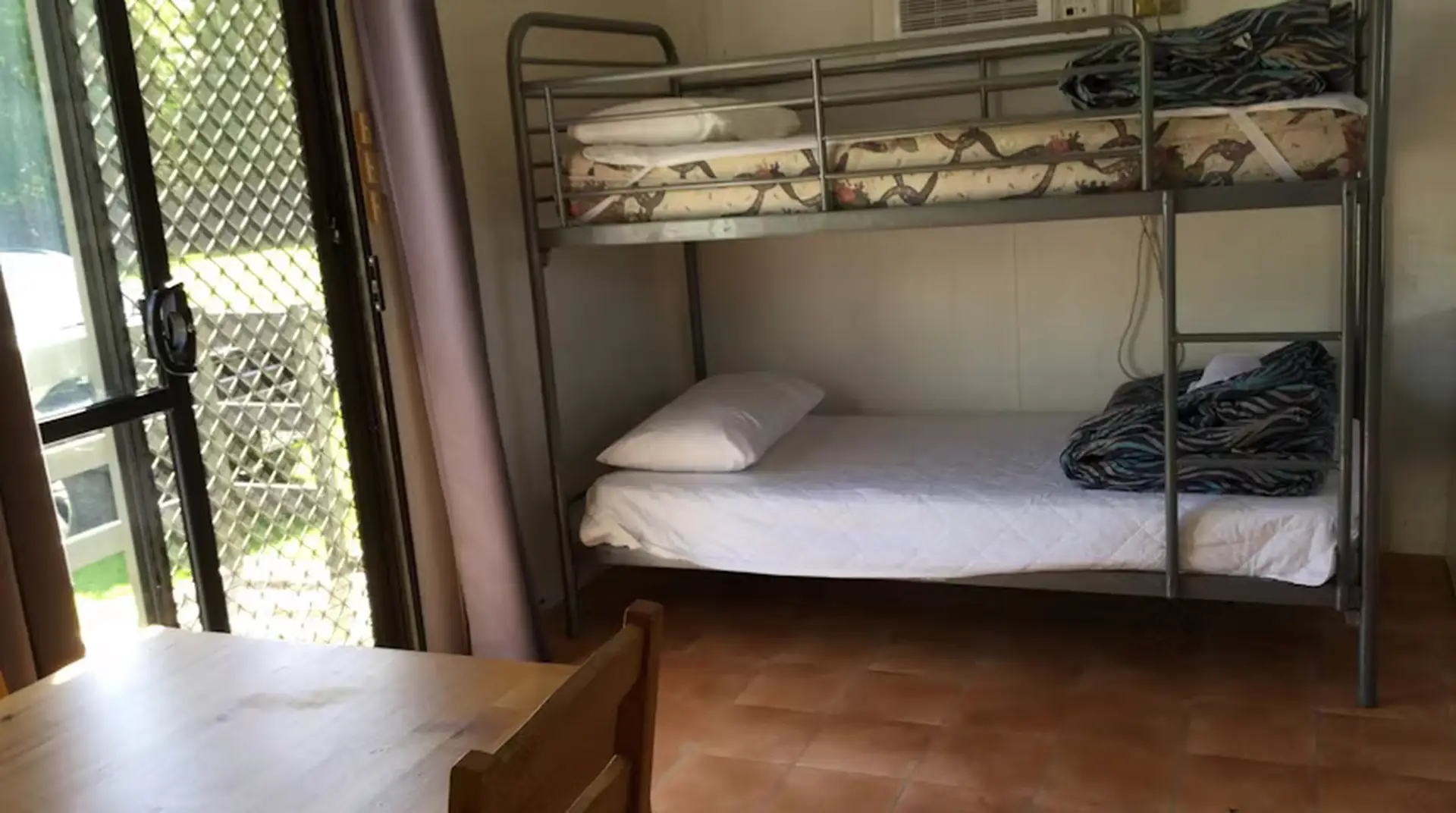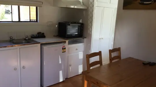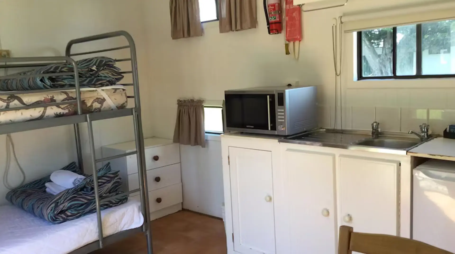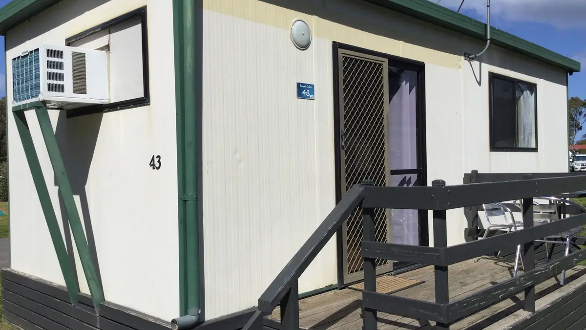 Comfortable and pet-friendly, this one-bedroom cabin is ideal for couples seeking a budget-friendly stay. Sleeping two with a double bed, it features a kitchenette with electric cooktop, microwave, full-size fridge, toaster, and kettle. The air-conditioned interior includes a dining area and TV, while the private deck offers a quiet spot to unwind. A simple and convenient option for travellers with pets.