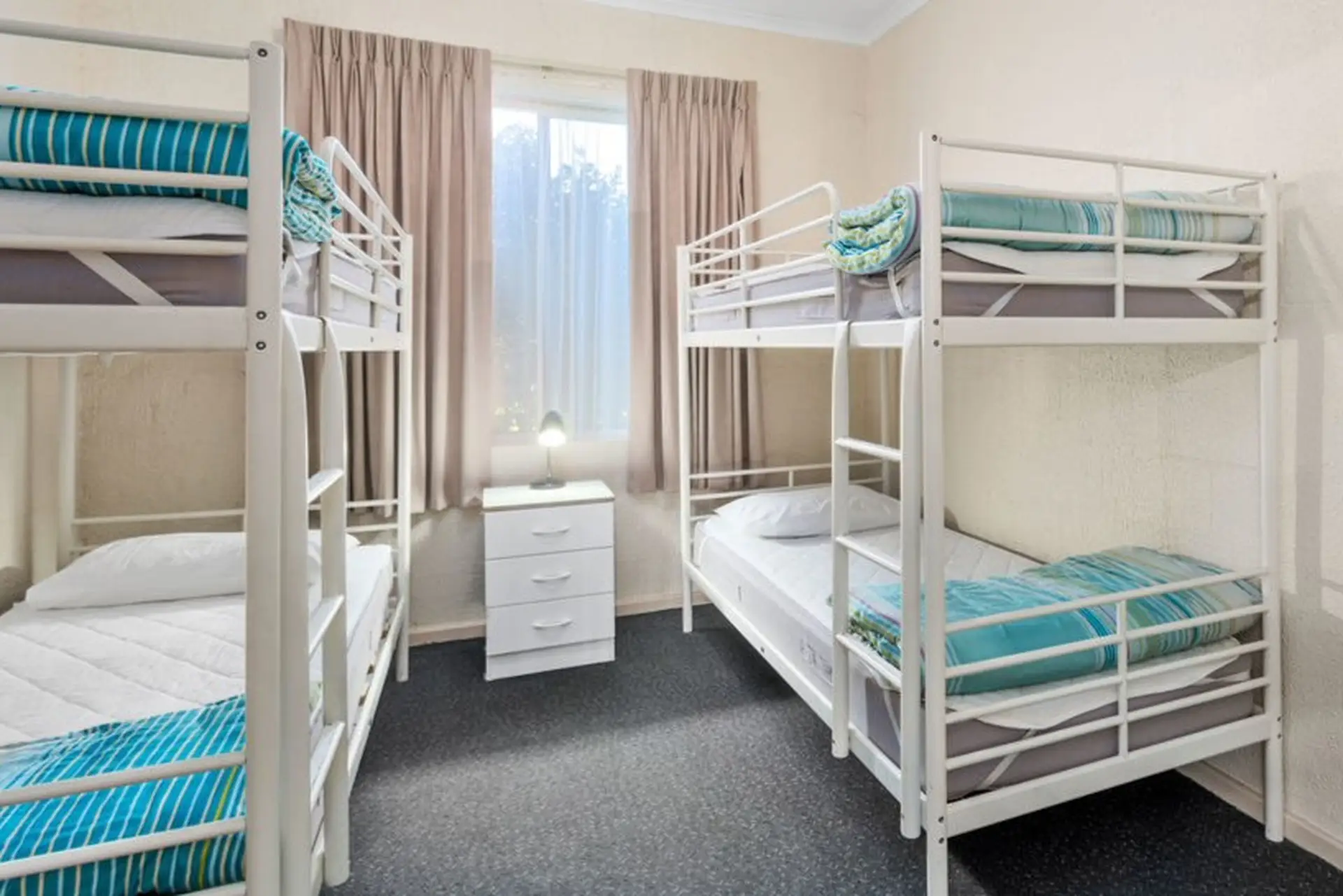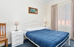This pet-friendly two-bedroom unit is perfect for families, sleeping up to six with a double bed and two sets of single bunks. The kitchenette includes an electric cooktop, microwave, full-size fridge, toaster, and kettle. Inside, enjoy air conditioning, a dining area, and TV, while outside features a fully fenced undercover patio with artificial turf and kennel. Positioned at the front of the park, it’s a great base for travellers with pets.