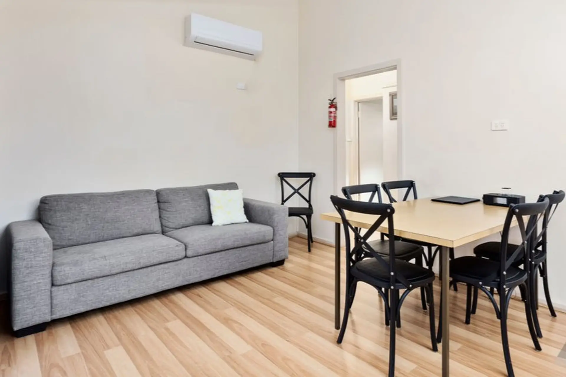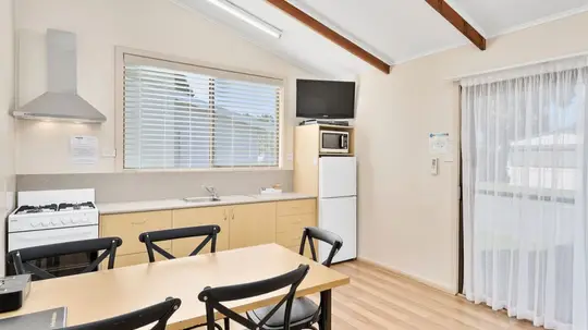 Set beside the pool in a lush grassy area, this two-bedroom cabin comfortably sleeps up to six with a queen bed and two sets of bunks. The self-contained kitchen includes a gas oven, stovetop, microwave, and full-size fridge. Relax in the air-conditioned living and dining areas or enjoy meals outdoors on the covered deck. With a modern bathroom and all the essentials, it’s a fantastic choice for families seeking fun and convenience.