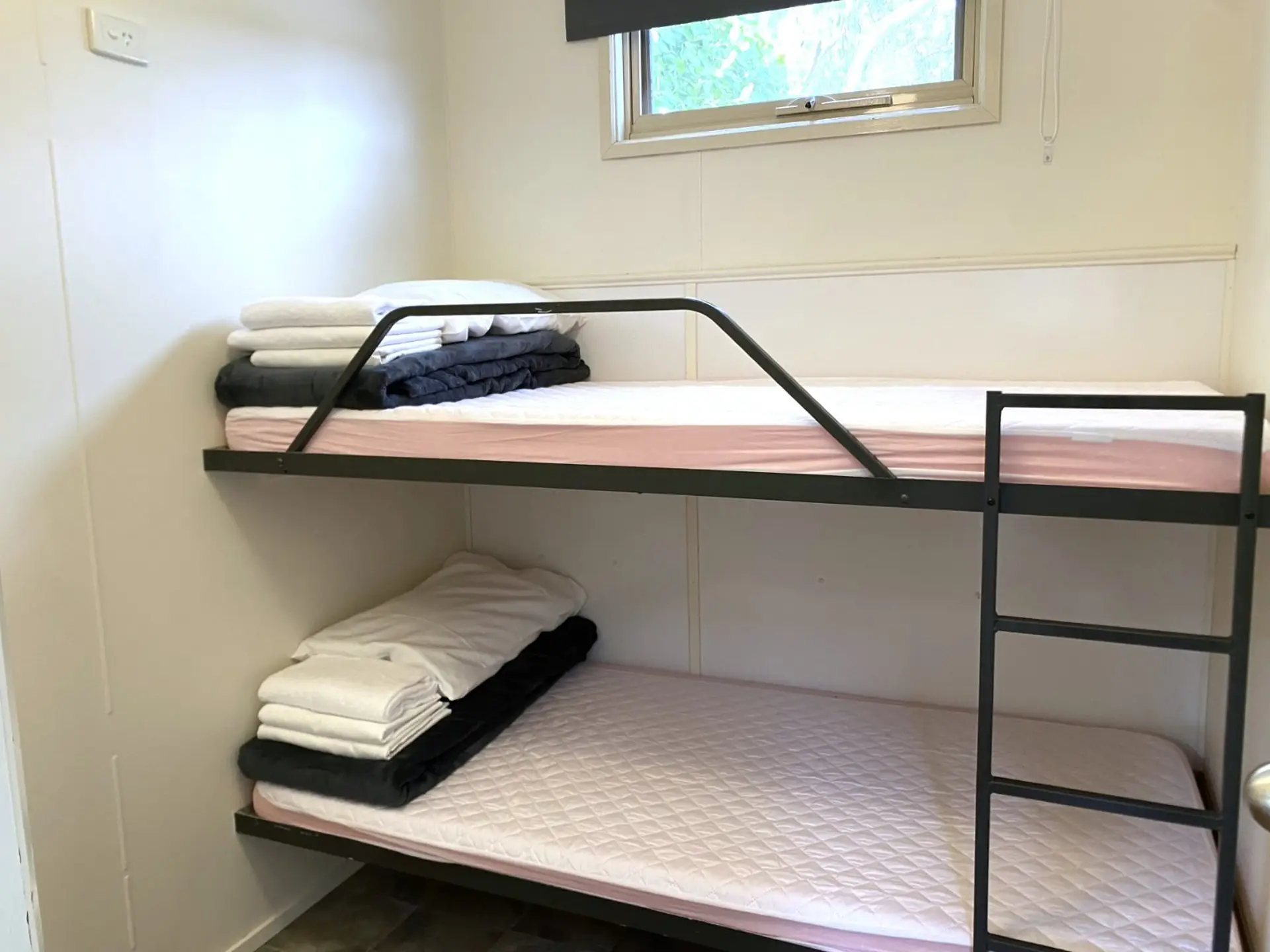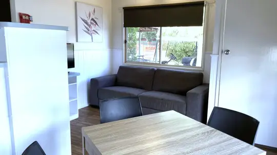 This two-bedroom unit sleeps up to four guests with a queen bed in the main bedroom and a set of single bunks in the second. It features a compact open-plan living area with reverse-cycle air conditioning, TV, and dining space. The kitchenette includes a cooktop, microwave, and full-size fridge.