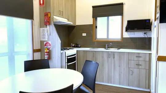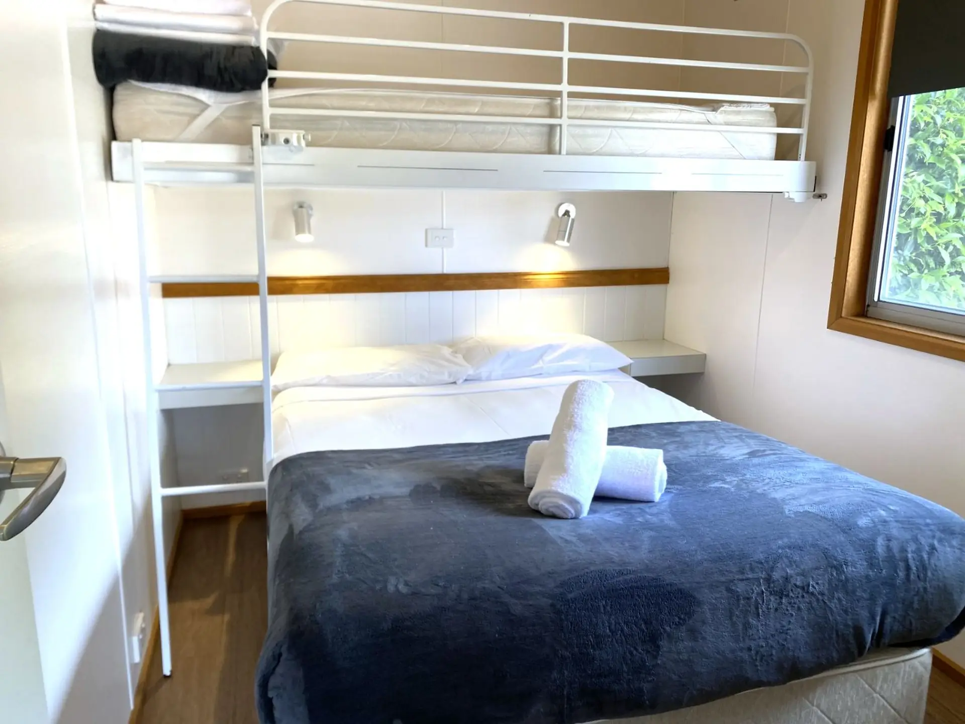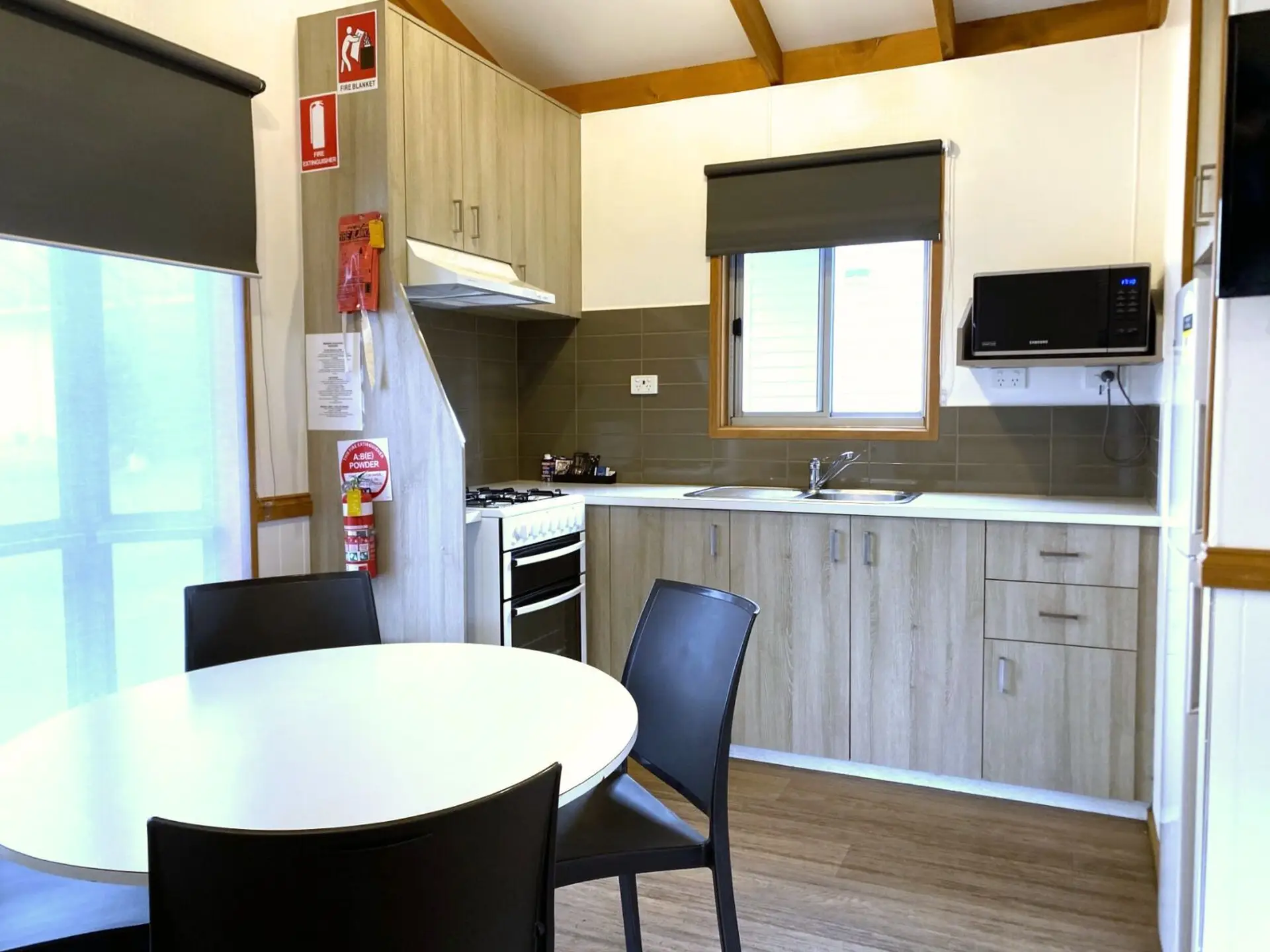 This two-bedroom unit sleeps up to five guests with a queen bed in one bedroom and a single-over-double bunk in the other. It features a compact kitchenette with cooktop, microwave, and fridge, plus a dining space, TV, and reverse-cycle air conditioning. Outside, an outdoor sitting area offers a spot to relax after a day out.