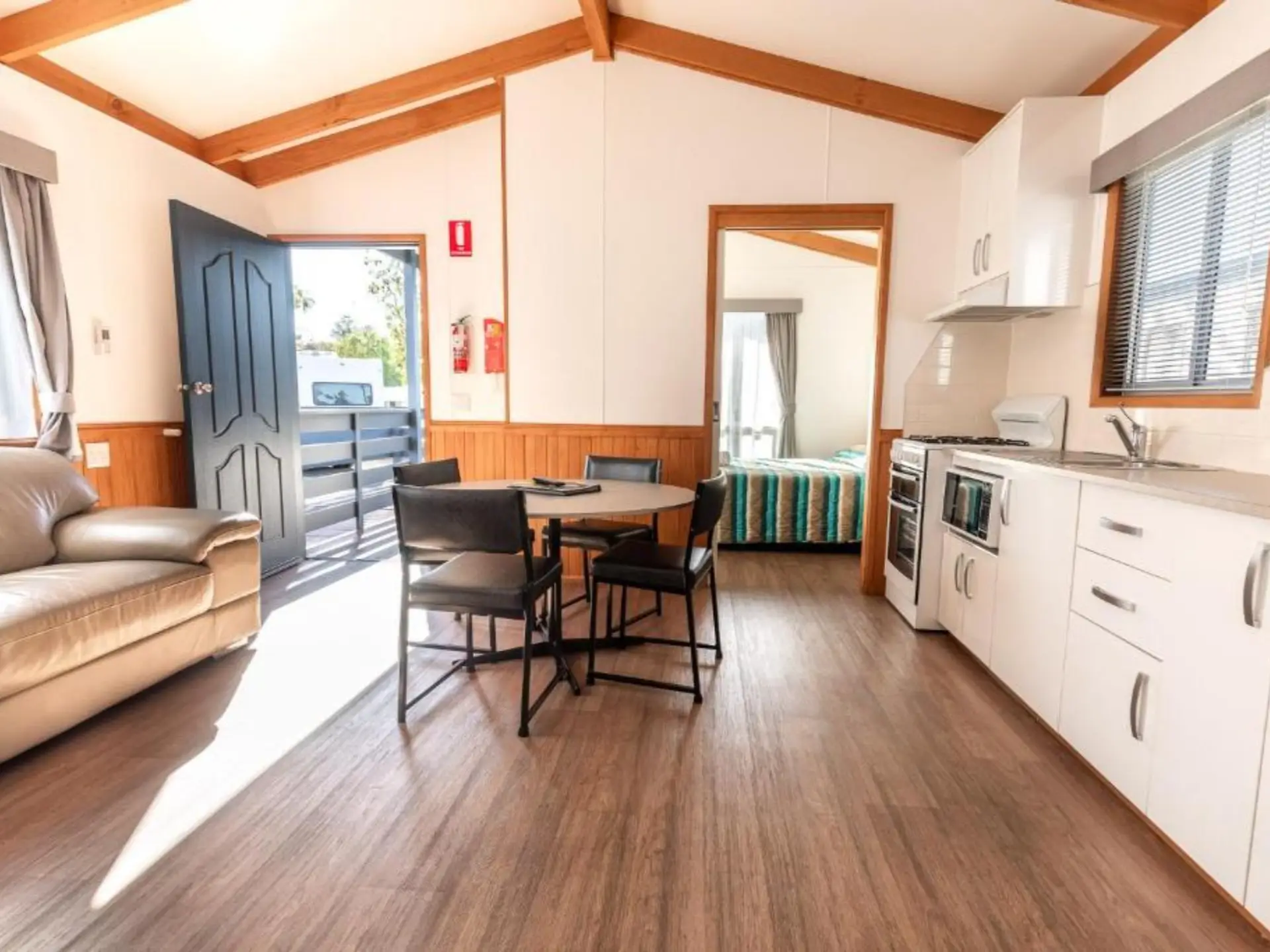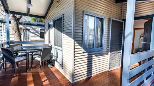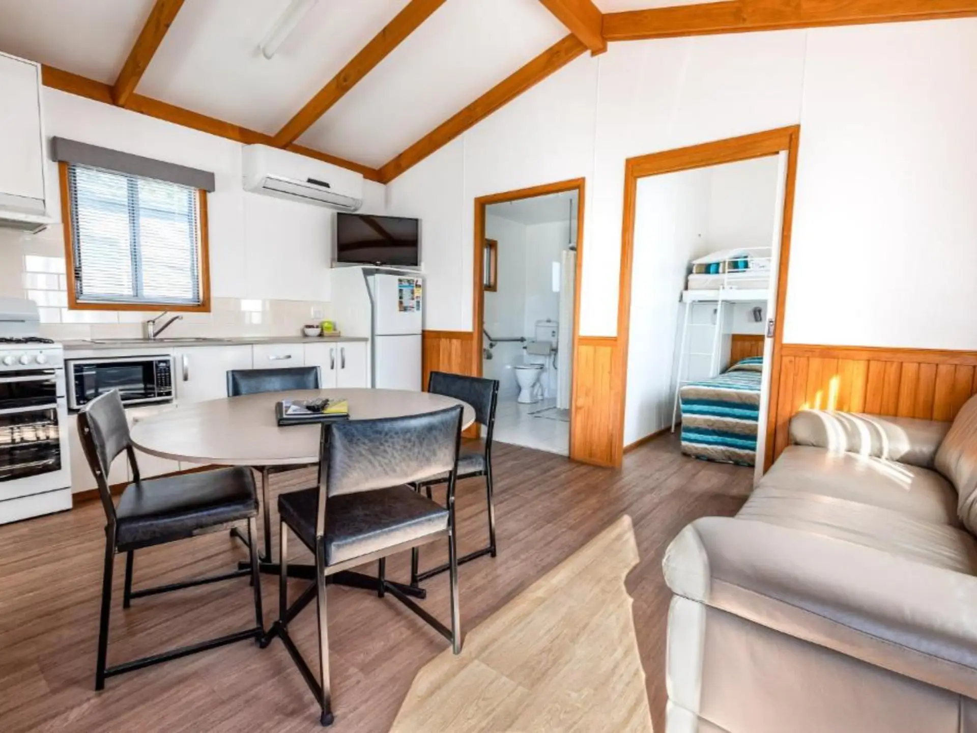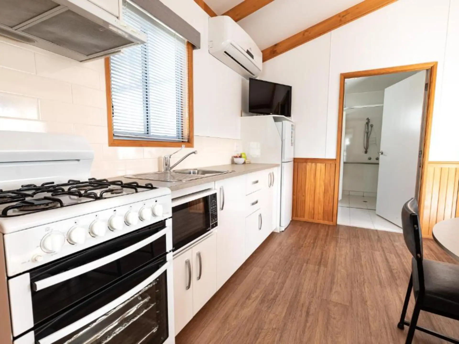 This two-bedroom cabin sleeps up to five guests with a queen bed in the main bedroom and double bed with single bunk above in the second. The open-plan layout features a full kitchen with gas oven, stovetop, microwave, and fridge, plus heating, cooling, and a TV. A private balcony with outdoor dining overlooks the pool or rockpool, just steps from the BBQ area and park facilities.