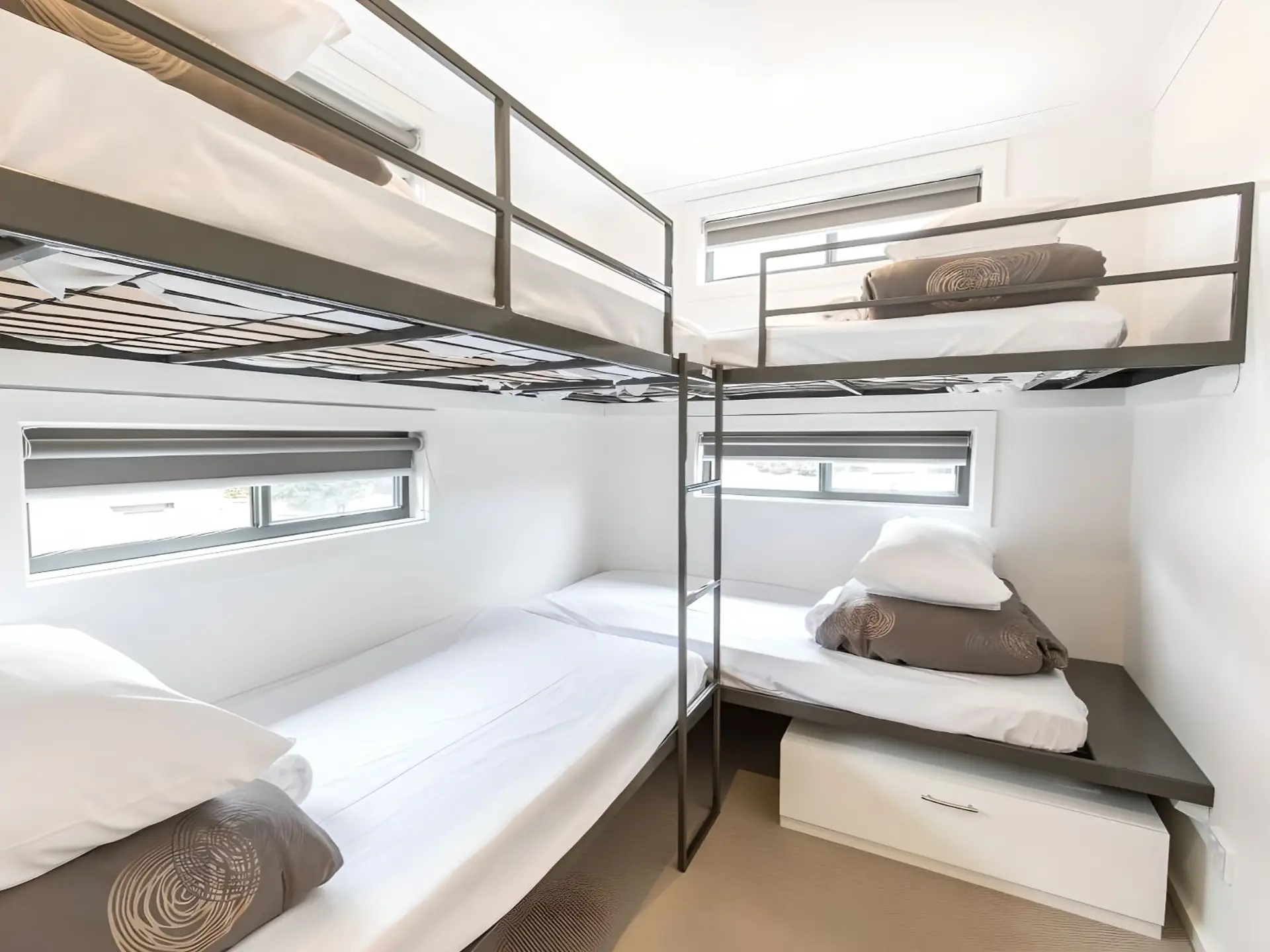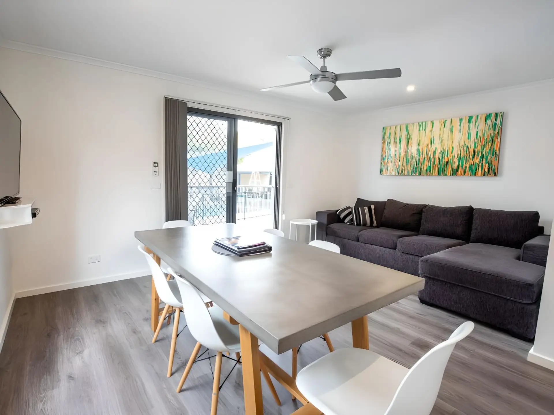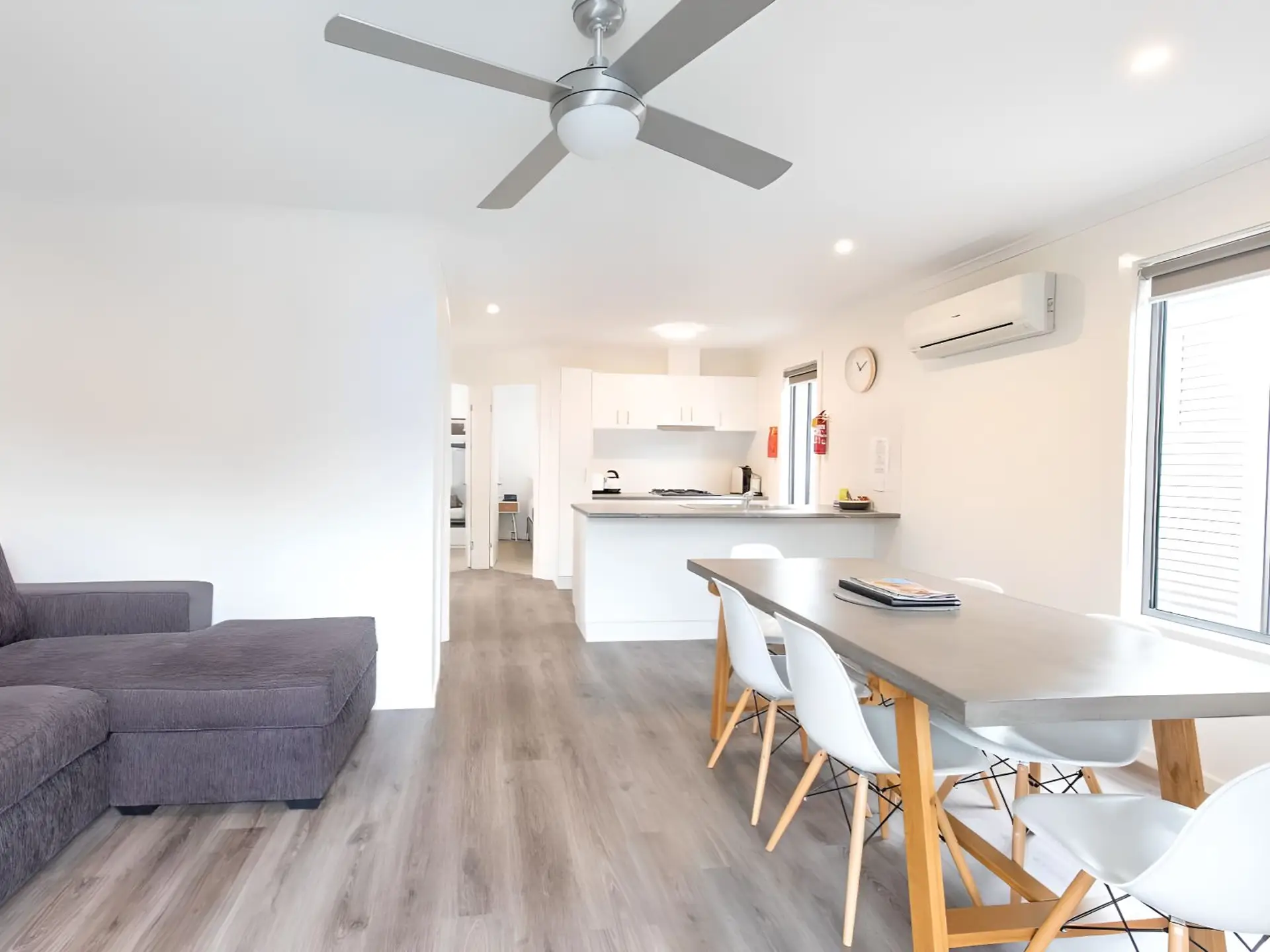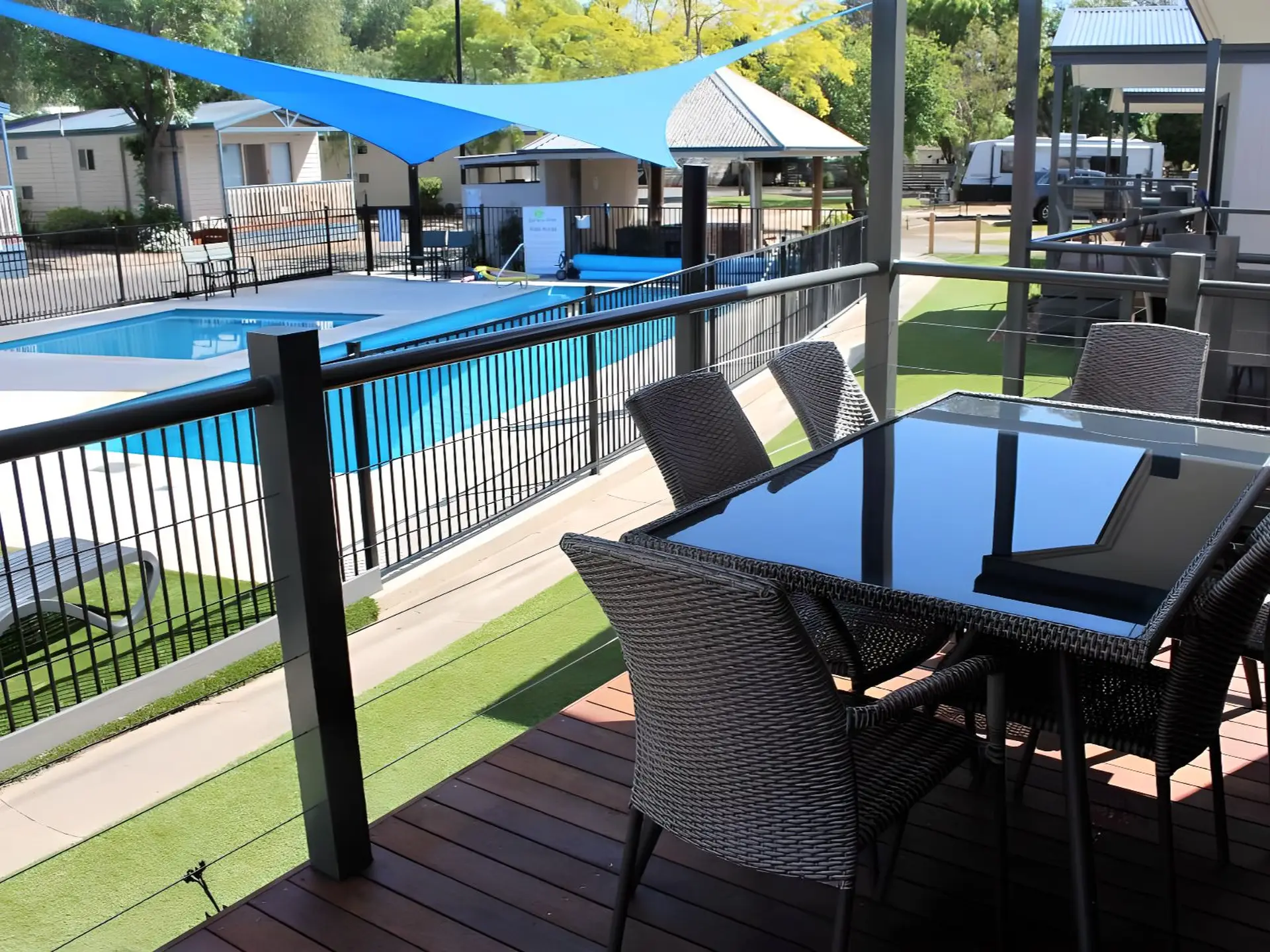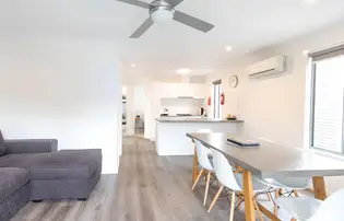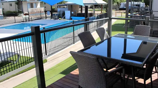 This two-bedroom villa sleeps up to six guests with a queen bed in the main bedroom and two sets of single bunks in the second. The open-plan layout features a full kitchen with gas oven, stovetop, microwave, and fridge, plus heating, cooling, and a TV. A private balcony with outdoor dining overlooks the pool or rockpool, just steps from the BBQ area and park facilities.