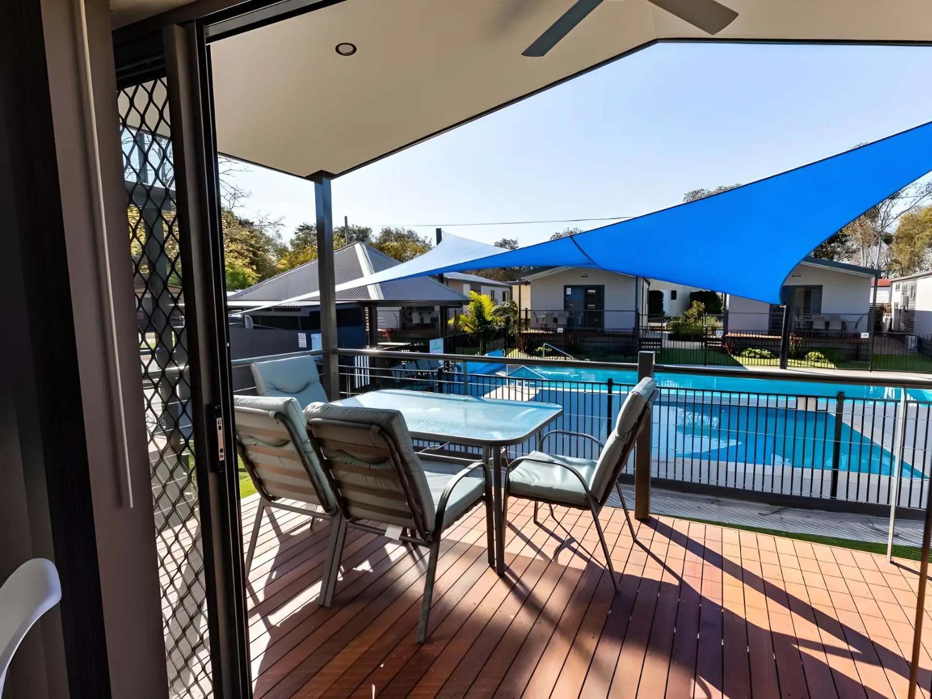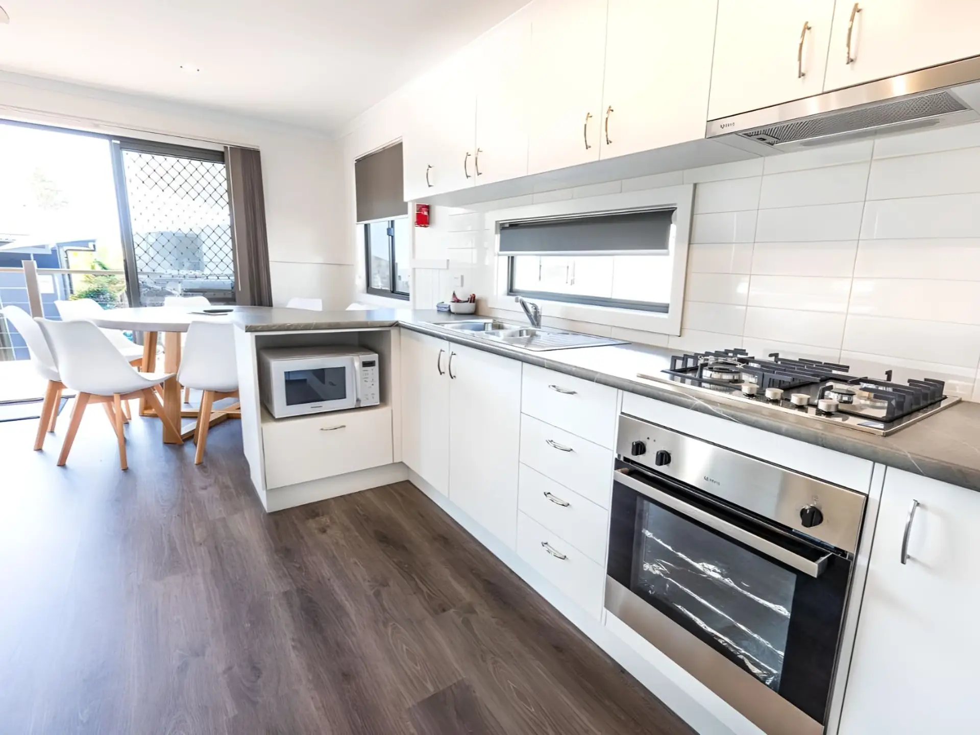 This modern three-bedroom villa sleeps up to eight guests, featuring a queen bed in the main bedroom and double beds with single bunks above in the second and third bedrooms. The open-plan living area includes a full kitchen with a gas oven, stovetop, microwave, and fridge, along with air conditioning, heating, and a TV. Step onto the private balcony with an outdoor dining set, just a few steps from the pool and BBQ area.