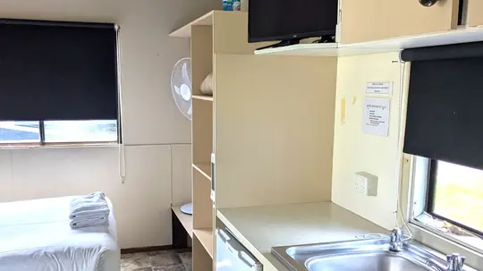 This pet-friendly economy studio offers practical comfort for up to two guests. Featuring a double bed, dining area, and air conditioning. The kitchenette includes a gas stovetop, microwave, toaster, and bar fridge, making light meal prep easy. A private bathroom and TV complete the essentials for a convenient, self-contained visit.