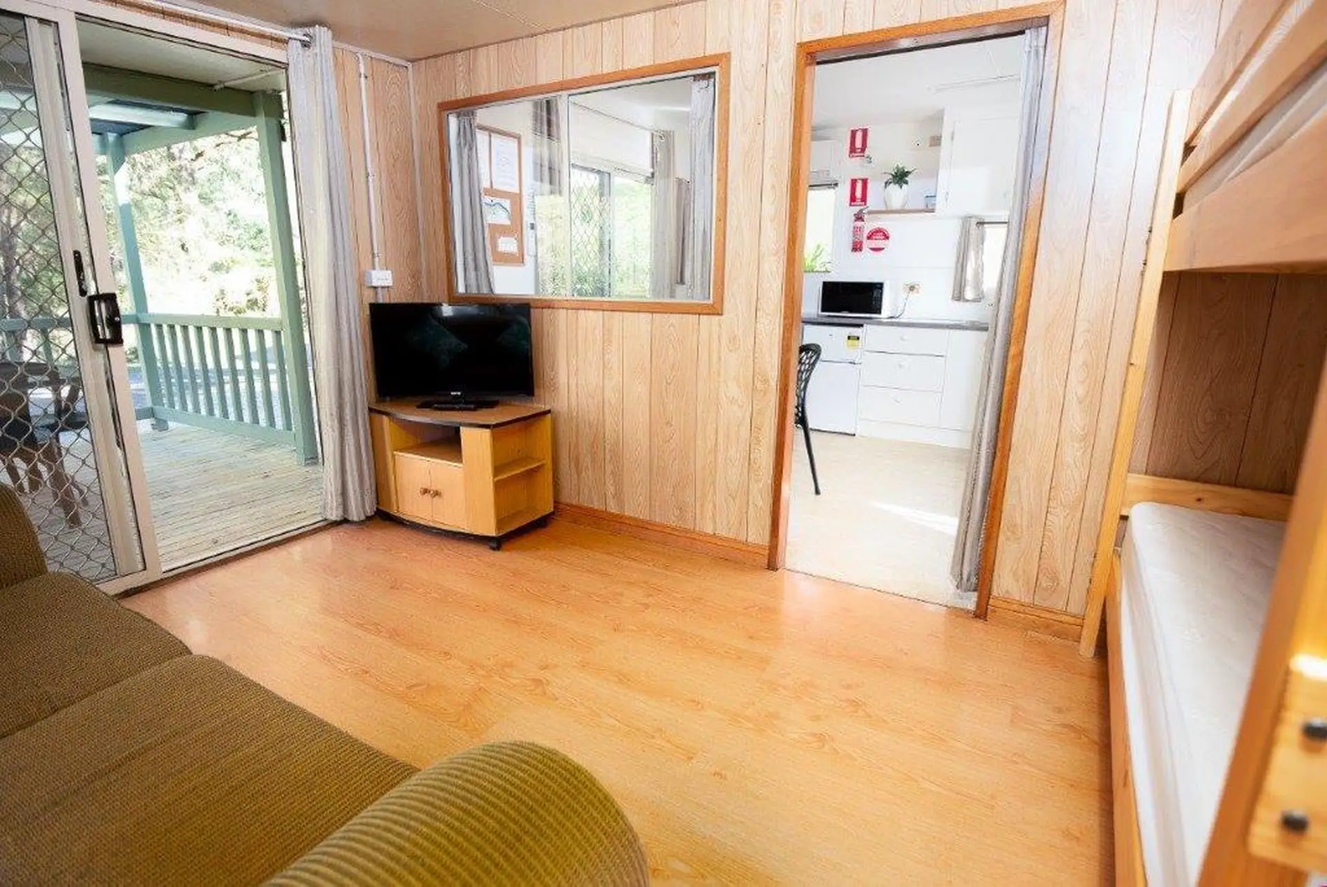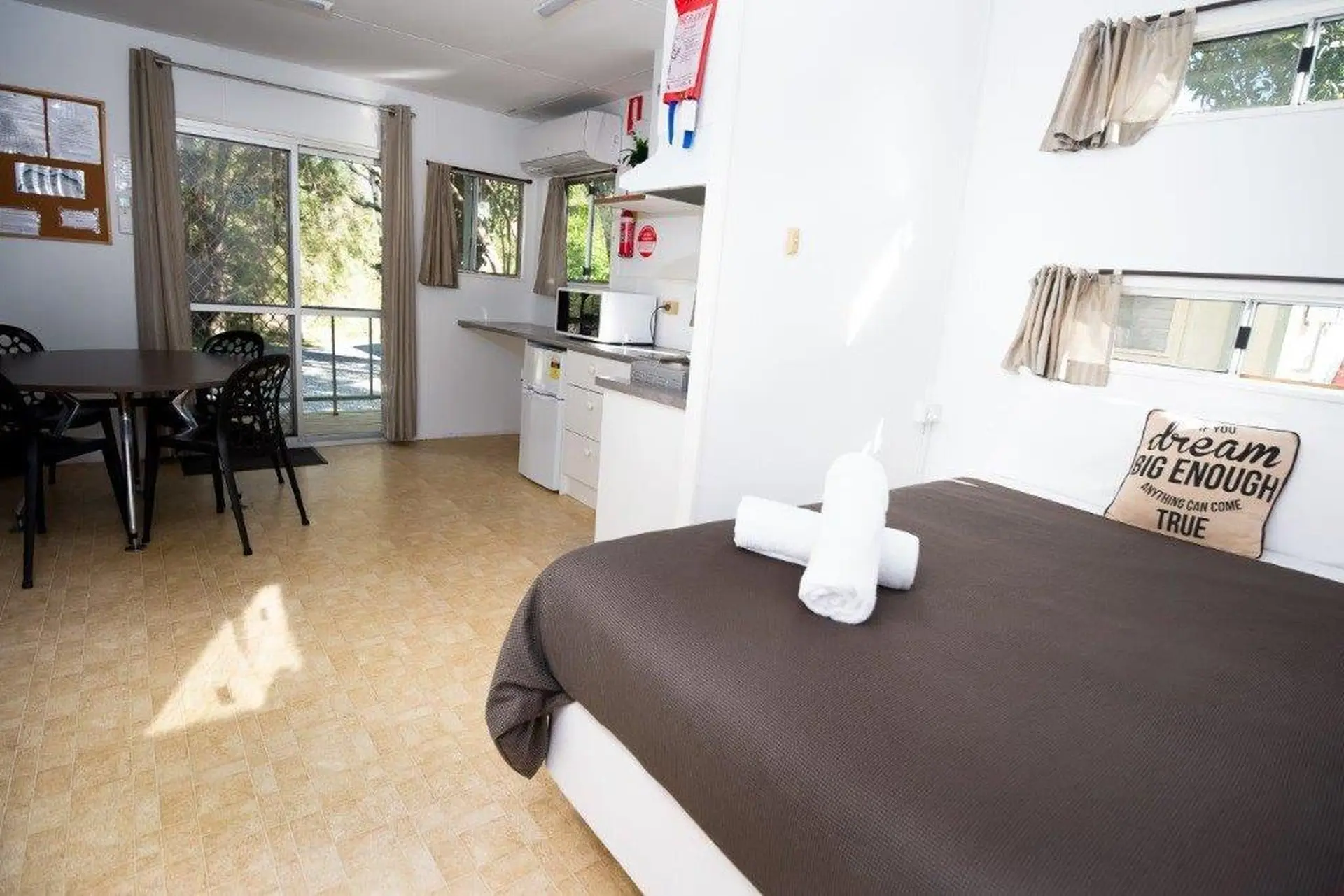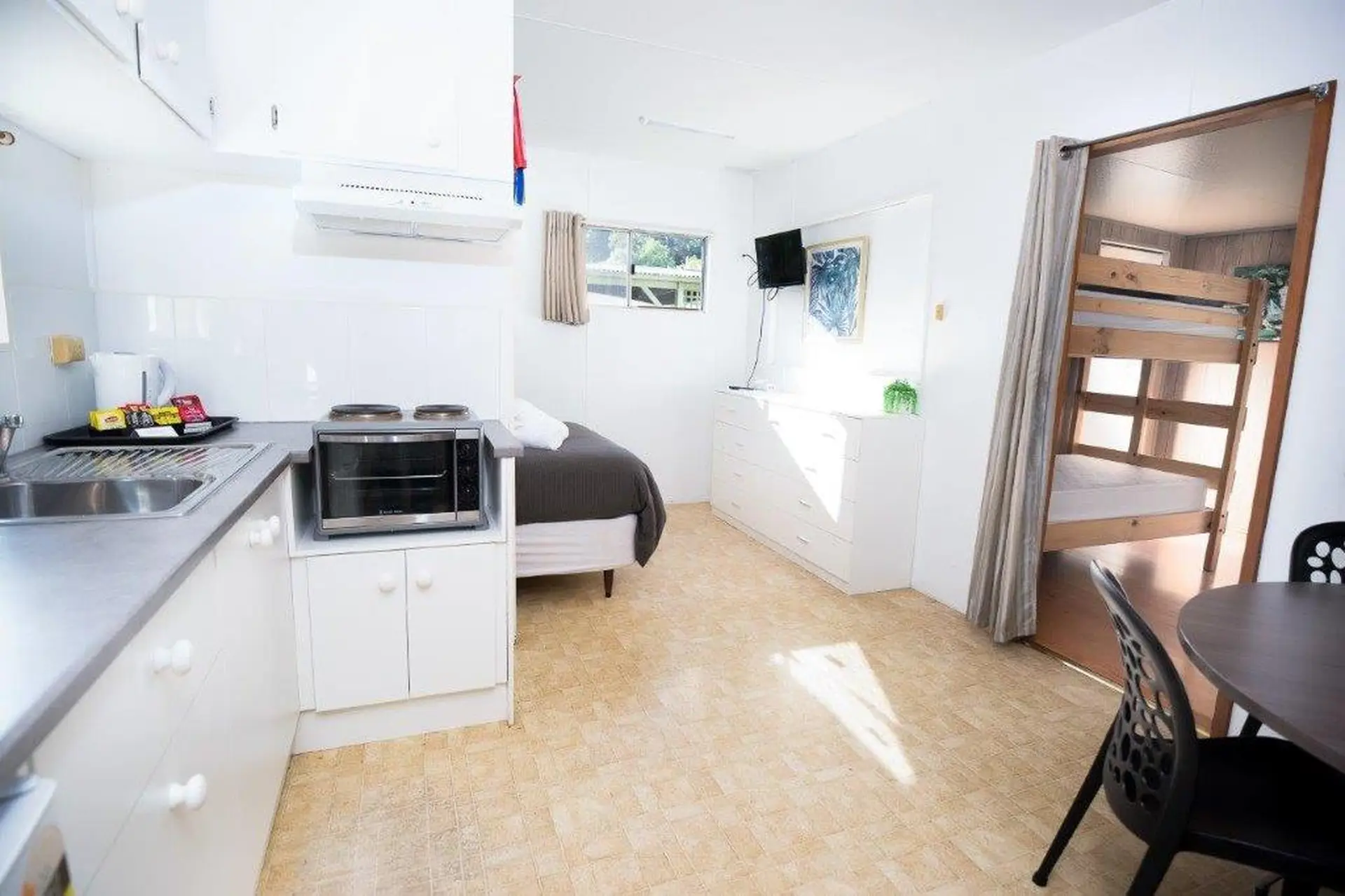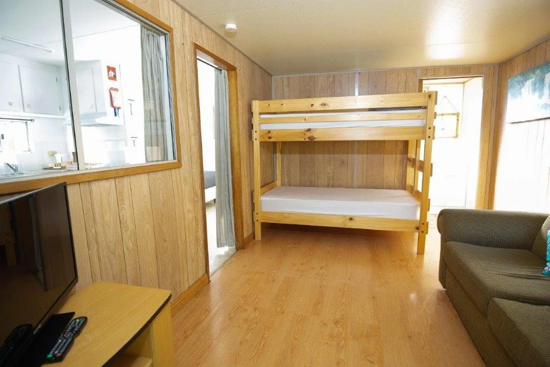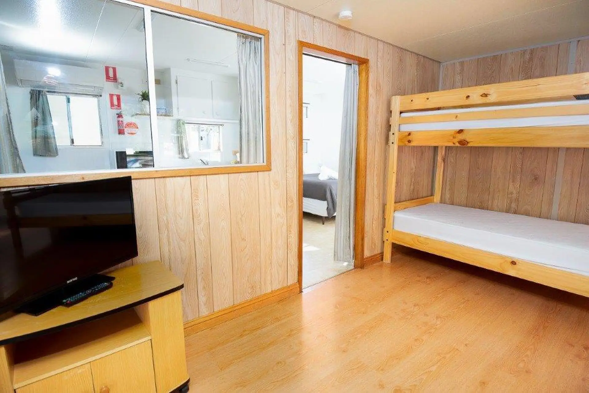 1 Double bed with 1 Bunk Bed (2 x single Beds) in adjacent room No Dogs Allowed , Sleeps up to 4 people , Kitchen facilities, , Split system air-conditioner. All Linen and towels are provided for the double bed. B.Y.O. pillows, sheets, blankets and towels for the bunk beds. For an additional fee single bedding can be hired from reception.