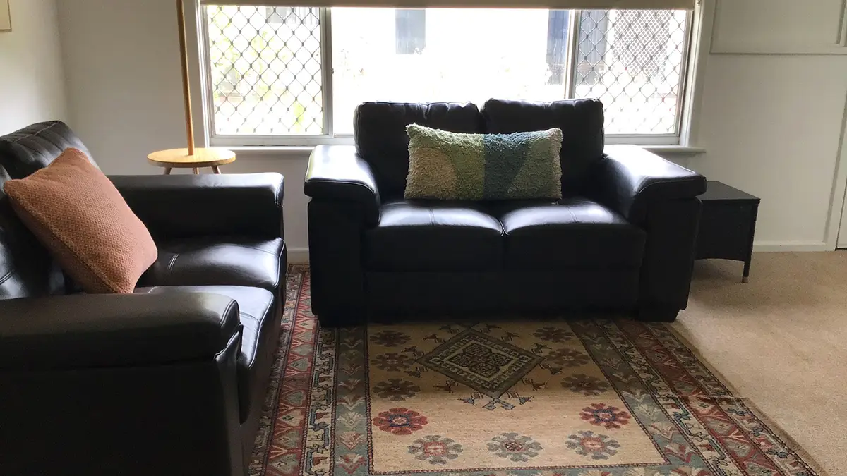 This two-bedroom house sleeps up to three guests with one double bed and one single bed. It includes a full kitchen with gas oven, microwave, and full-size fridge, plus a dining area and air-conditioned living space. Guests have access to a private bathroom, outdoor setting, and verandah.