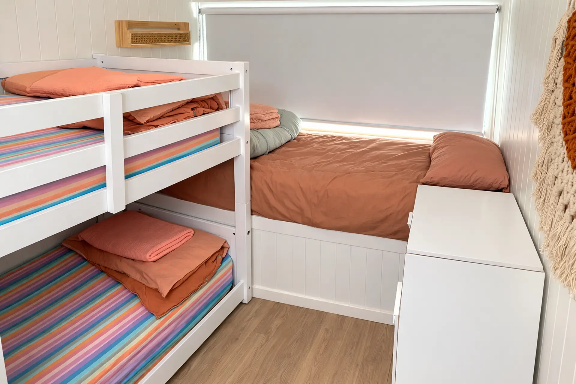 Inside, you’ll find a welcoming living space in the air-conditioned annex, perfect for relaxing after a day at the beach. The enclosed verandah kitchenette comes fully equipped with electric cooktop, dishwasher and appliances, making holiday meals simple and convenient.