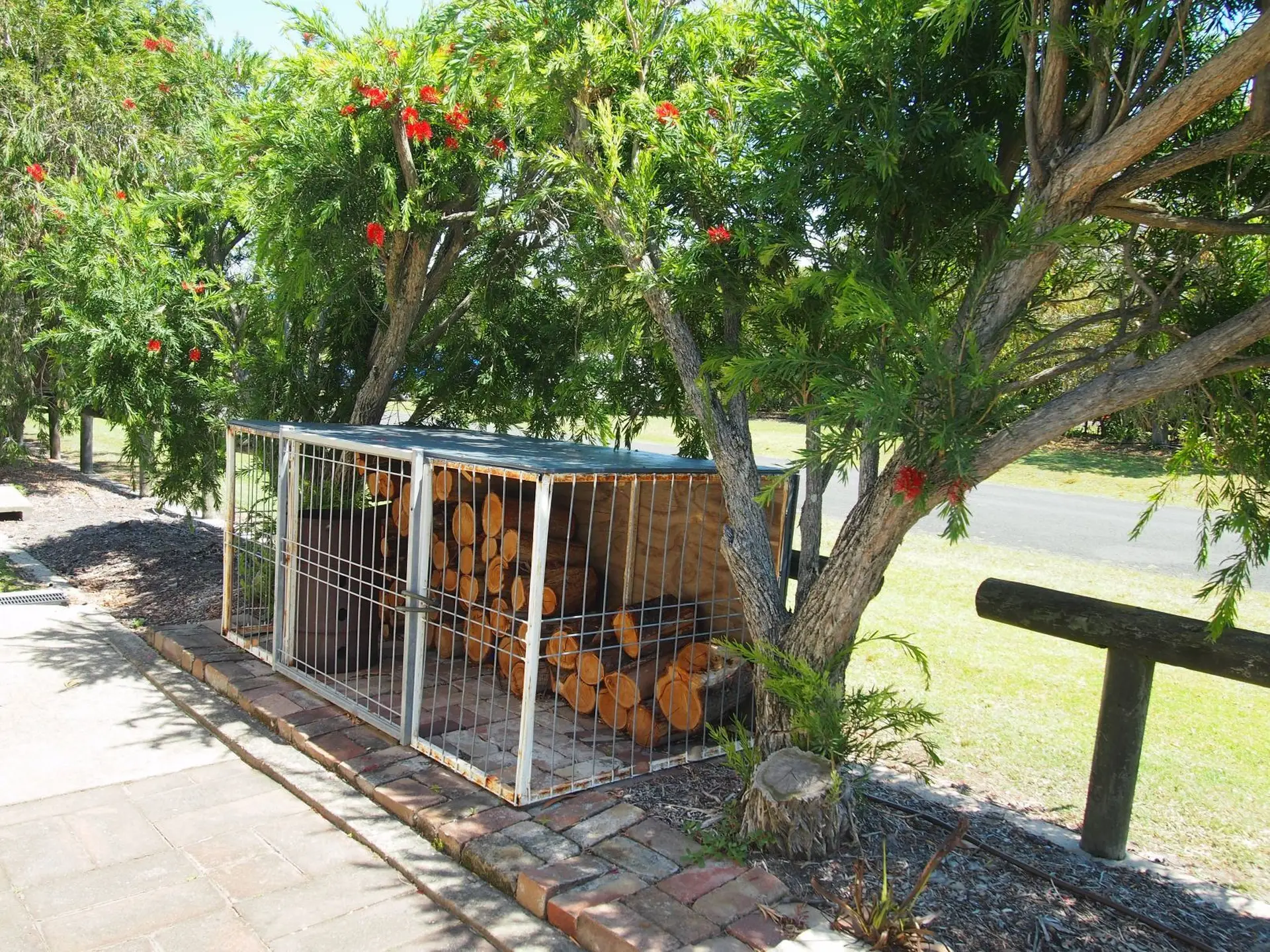 - Outdoor timber picnic table, fire pit, lockable garden shed, and wood storage cage.