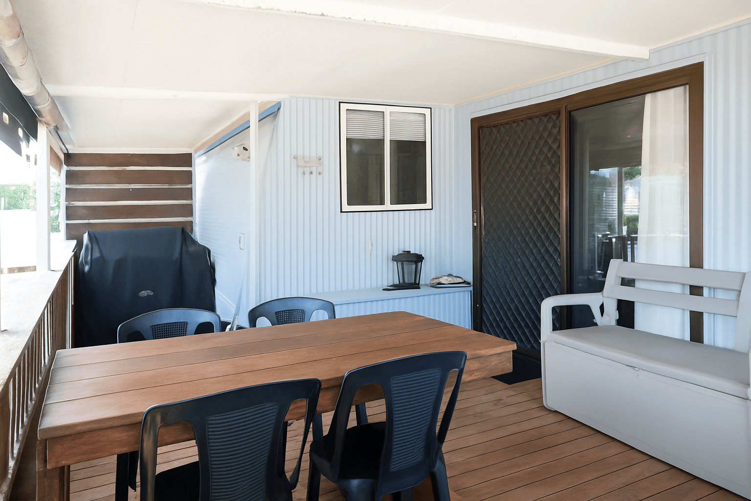 · Expansive covered deck with outdoor dining, BBQ, storage bench, and zippable café blinds