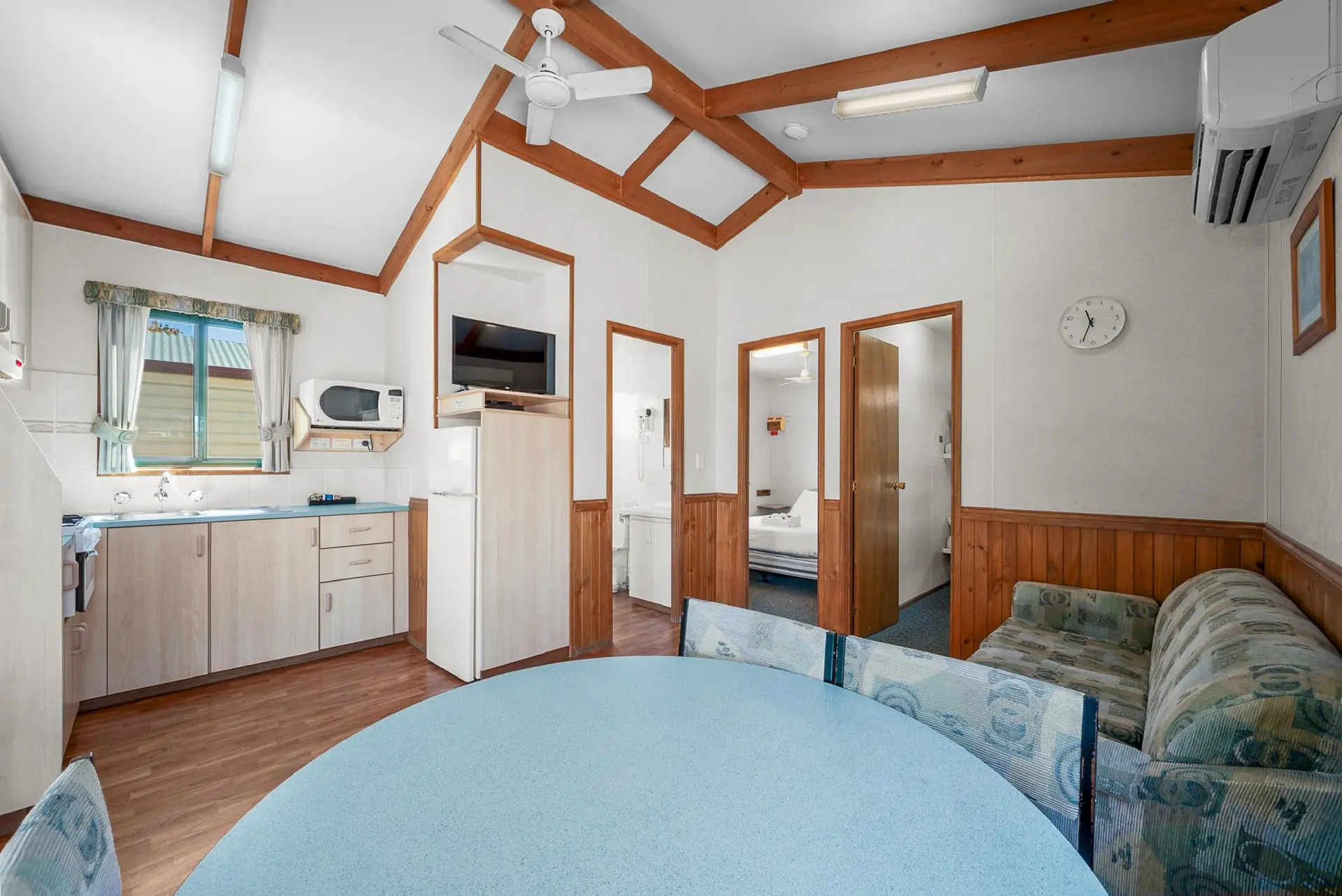 Perfect for families or groups, this spacious cabin sleeps up to six guests across two bedrooms with a queen bed in the main and two sets of bunk beds in the second. The air-conditioned living area includes a sofa, dining table, and TV. A well-equipped kitchenette features a large fridge, microwave, and stovetop grill for easy meal prep. Enjoy all the comforts of home just minutes from Albury’s attractions.
