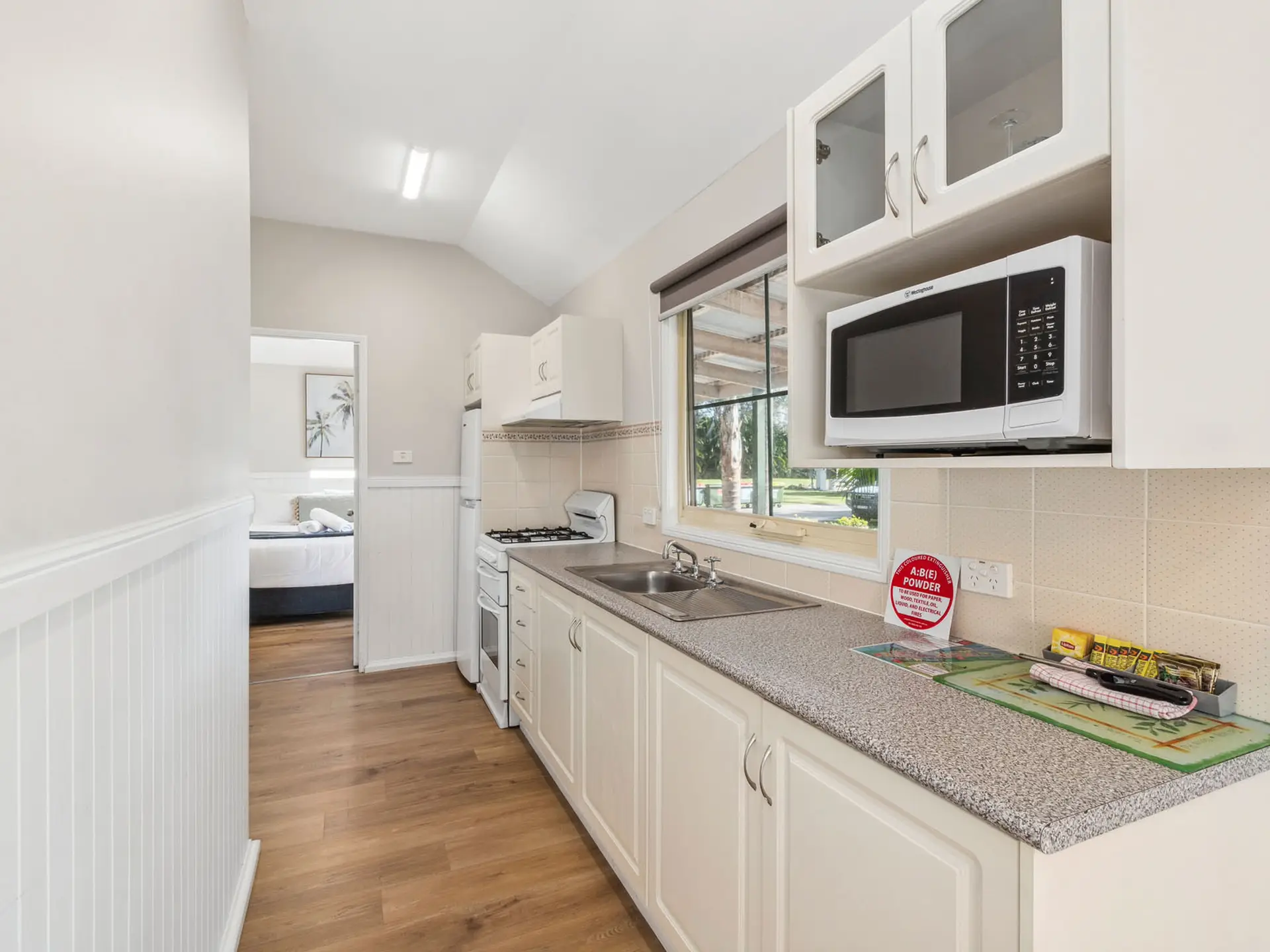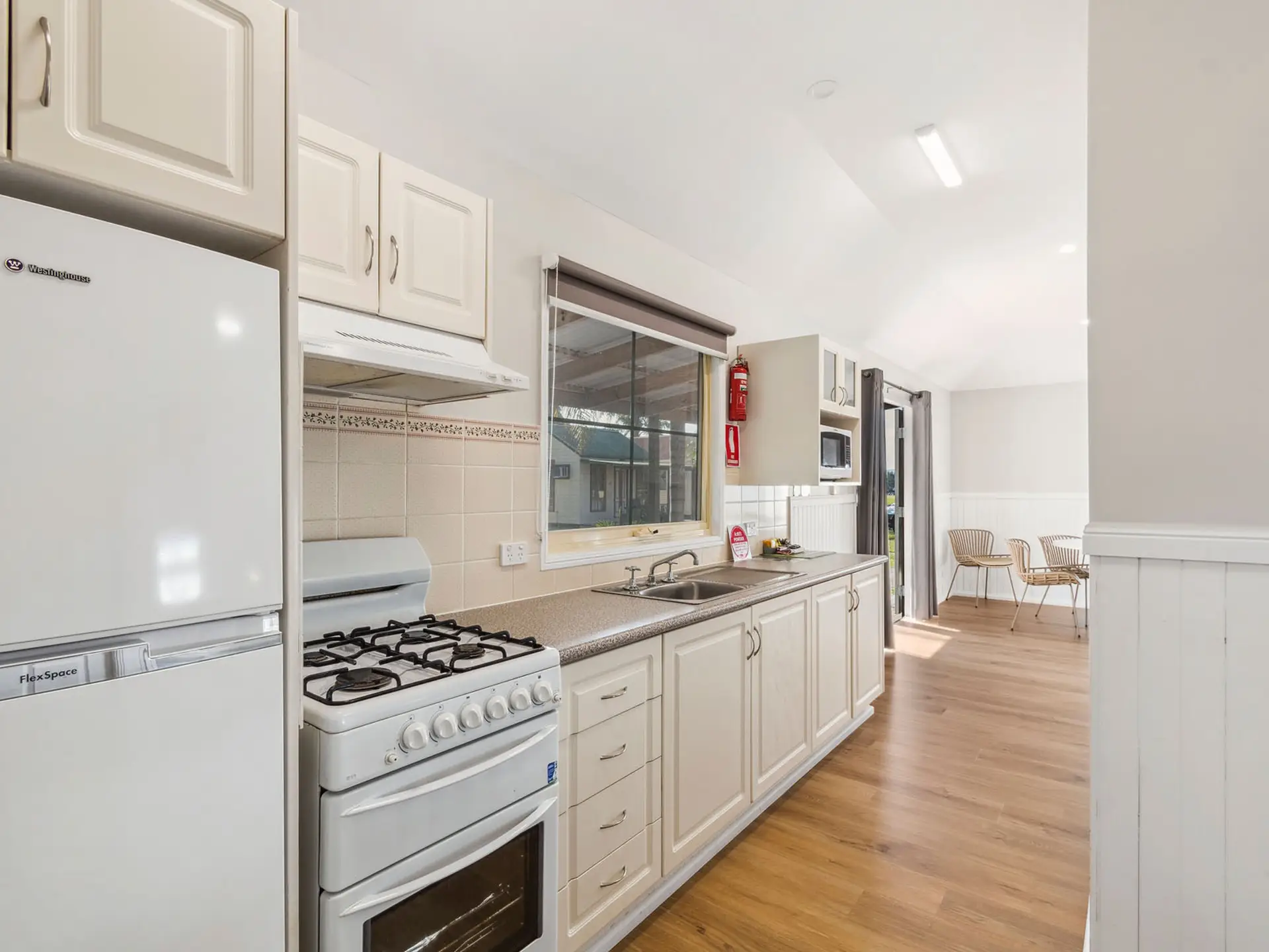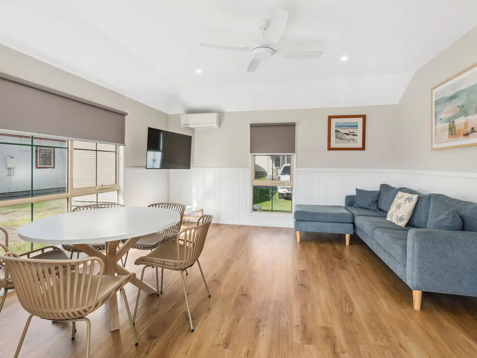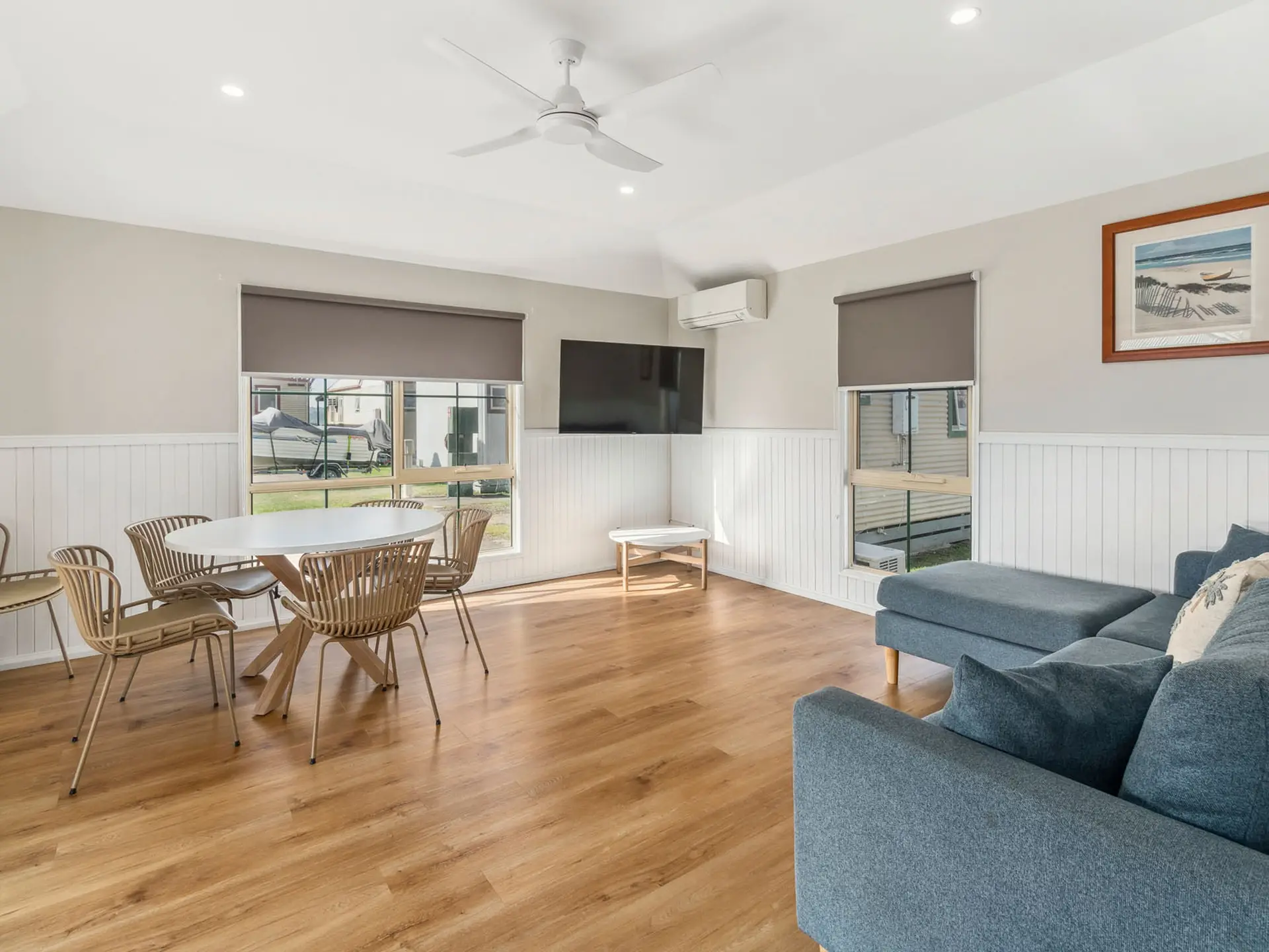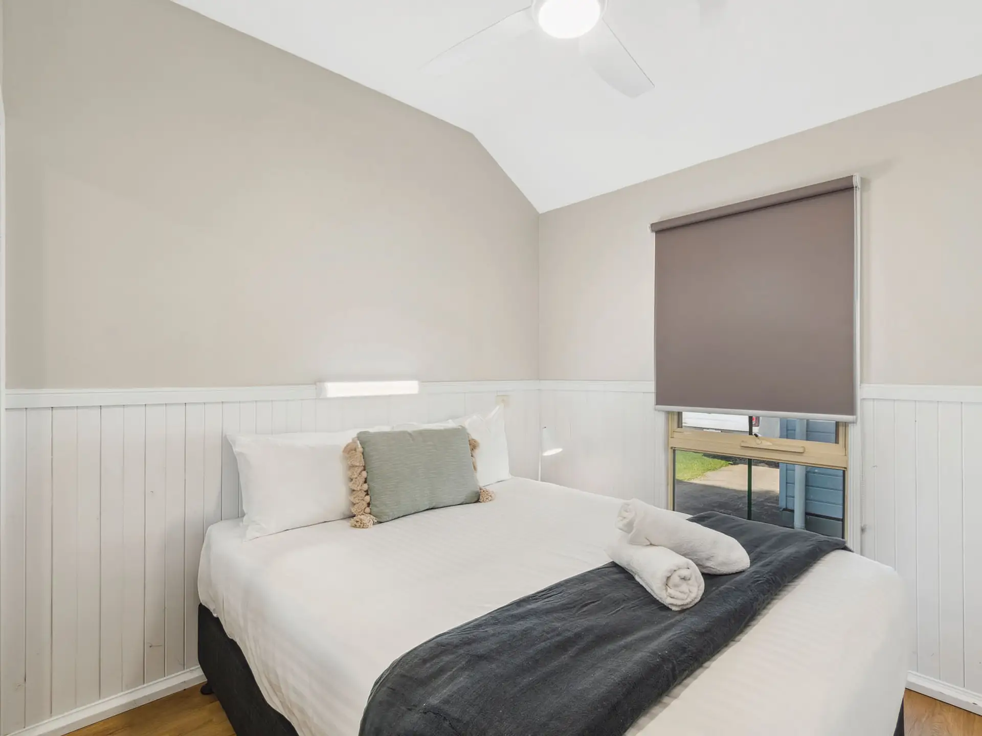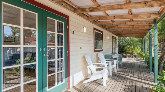 This three-bedroom cabin sleeps up to six with two queen beds and one bunk bed suited to children. It features a full kitchen, air conditioning, one bathroom, and a long verandah with outdoor seating. Located near the pool and tennis court, it’s a pet-friendly option for families wanting simple, self-contained comfort close to resort facilities.