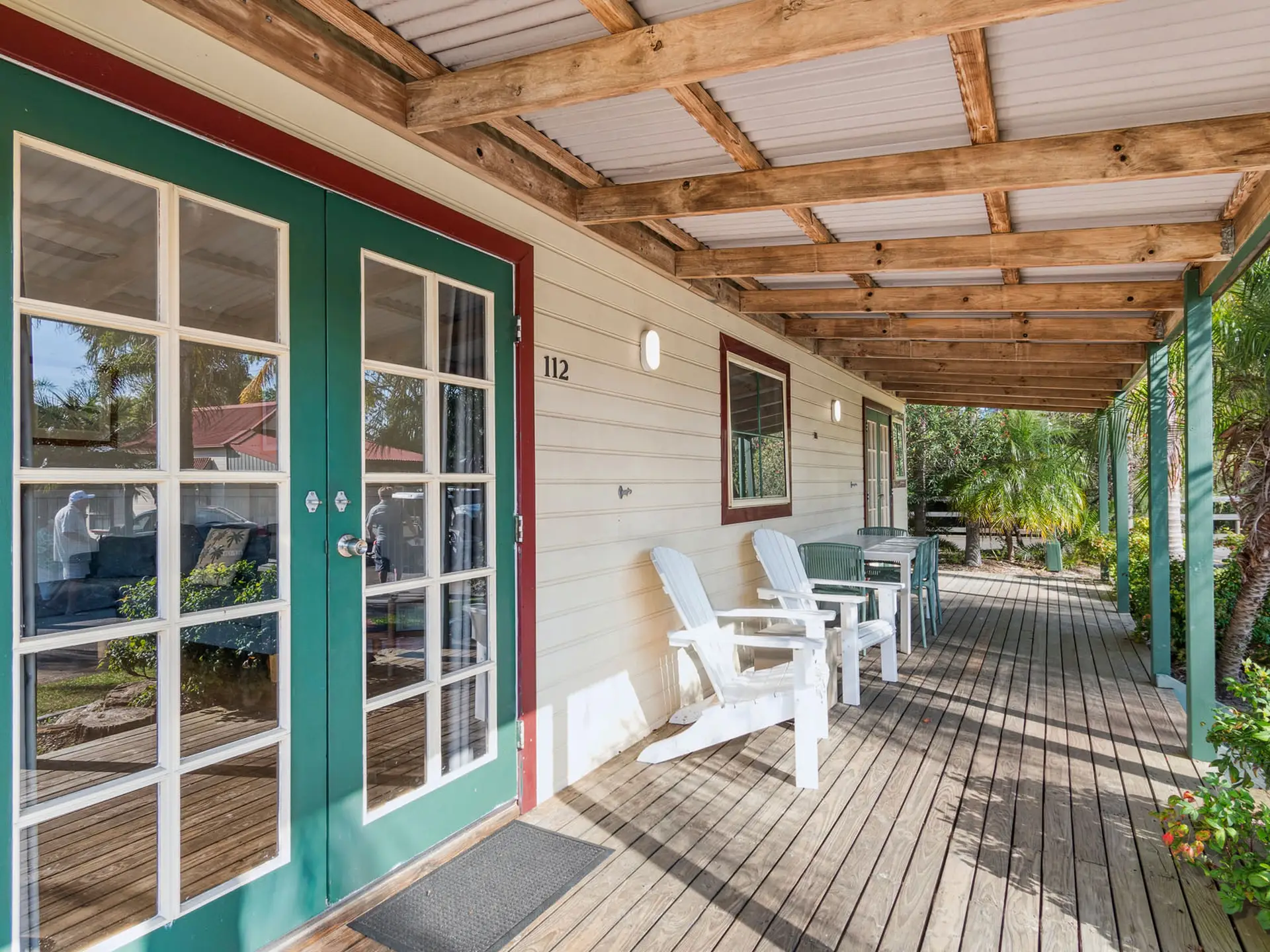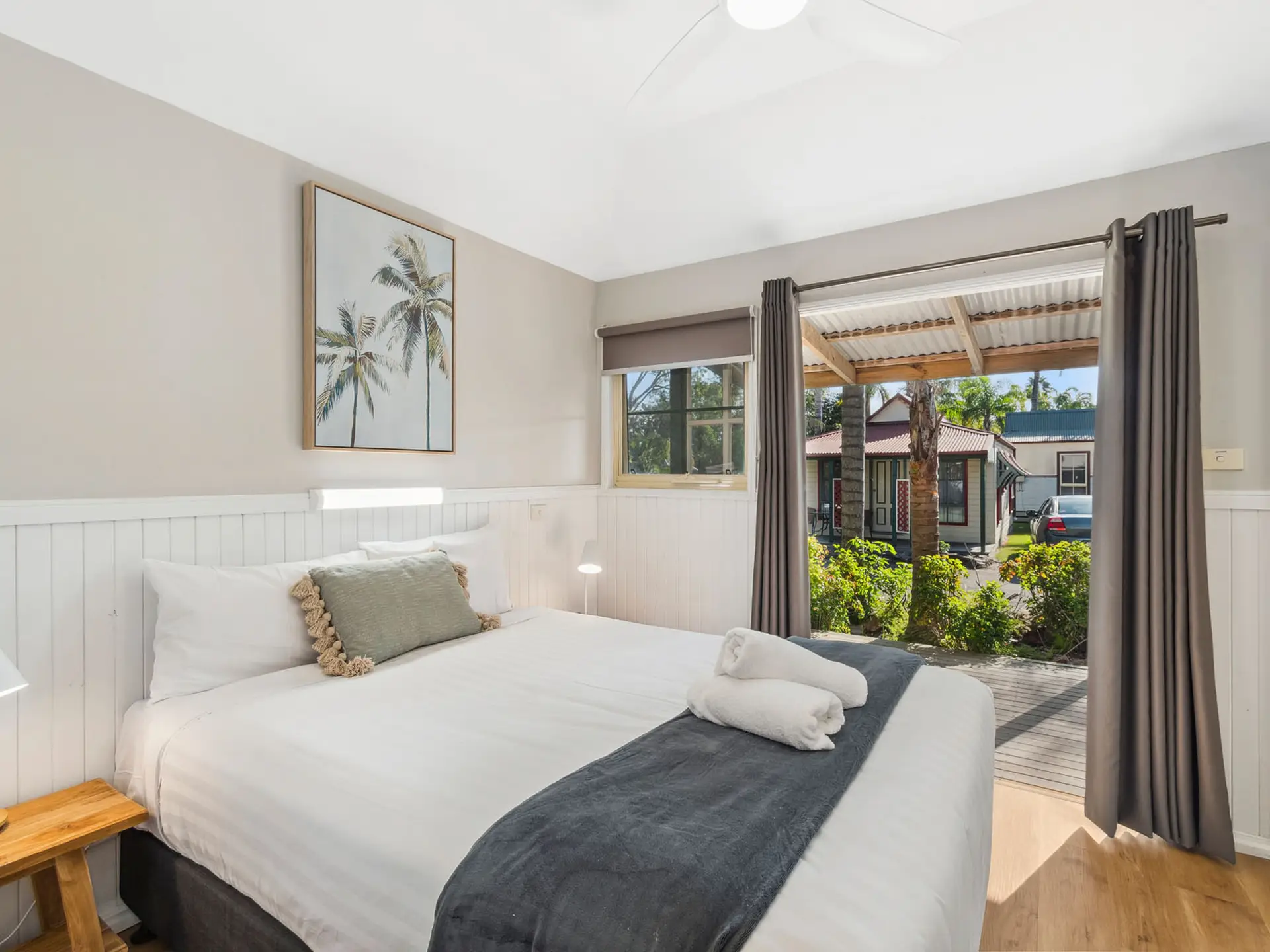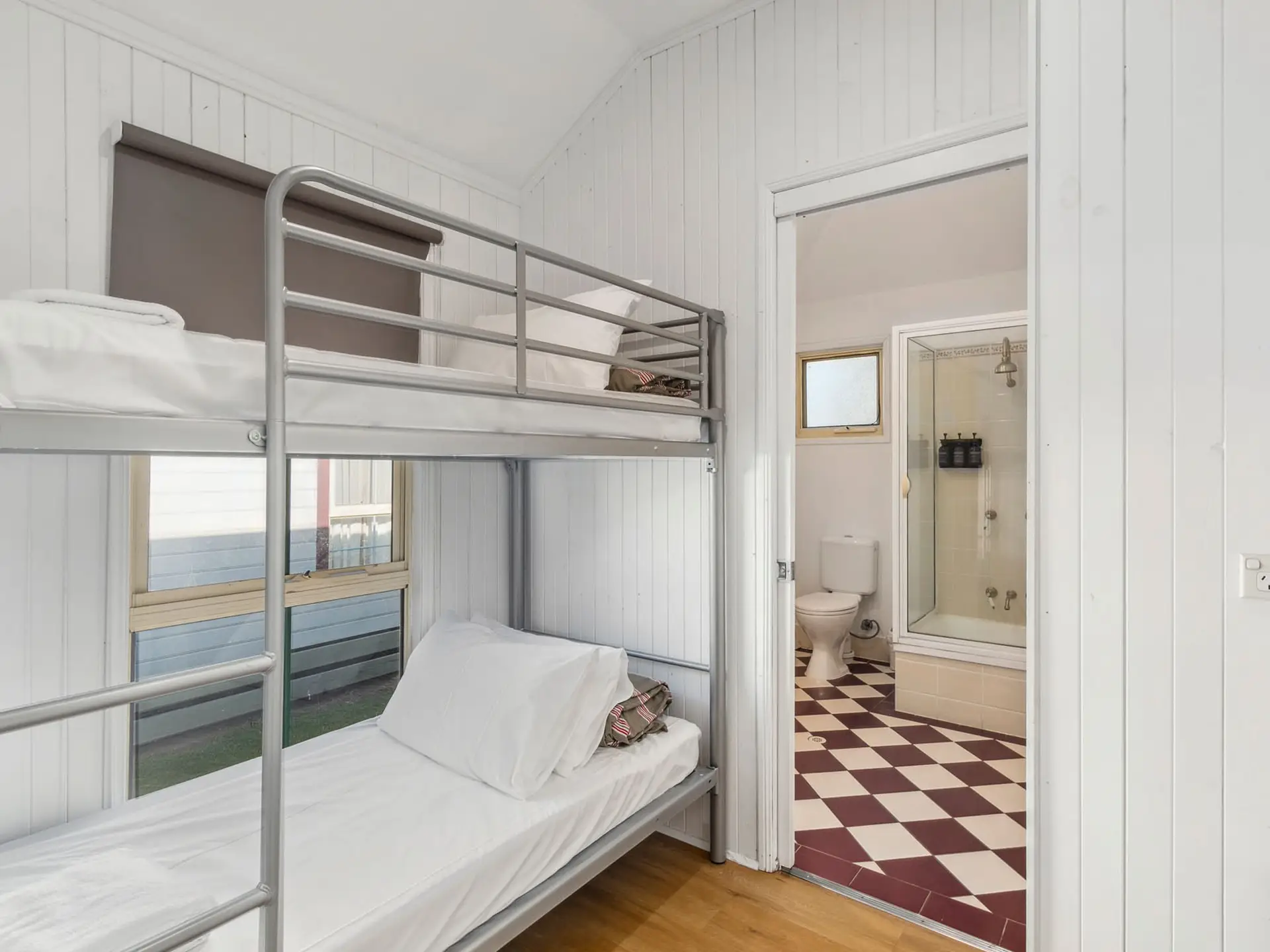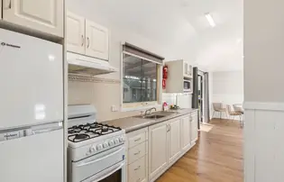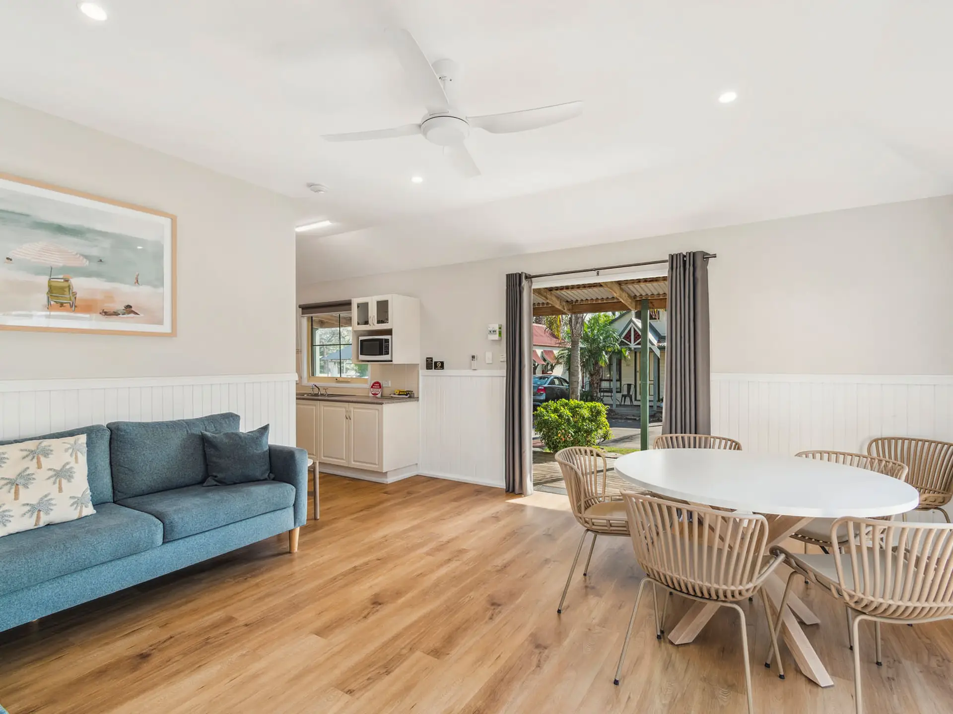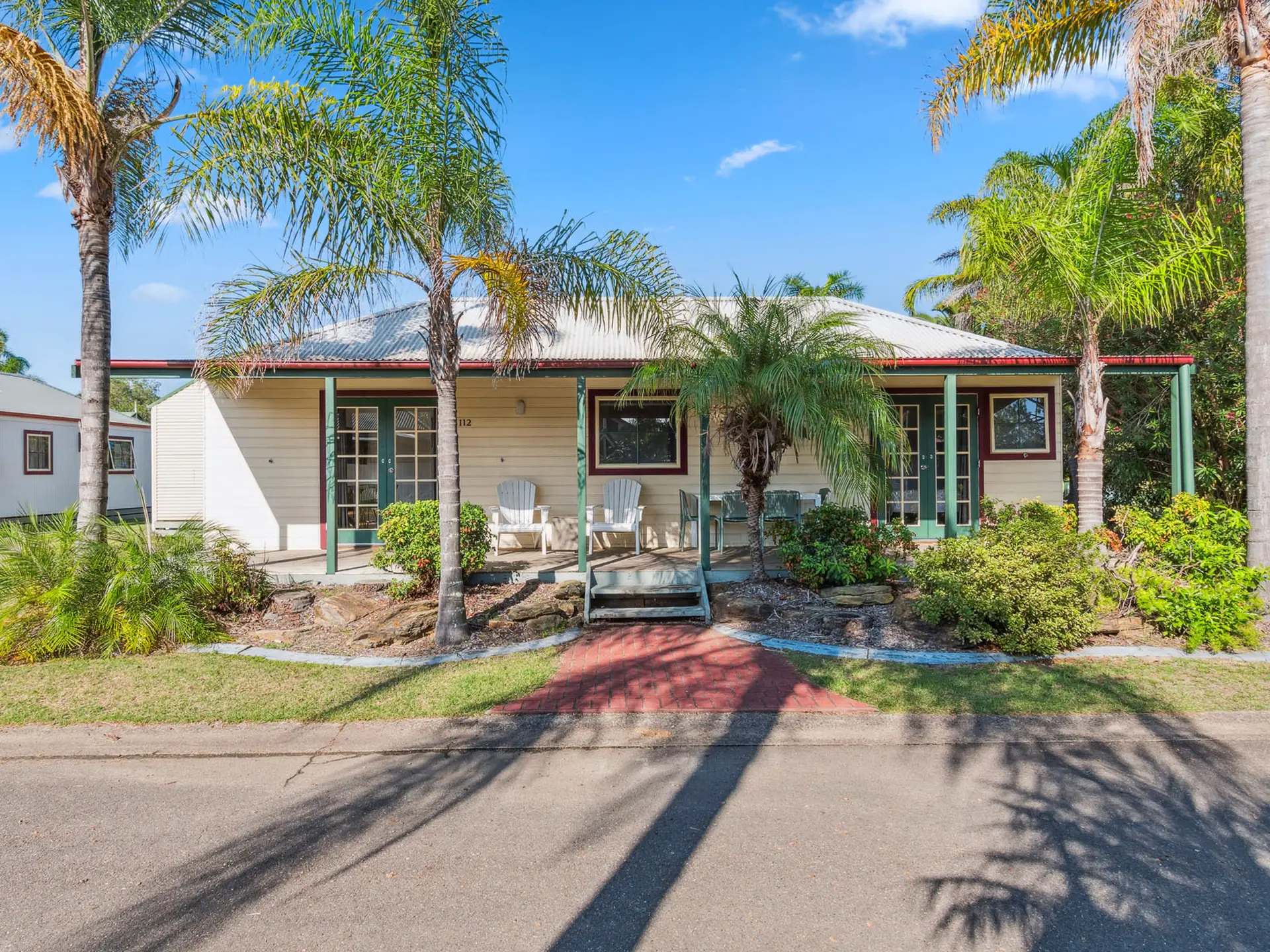 This three-bedroom cabin sleeps up to six with two queen beds and one bunk bed suited to children. It features a full kitchen, air conditioning, one bathroom, and a long verandah with outdoor seating. Located near the pool and tennis court, it’s a pet-friendly option for families wanting simple, self-contained comfort close to resort facilities.